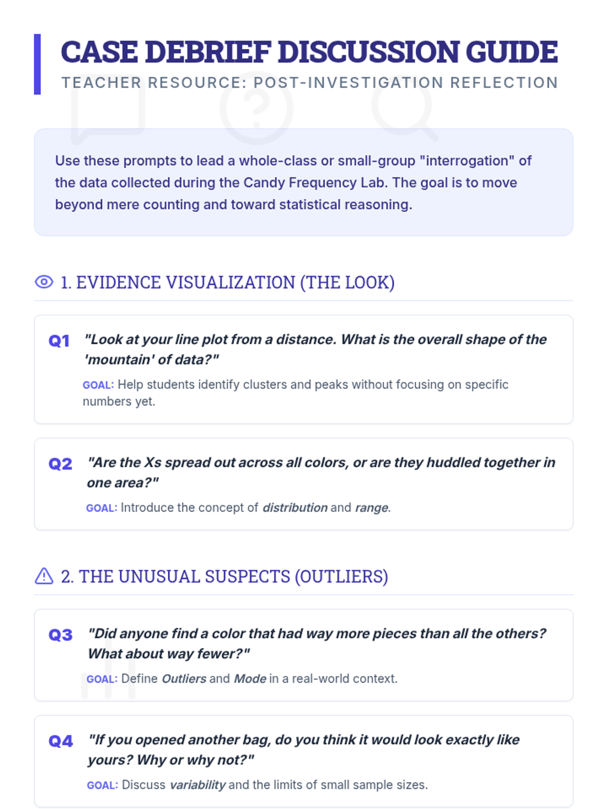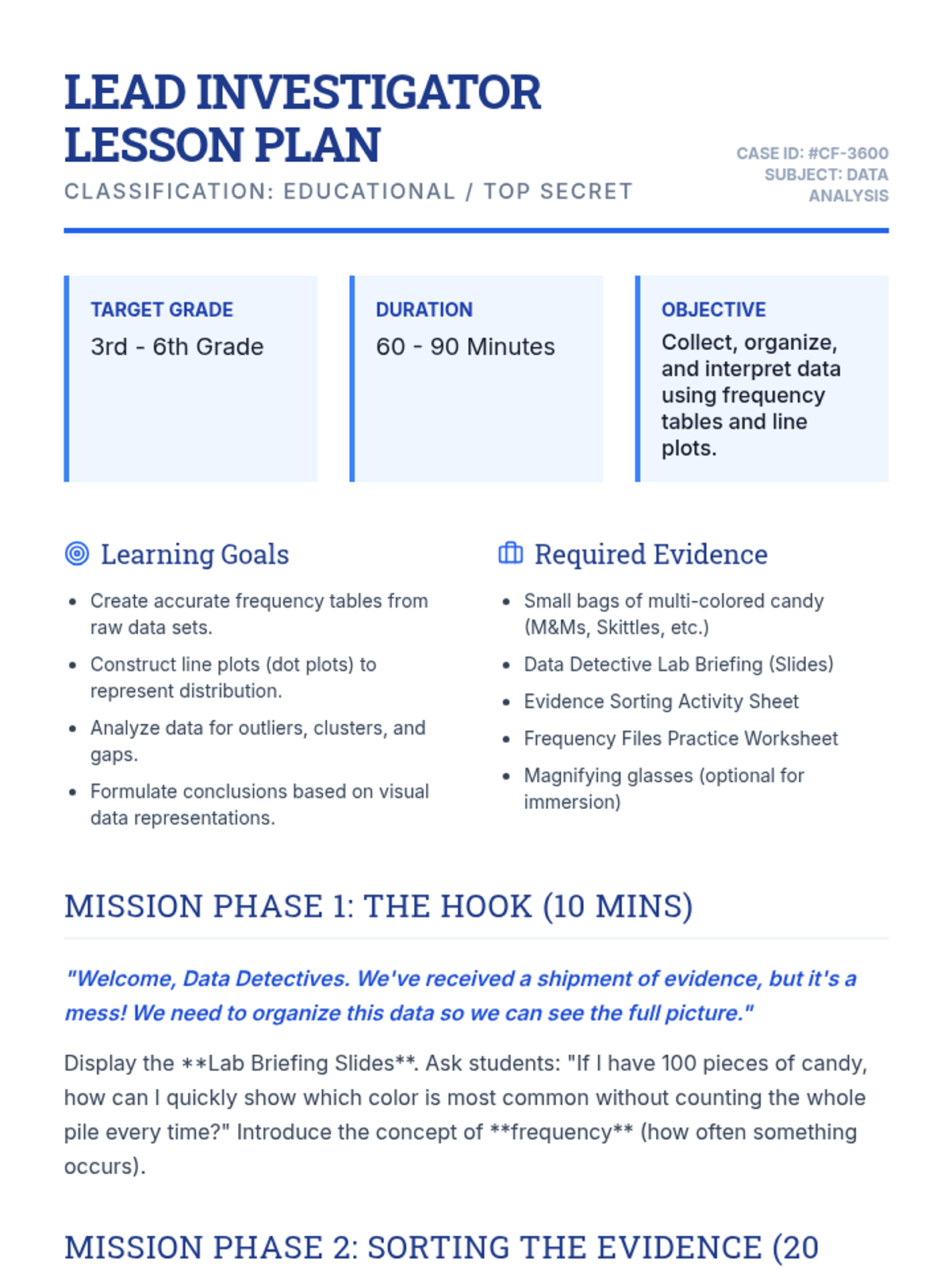 Students participate in a hands-on 'Candy Lab' to collect, organize, and interpret data using frequency tables and line plots. They identify patterns, outliers, and distributions in their candy sets.
