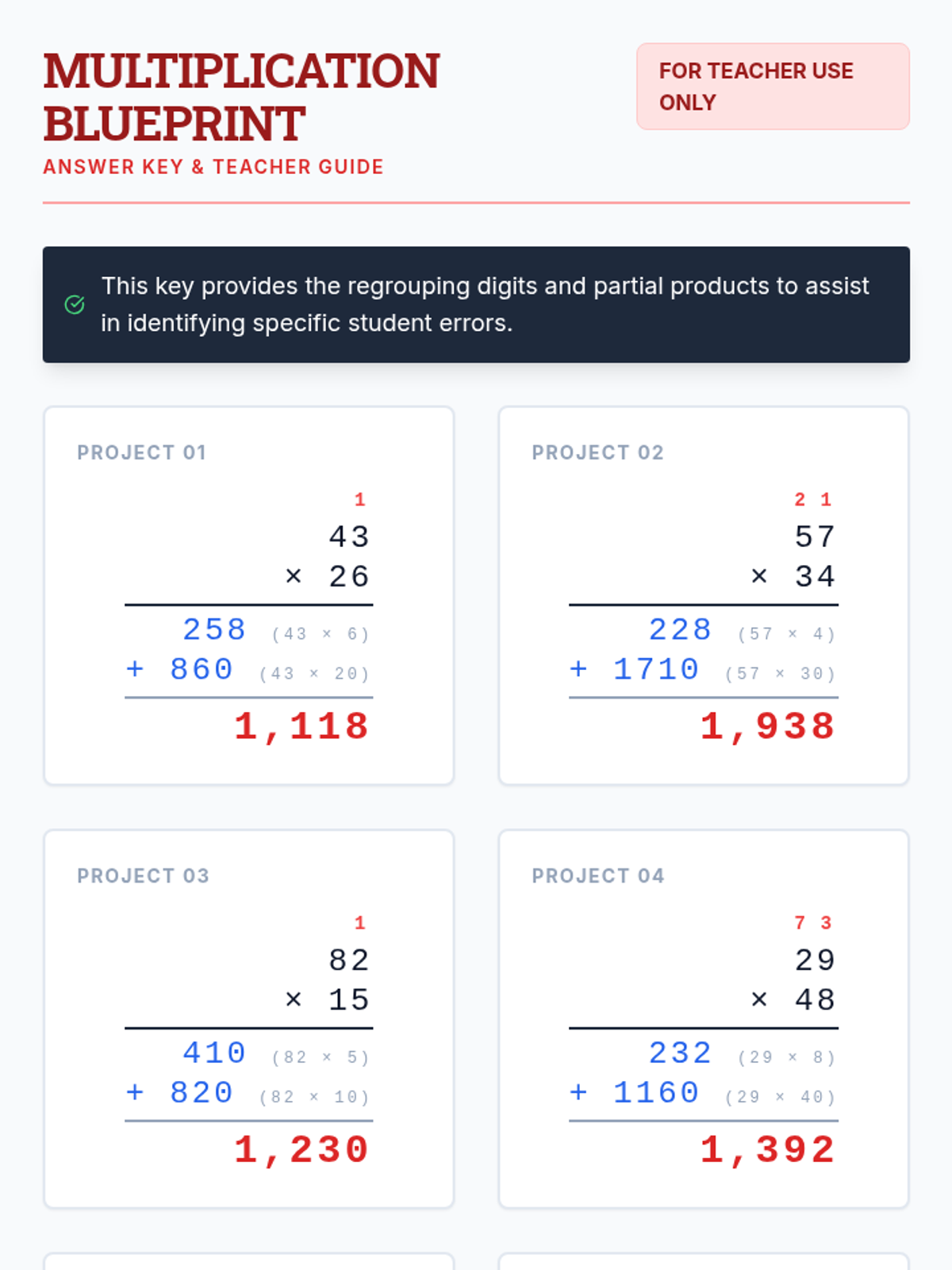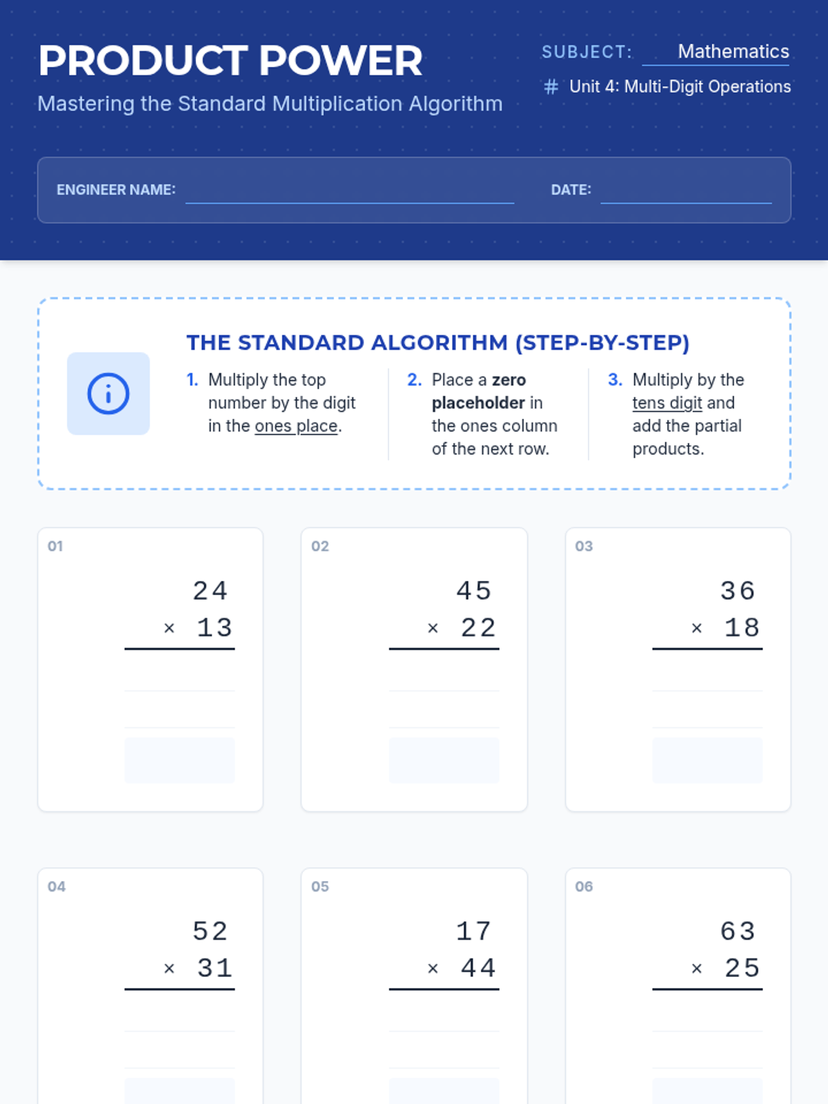A math lesson focused on double-digit multiplication using the standard US algorithm, featuring an engineering blueprint theme.