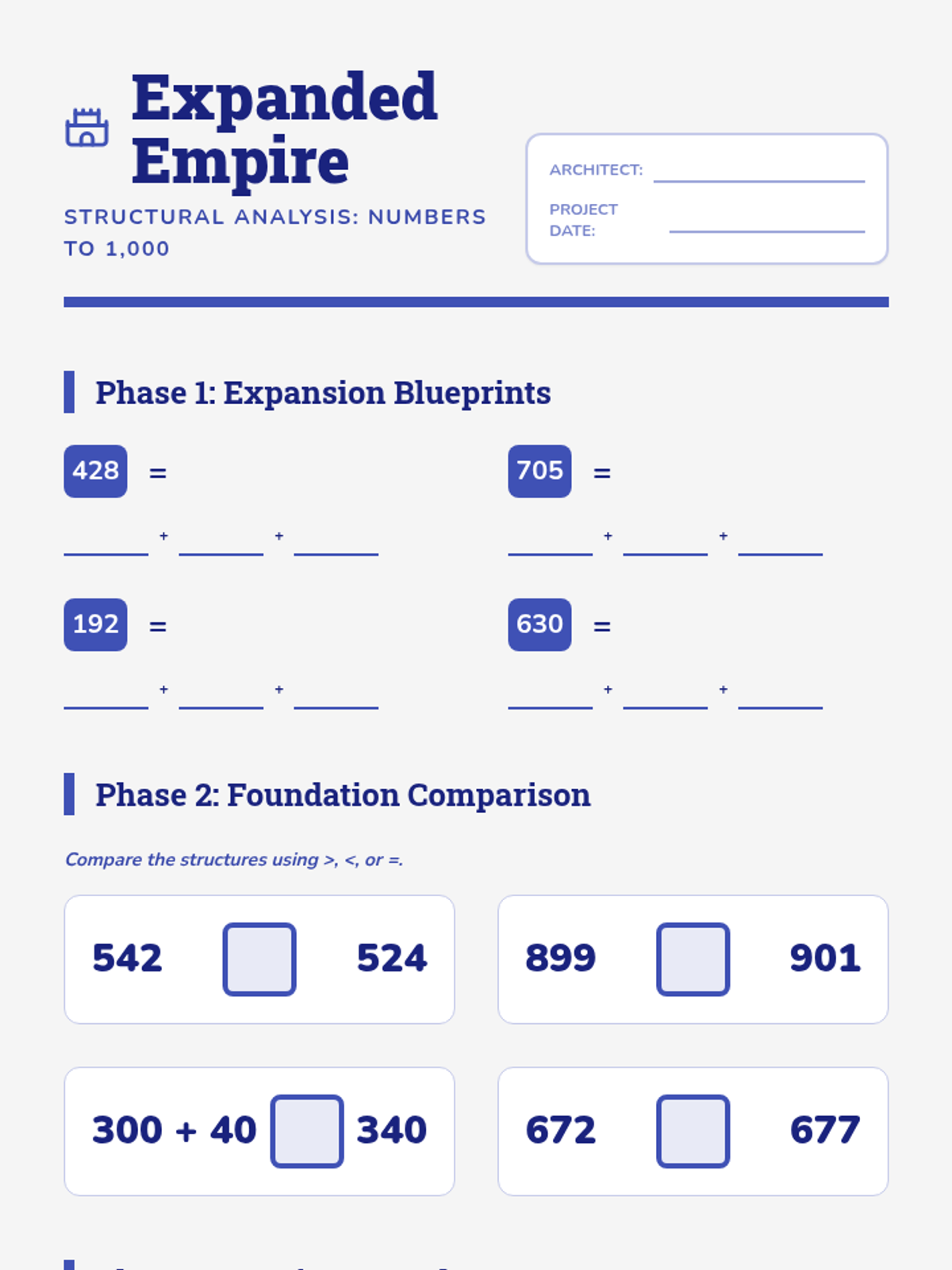 Expanding to three-digit numbers up to 1,000, introducing expanded form and more complex comparison strategies.