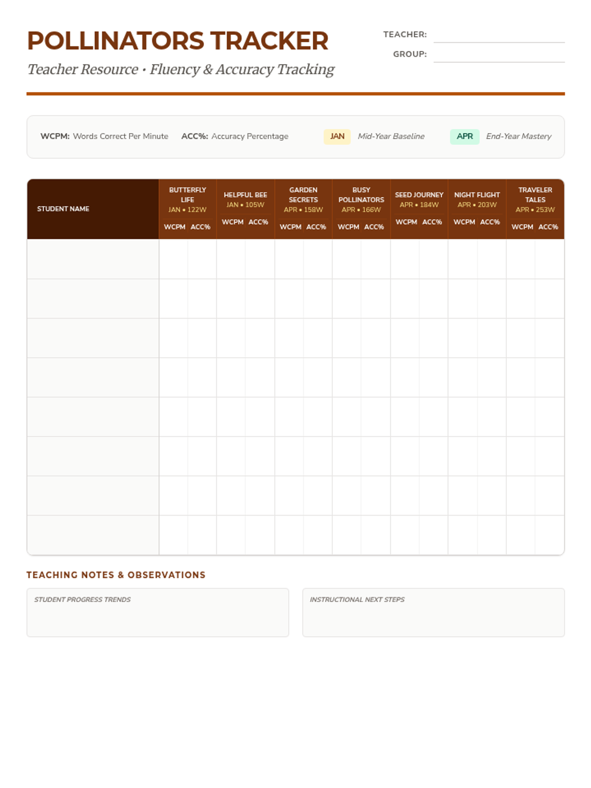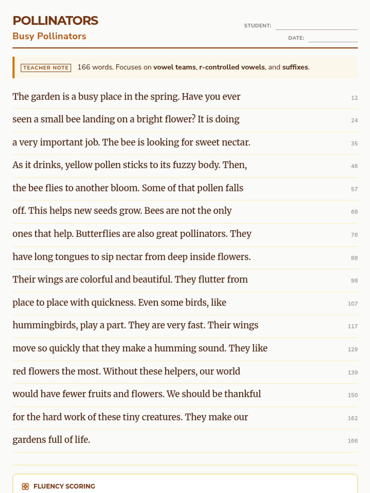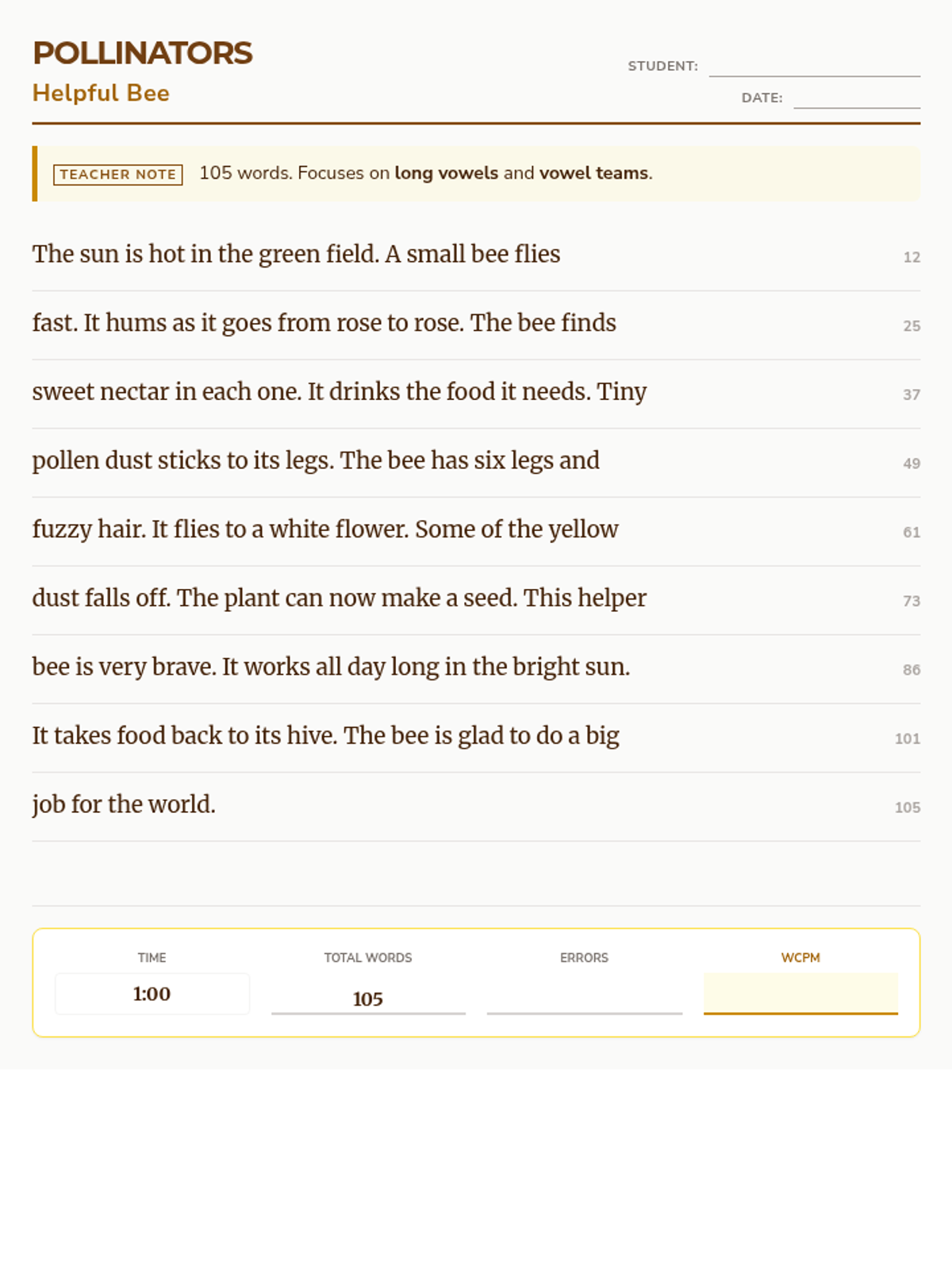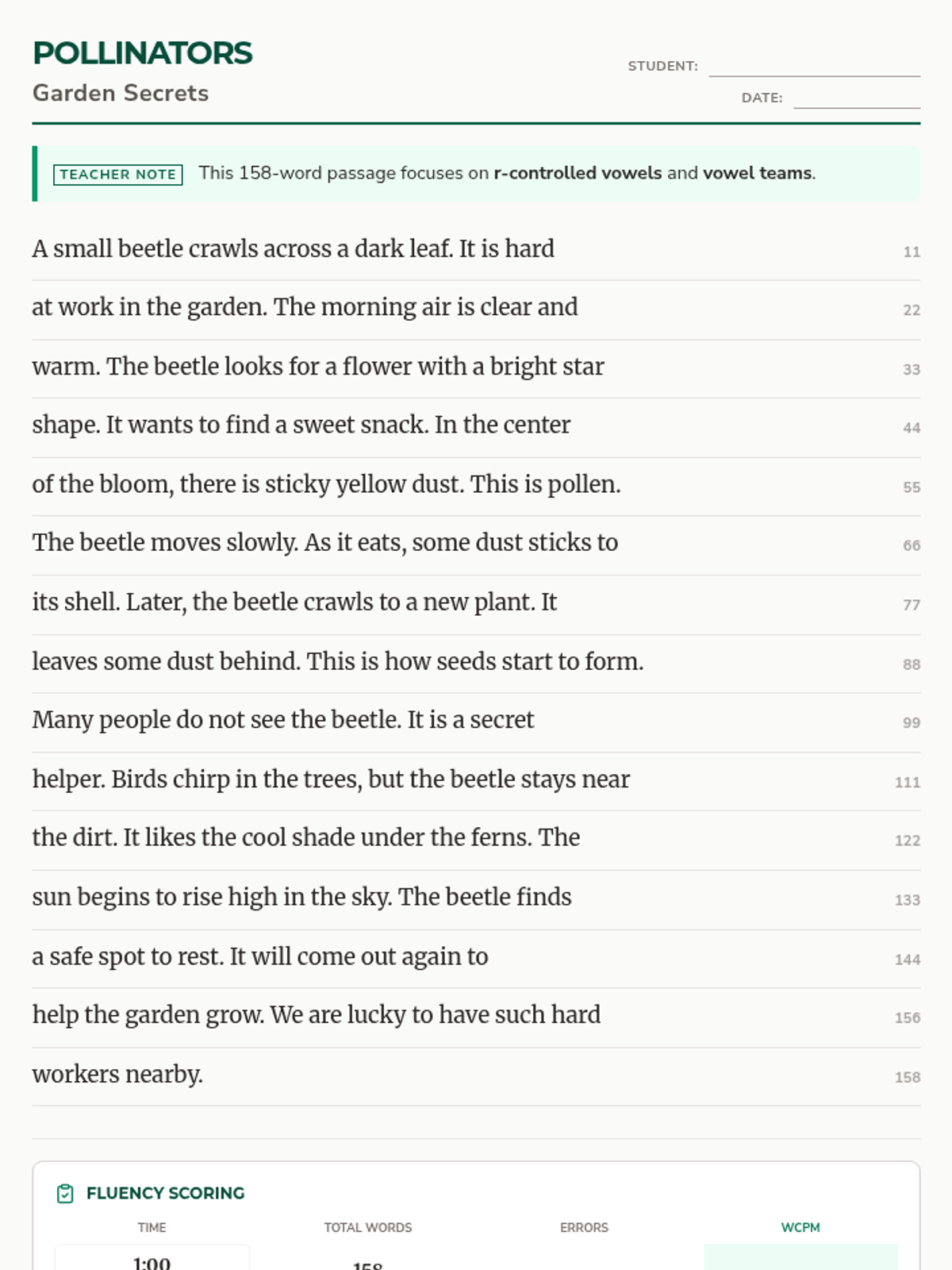A collection of decodable reading passages for Grade 2 students focusing on the role of pollinators in nature, aligned with EL Education Module 3. Includes tracking tools for fluency assessment.