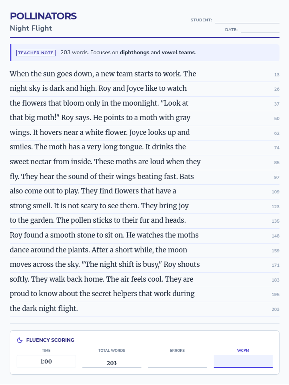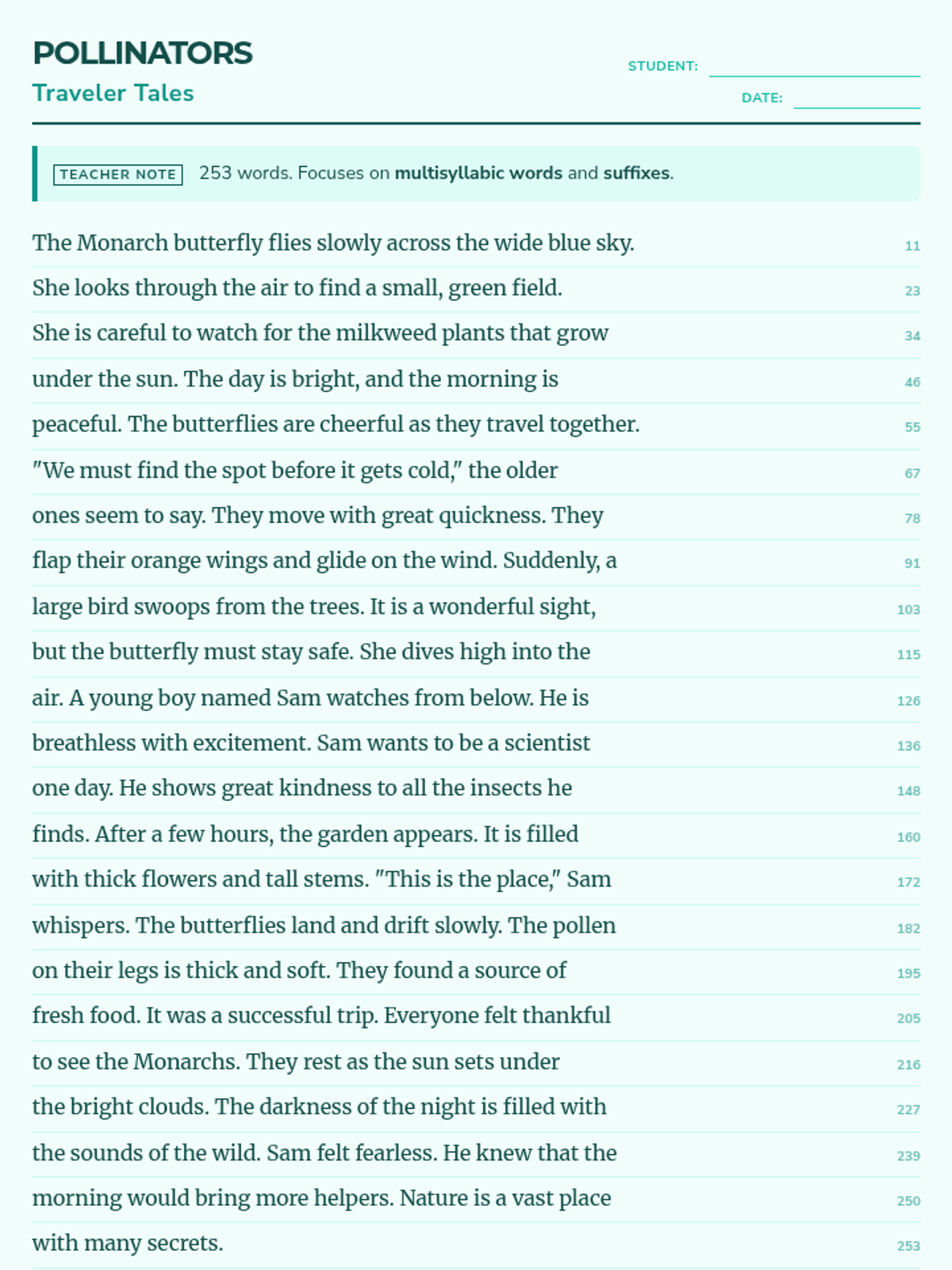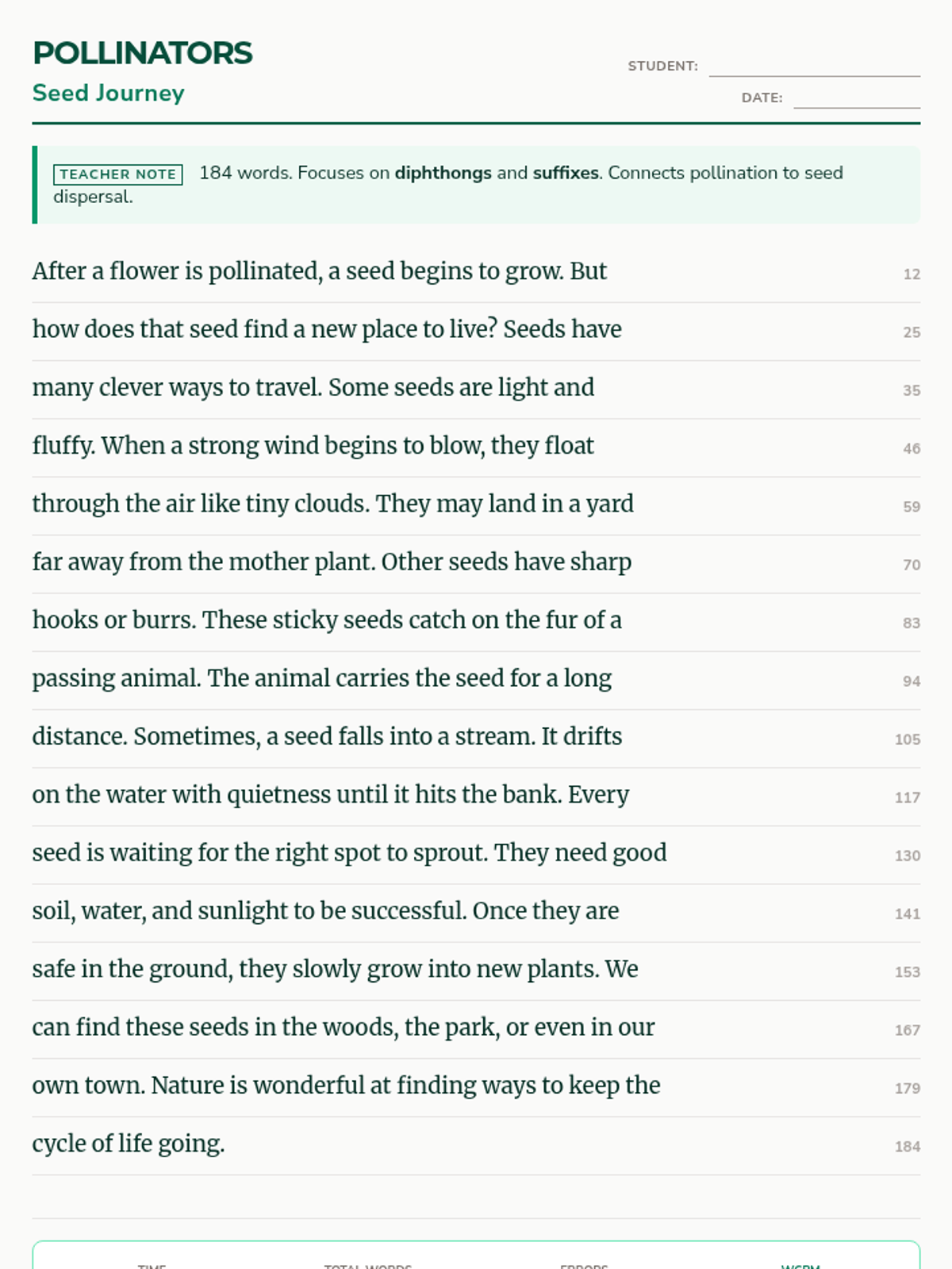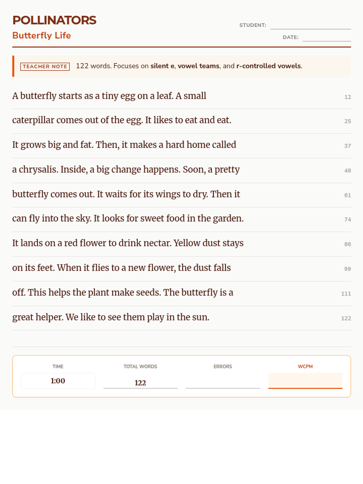 A collection of decodable reading passages for Grade 2 students focusing on the role of pollinators in nature, aligned with EL Education Module 3. Includes tracking tools for fluency assessment.