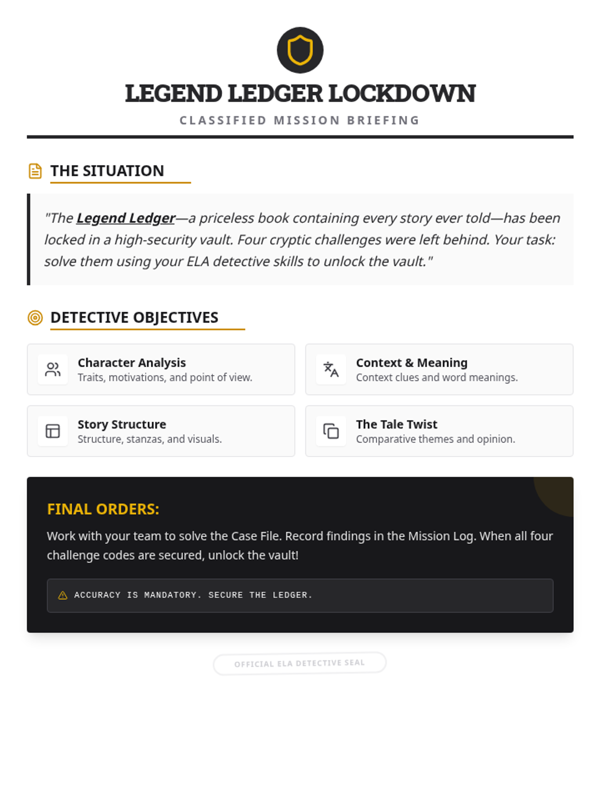 A detective-themed ELA test prep escape room where students solve challenges based on 3rd grade reading and writing standards to unlock the library's lost ledger.