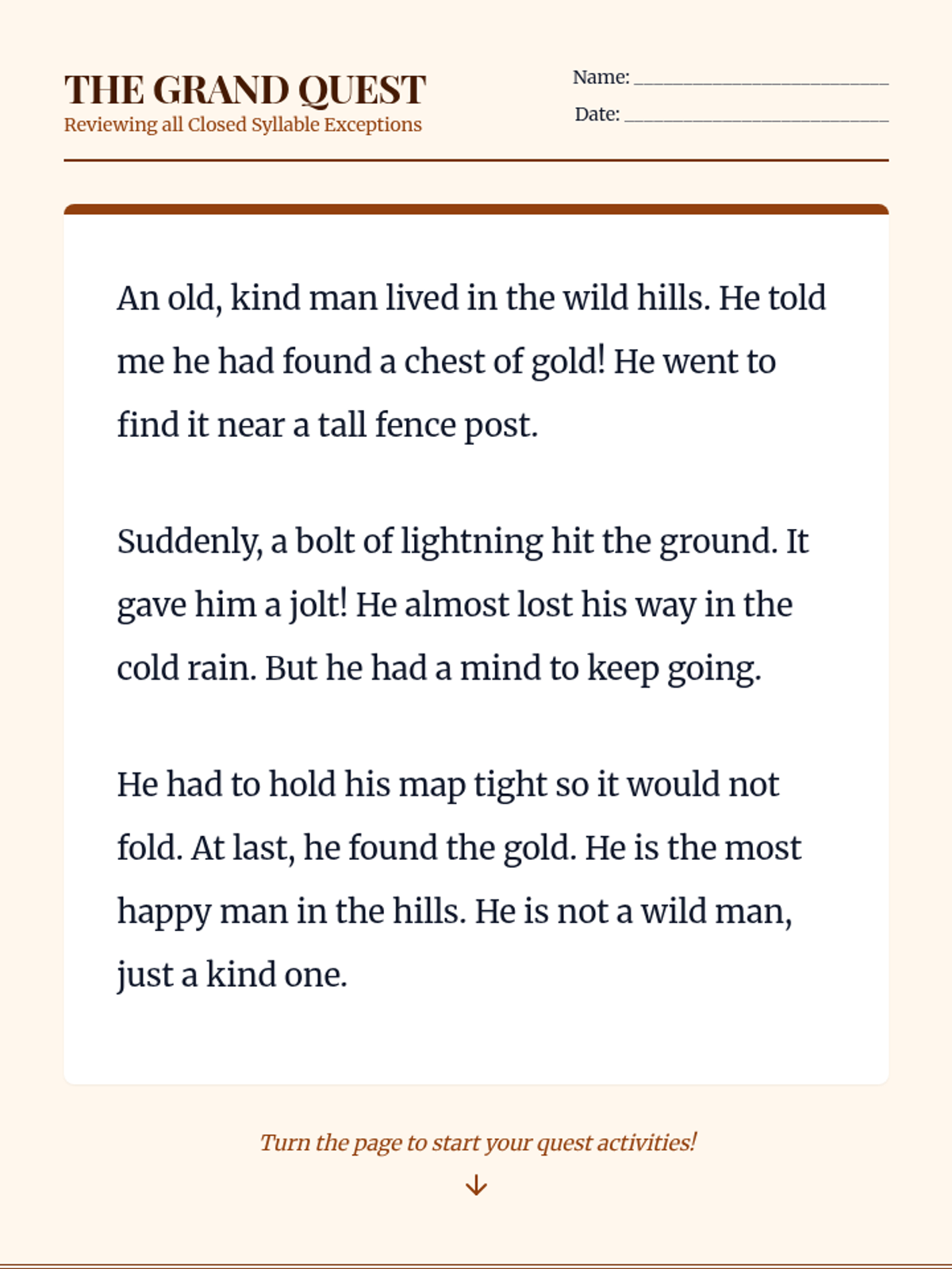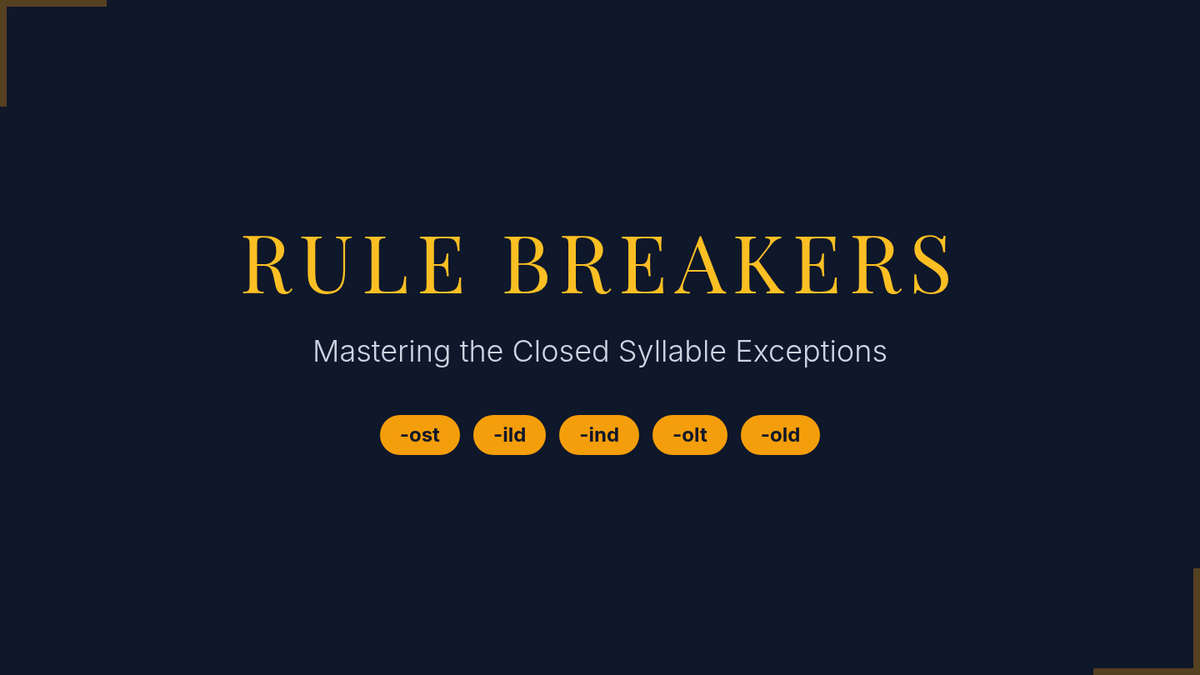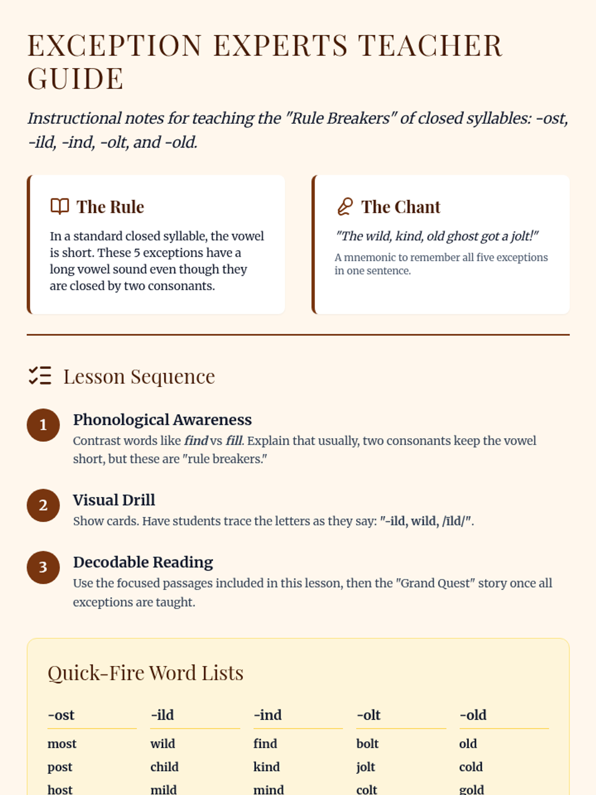 A focused lesson on closed syllable exceptions (-ost, -ild, -ind, -olt, -old), featuring decodable passages, instructional slides, and teacher support materials designed for grades 1-3.