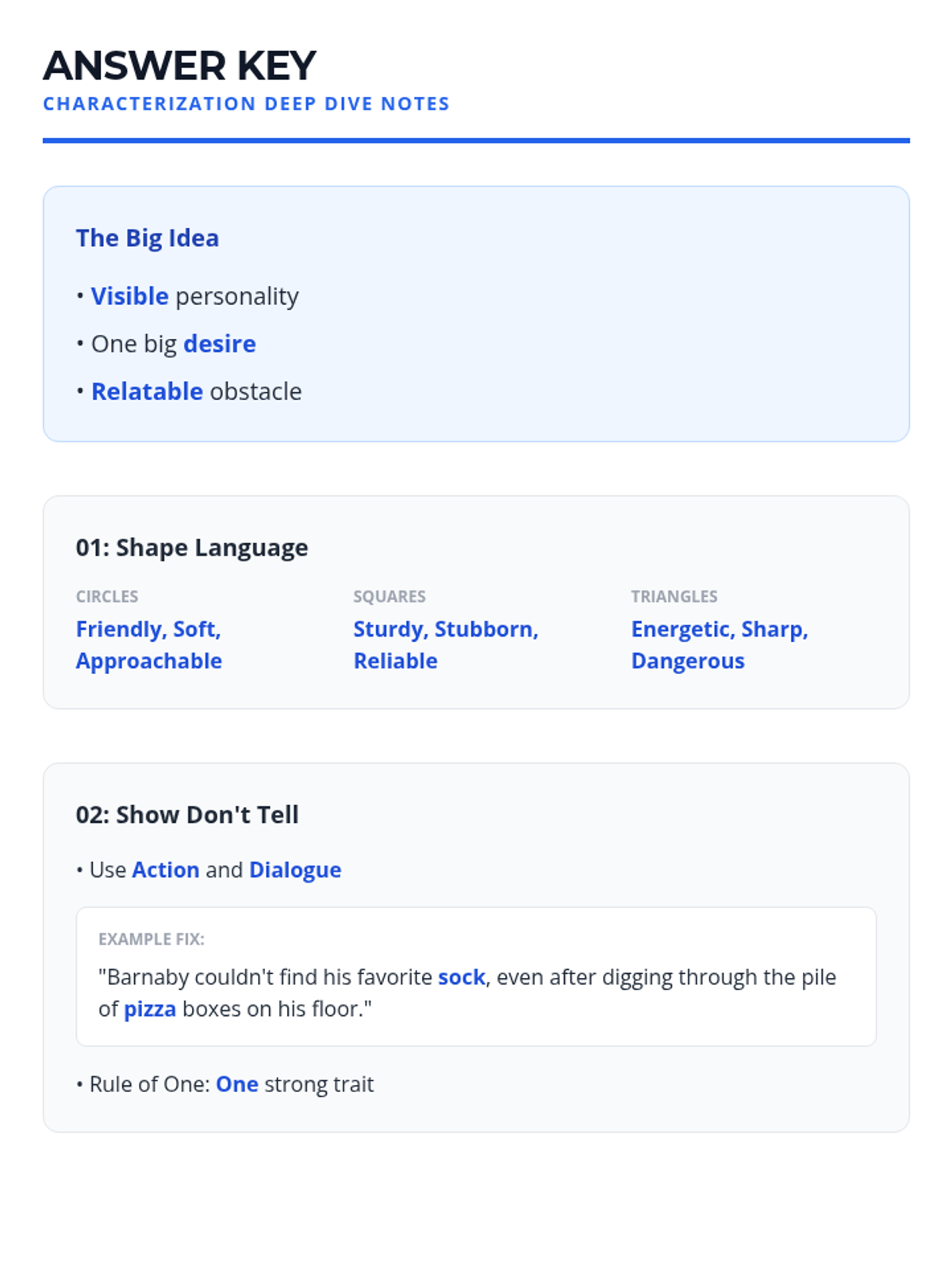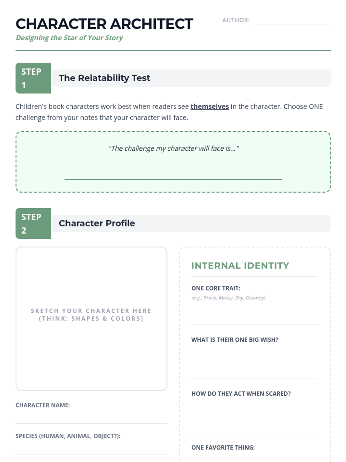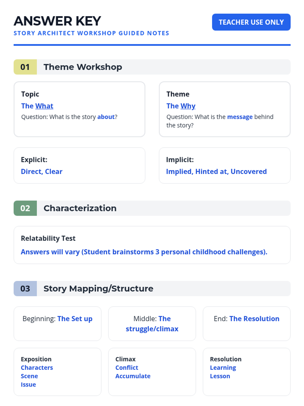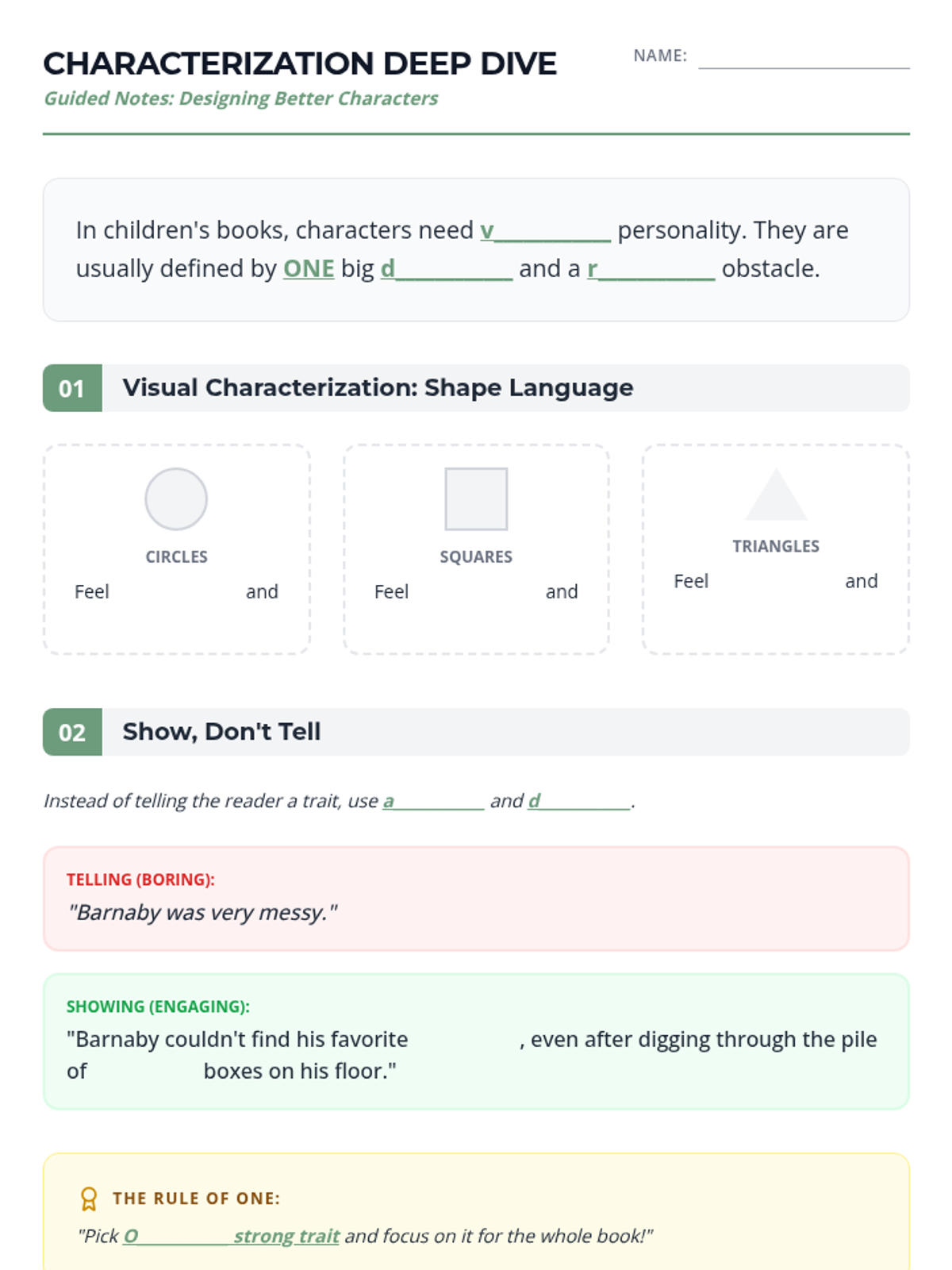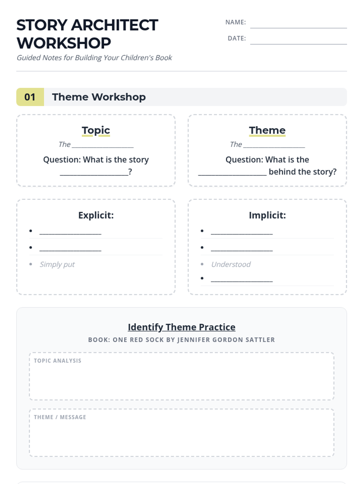 A comprehensive set of guided notes and materials based on the 'Building Your Children Book' workshop slides, covering theme, characterization, story structure, and sentence syntax.