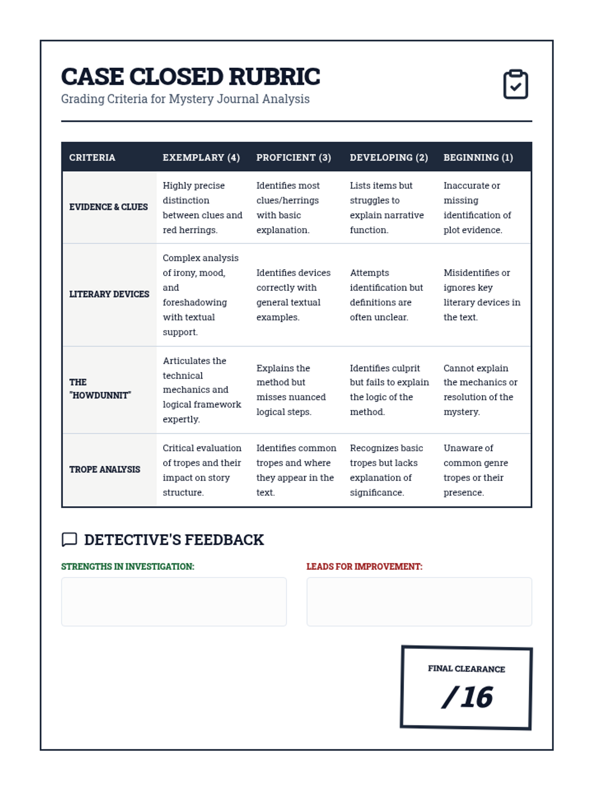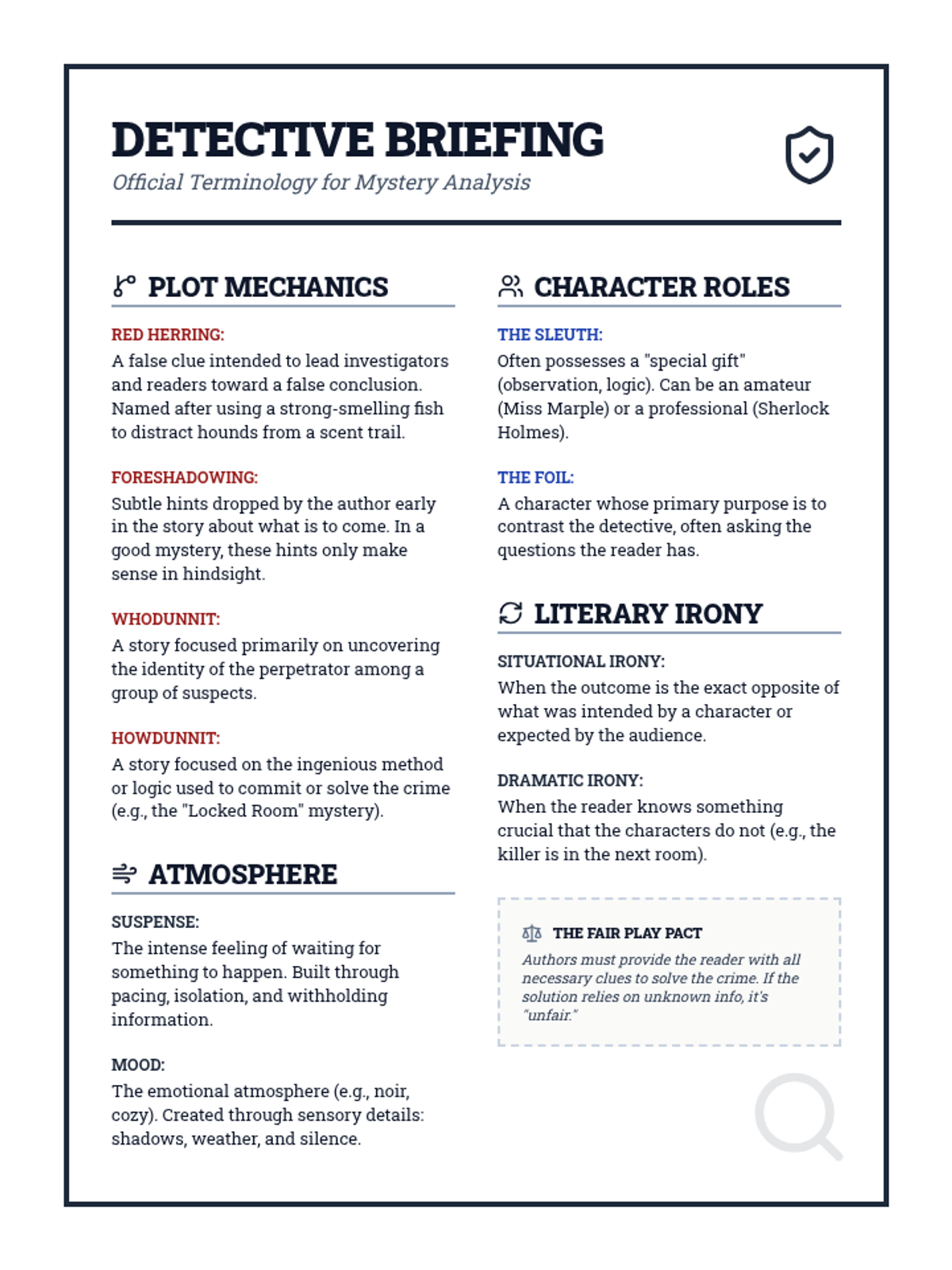 A comprehensive set of tools for students to analyze mystery novels, focusing on character archetypes, plot devices, and atmospheric elements.