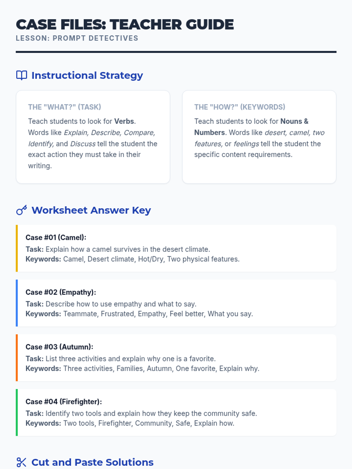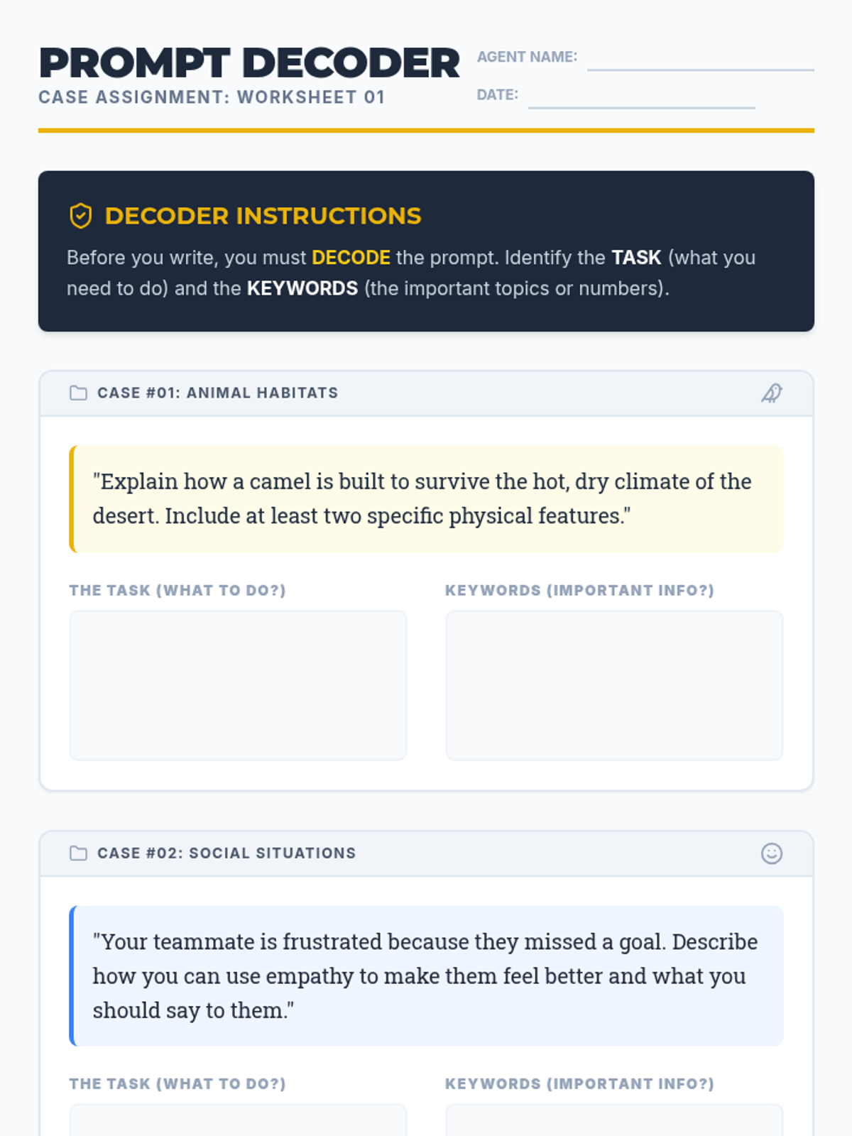 A lesson focused on 'decoding' writing prompts by identifying the core task and highlighting essential keywords across diverse topics like animal habitats and social-emotional learning.