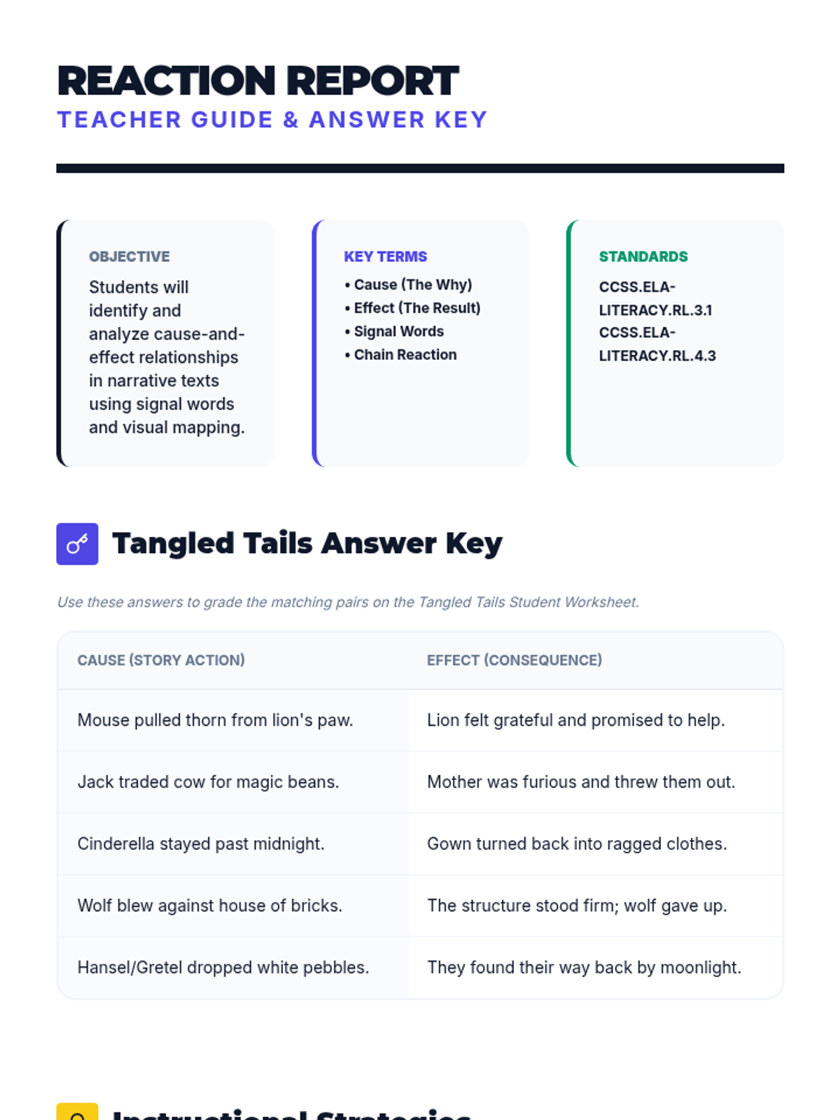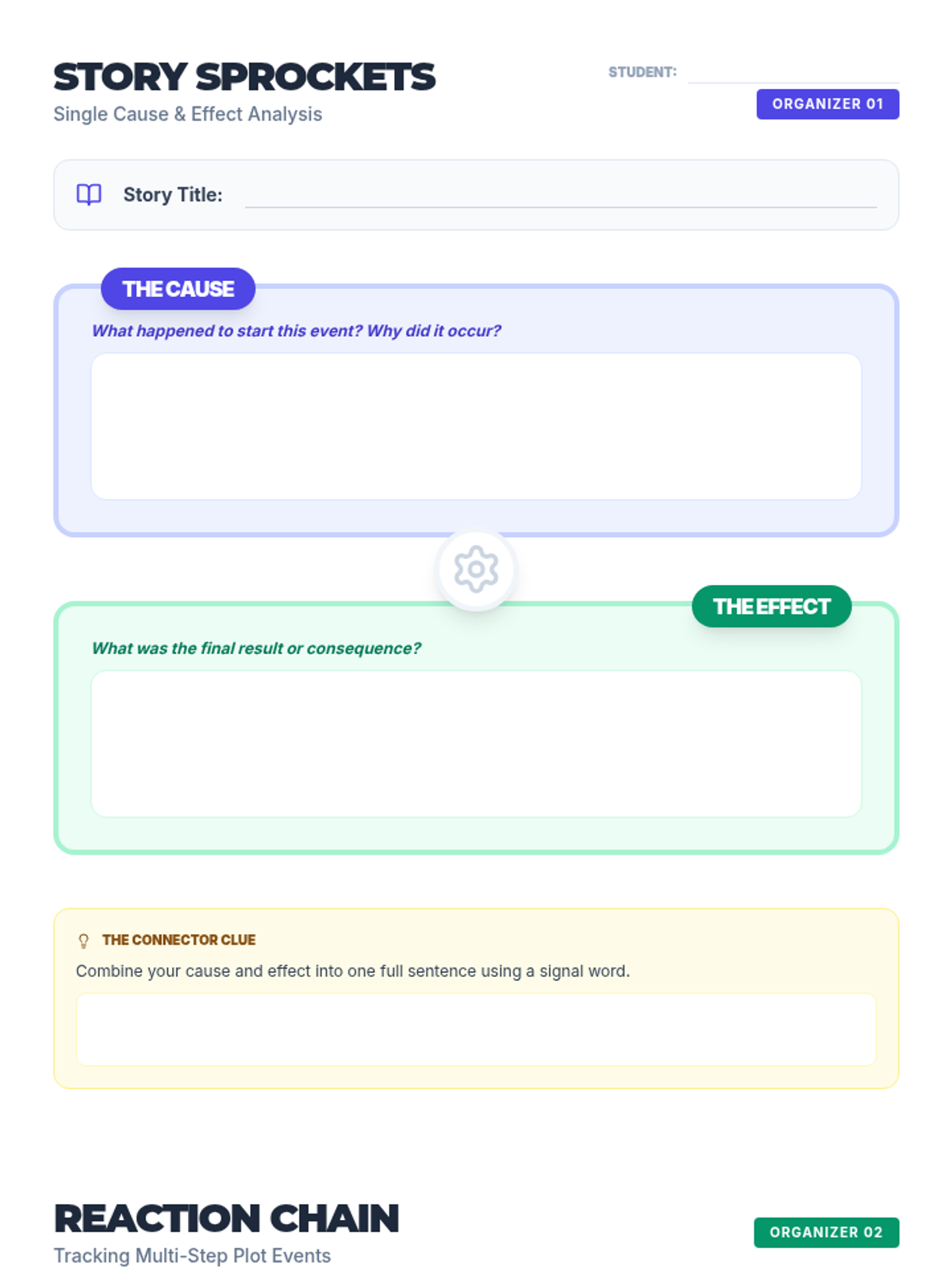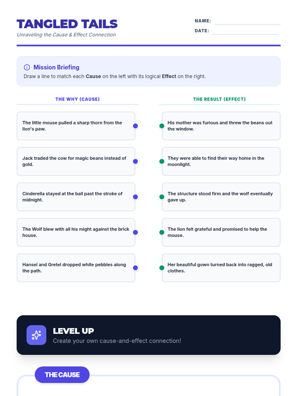 A lesson introducing the concept of cause and effect within narrative structures, focusing on how events trigger one another to drive a plot forward.