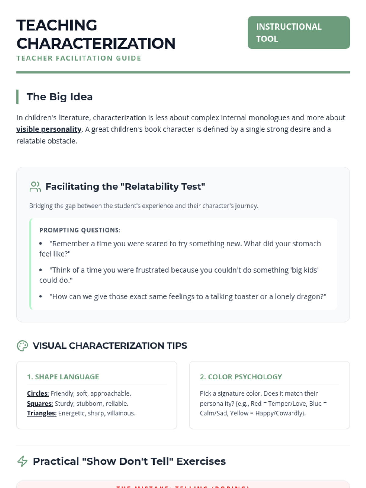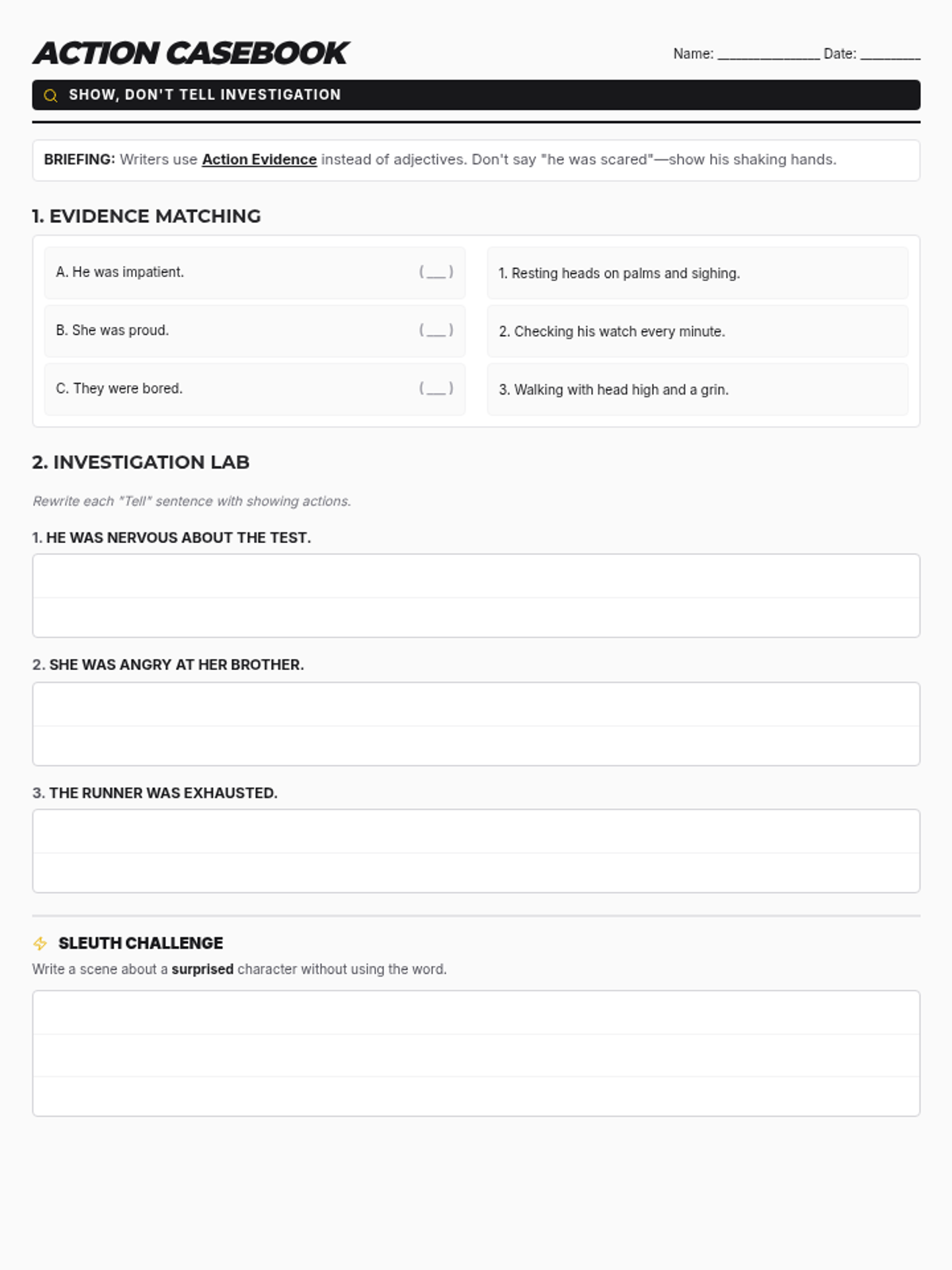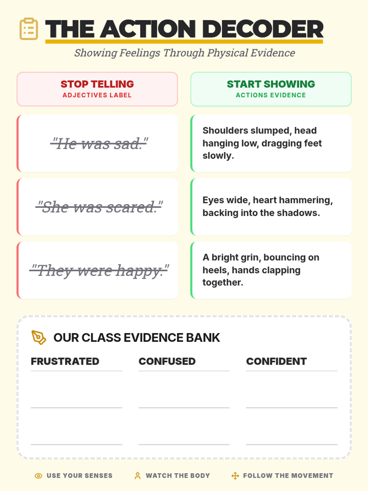 A mini-lesson focused on replacing 'telling' adjectives with 'showing' character actions to create more vivid and engaging narrative writing. Students will learn to use physical behaviors as evidence of internal emotions and traits.