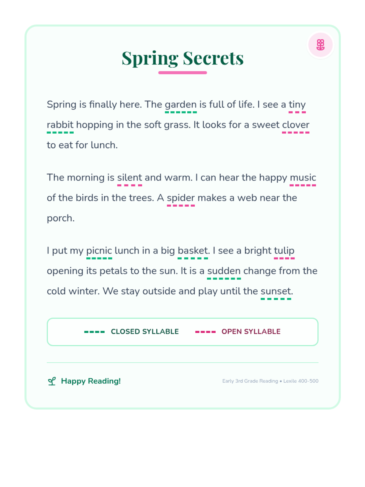 A collection of resources focused on decoding open and closed multisyllabic words through a spring-themed reading passage, designed for early 3rd-grade students.