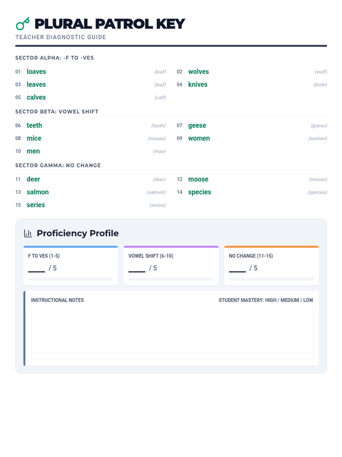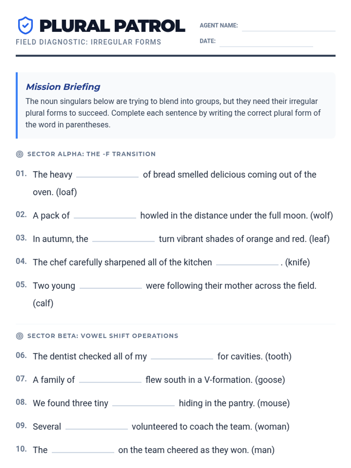 A quick diagnostic assessment to identify student mastery of irregular plural noun forms including vowel shifts, -f to -ves endings, and nouns with no change.