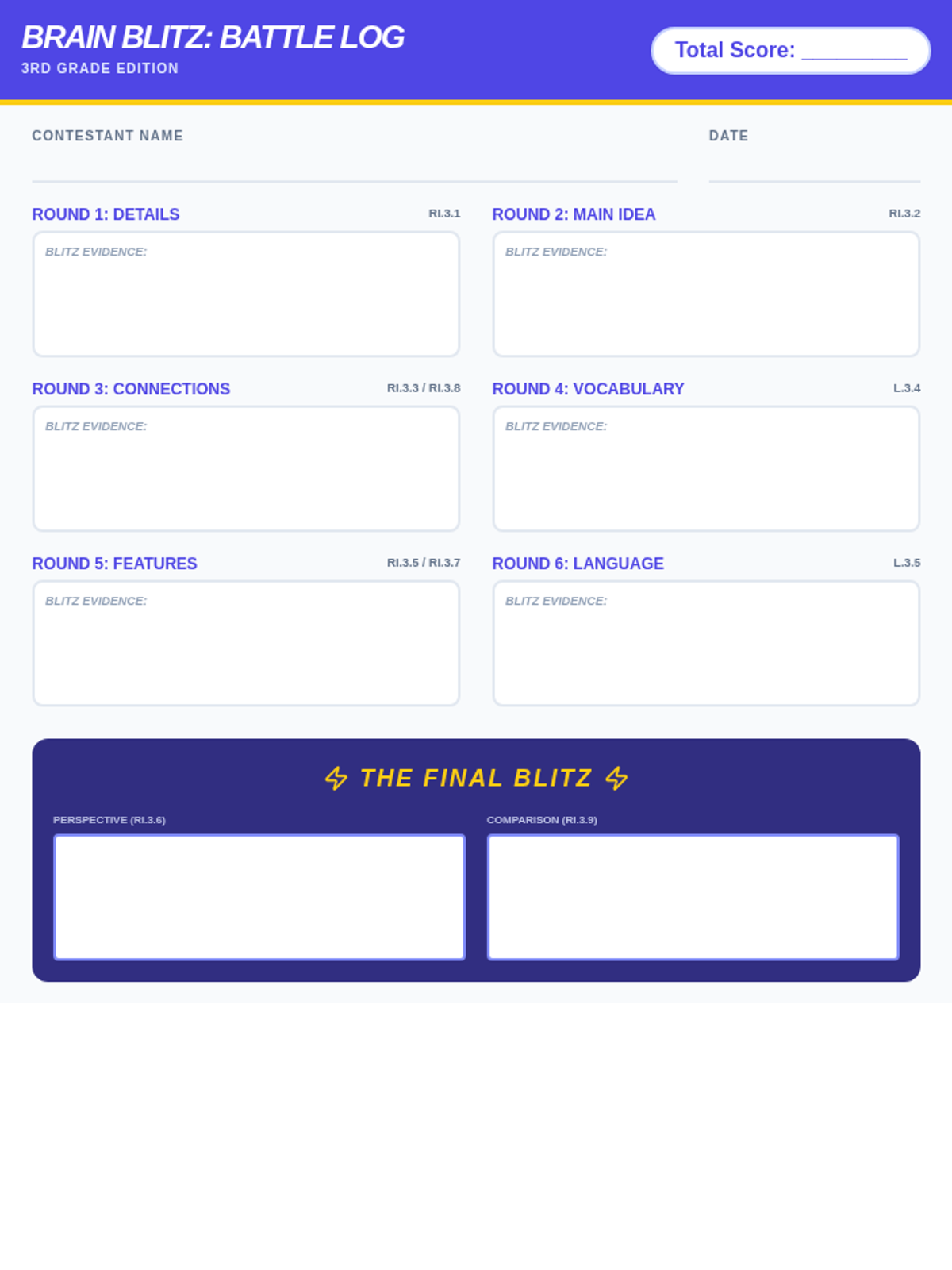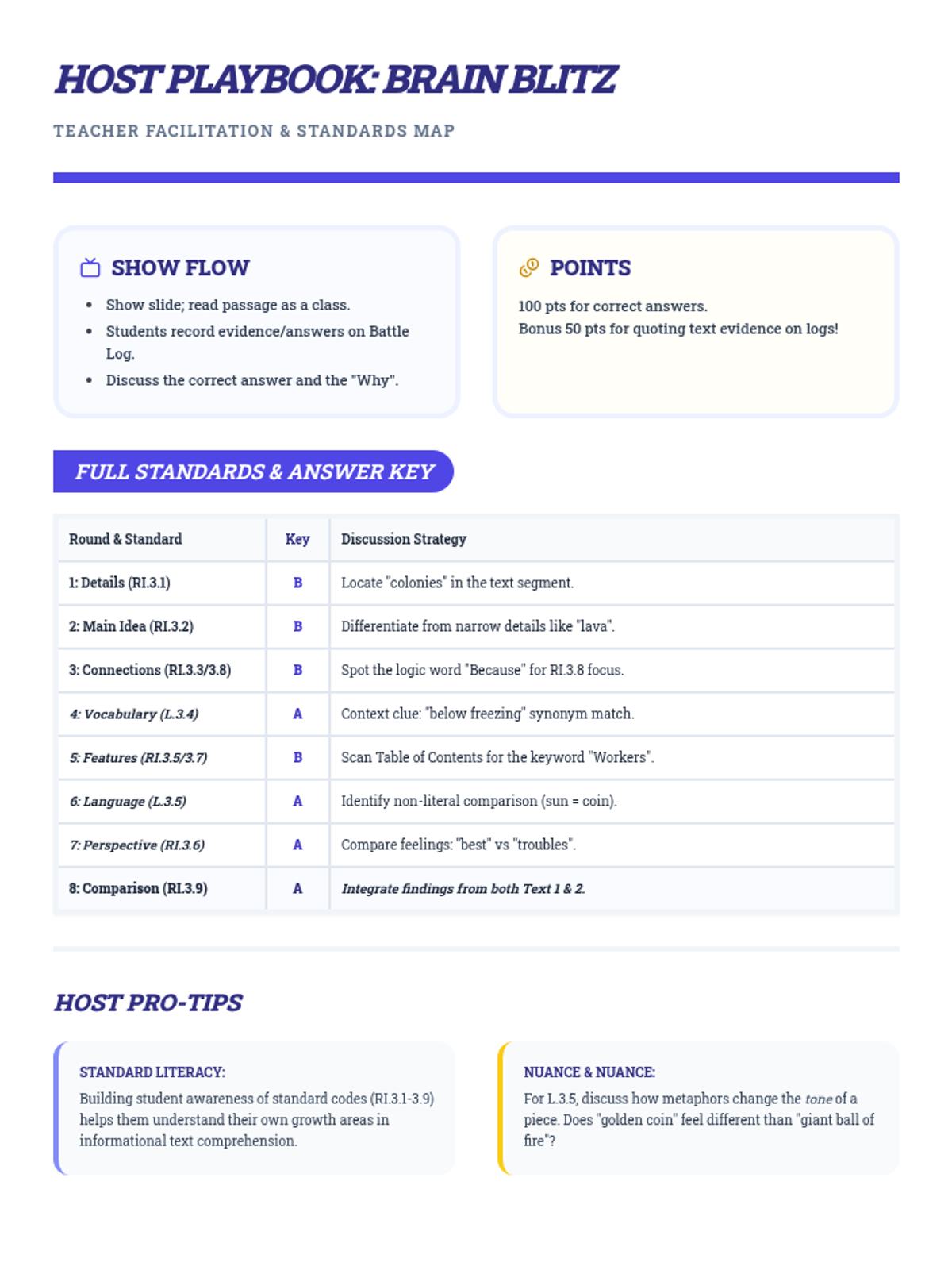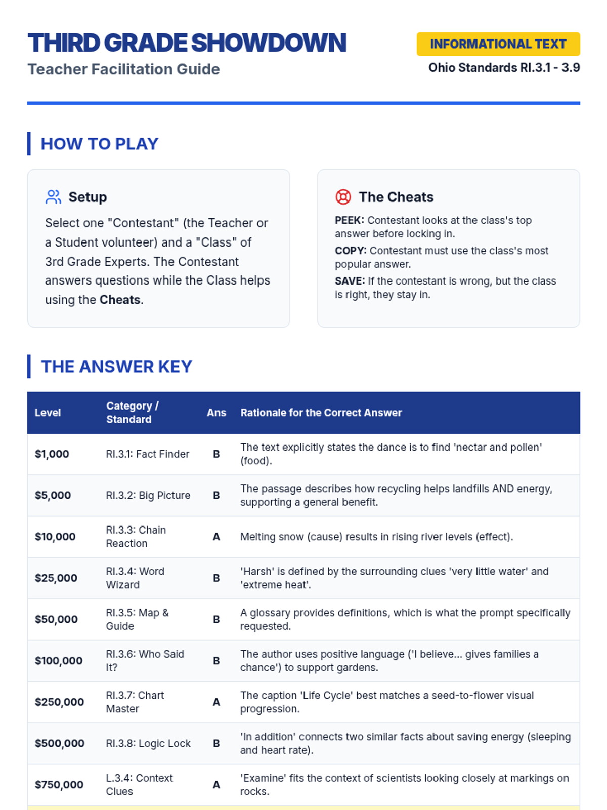 A high-energy, game-show style lesson where students test their knowledge of 3rd-grade informational text and language standards through animal science and nature topics.