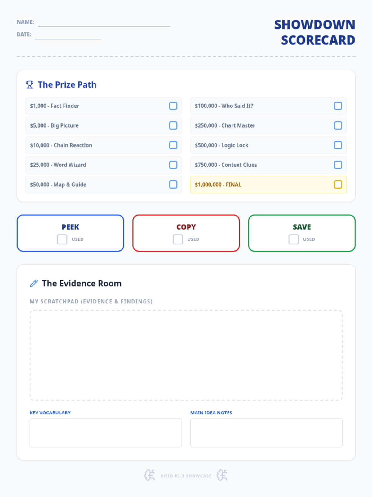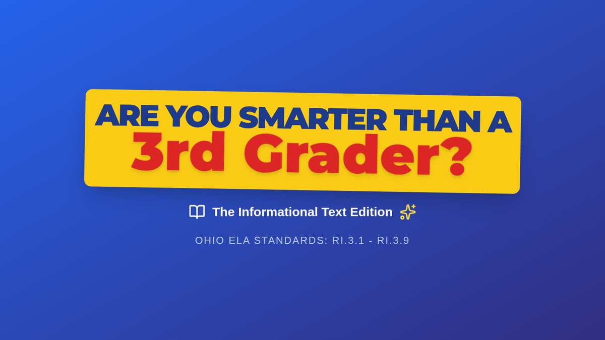 A high-stakes, game-show style lesson based on the 'Are You Smarter Than a 5th Grader' format, specifically targeting Ohio 3rd Grade Informational Text and Language standards. Students test their knowledge of main ideas, text features, and vocabulary to see if they can outsmart a 3rd grader.