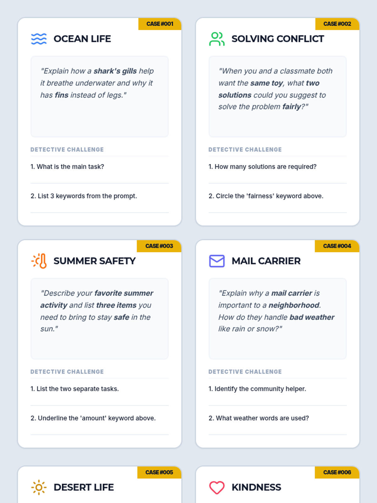 A high-stakes, detective-themed escape room designed to prepare 3rd-grade students for the Ohio State Test (OST) in English Language Arts. Students solve a series of 'locks' involving reading comprehension, vocabulary, and grammar to recover stolen agency data.