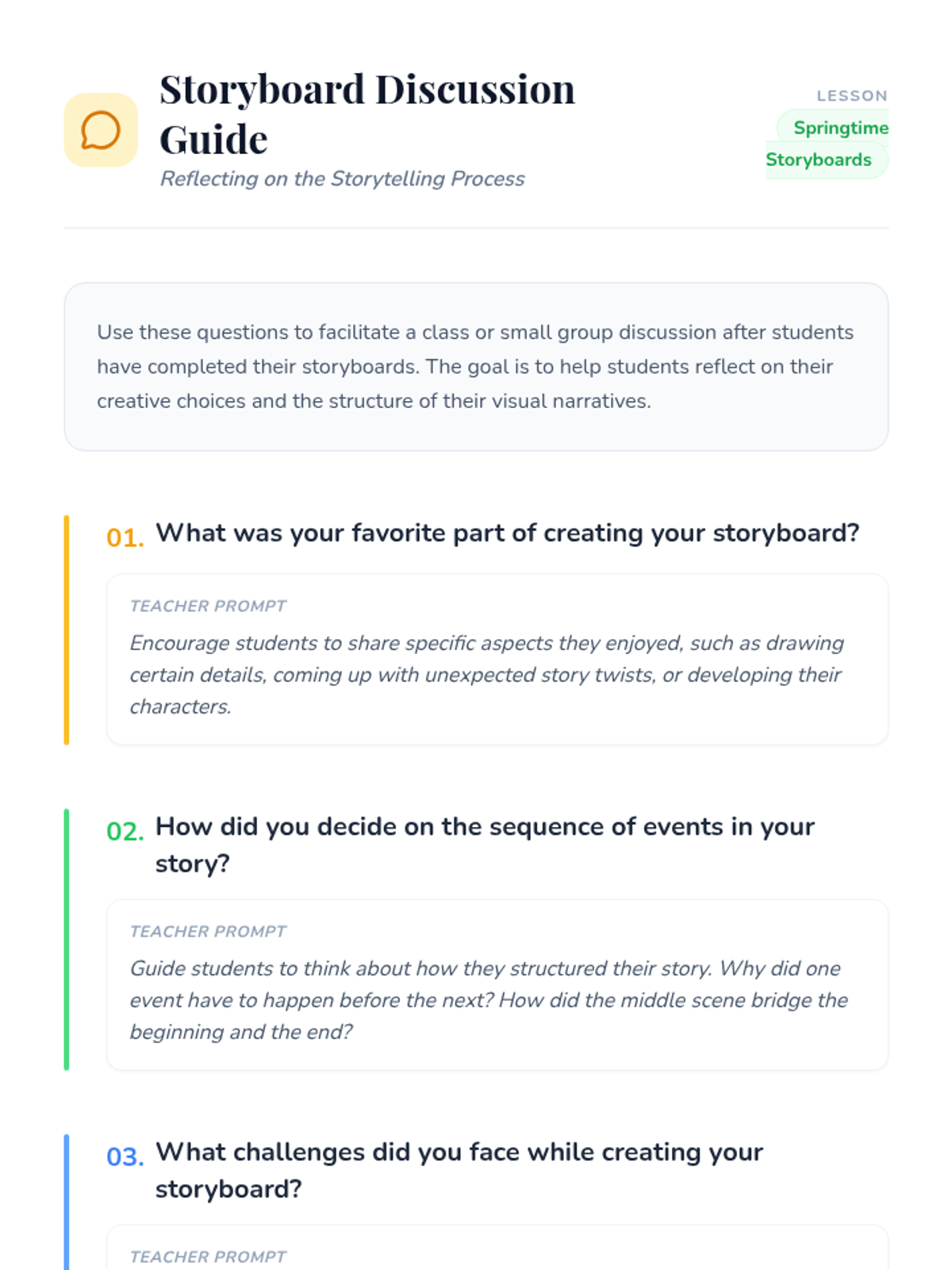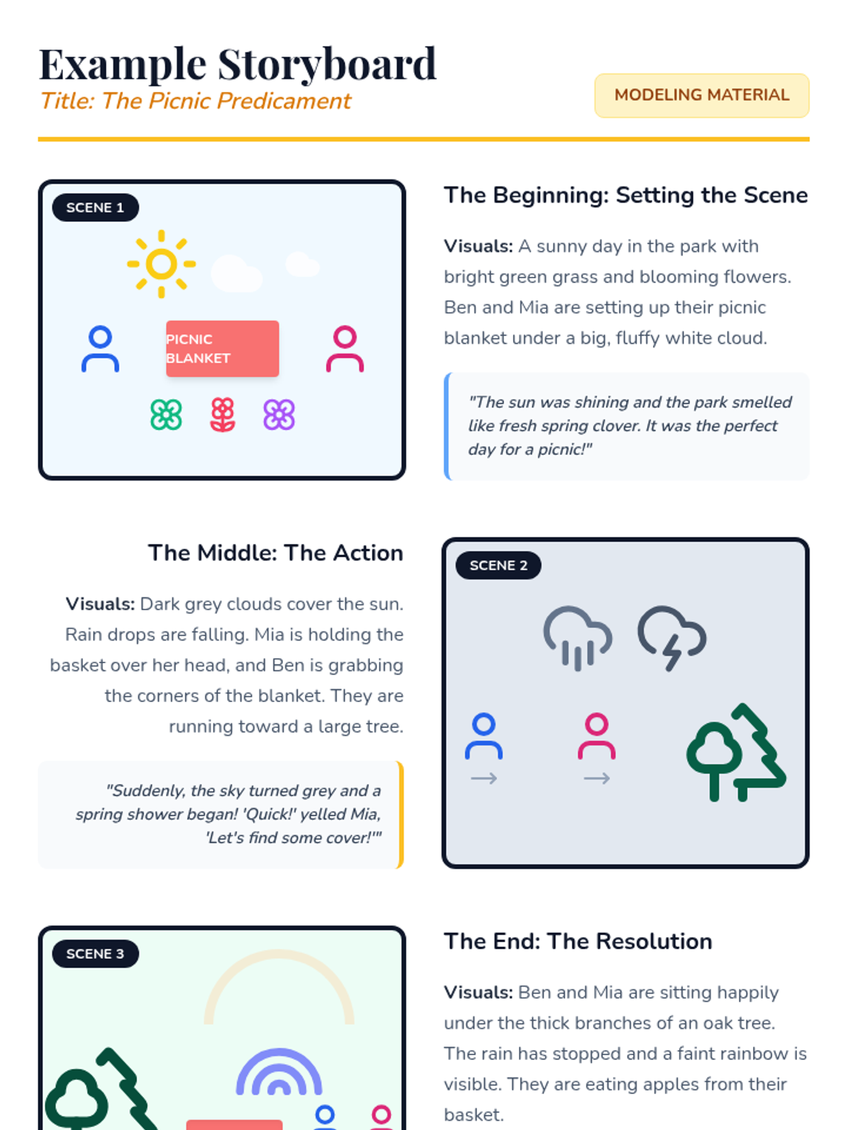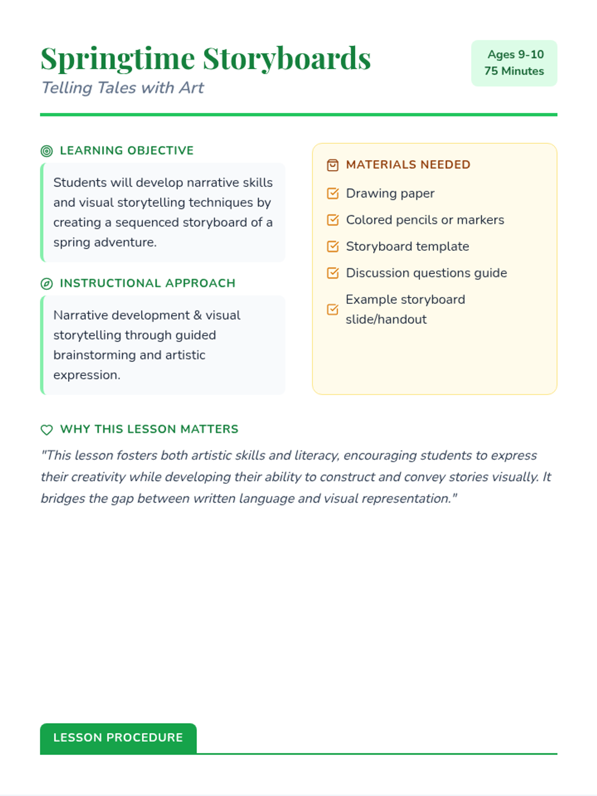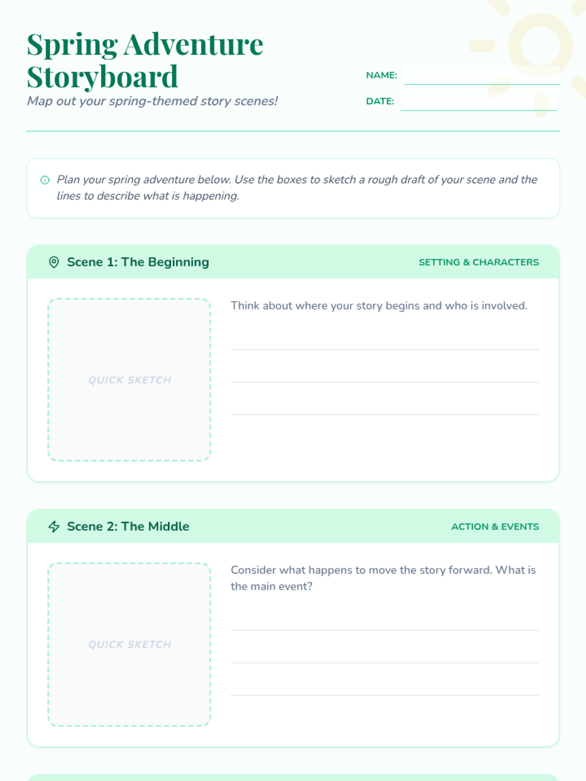 Students will create storyboards that depict a spring adventure, focusing on narrative development and visual storytelling through art and literacy.