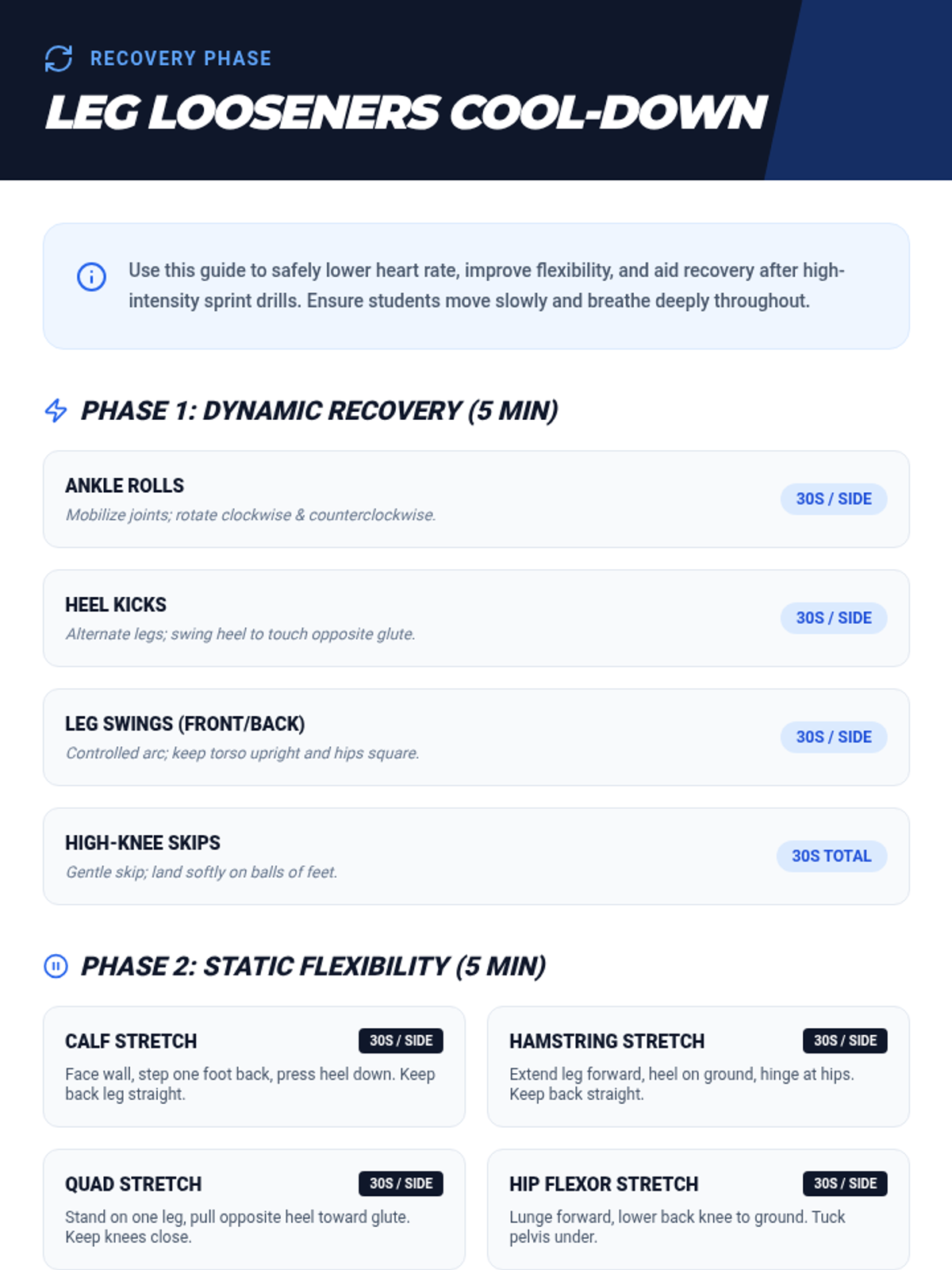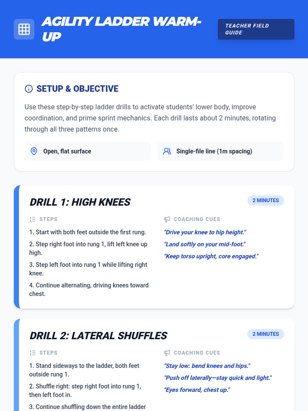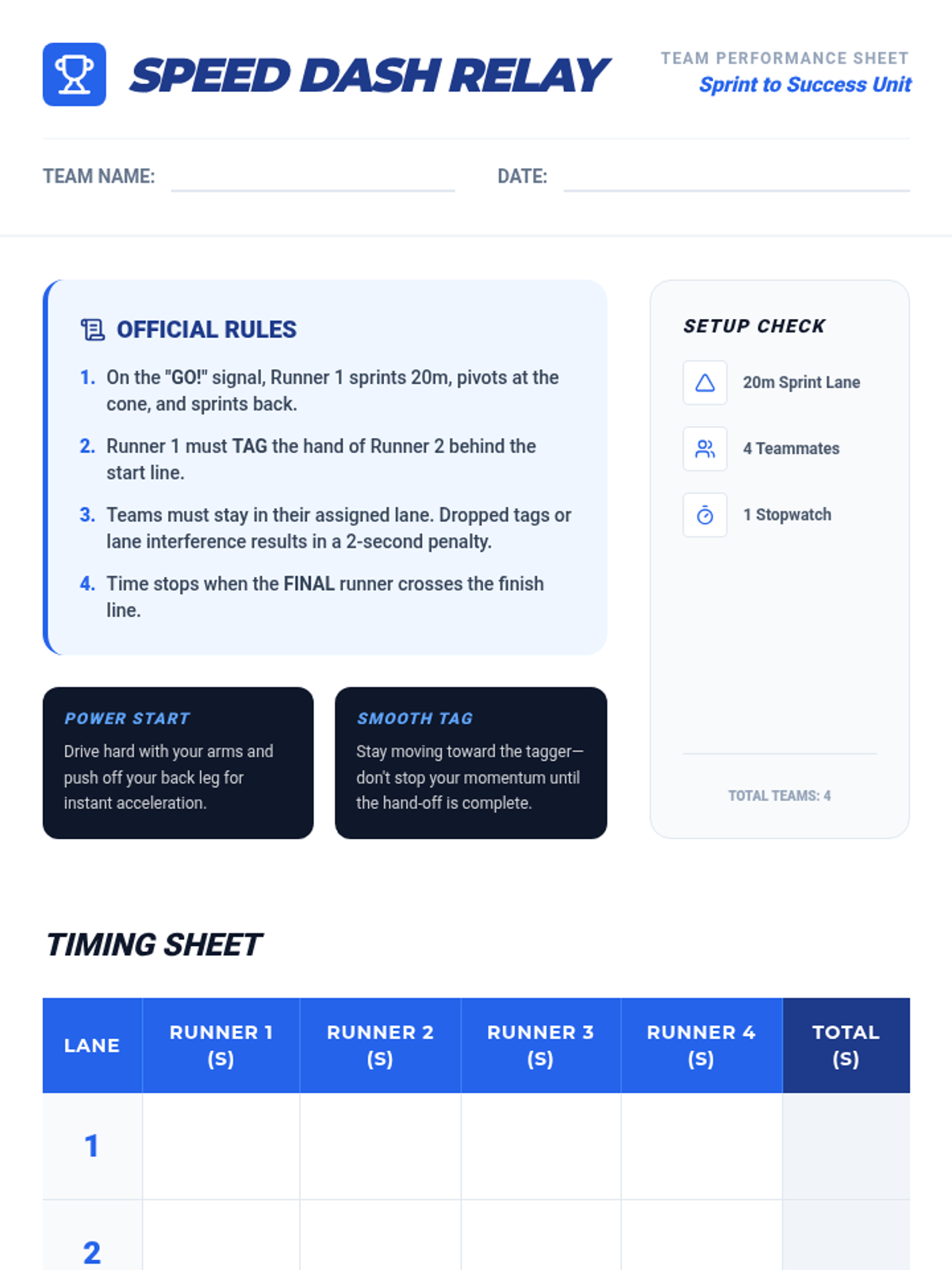 A high-energy lesson focused on sprinting biomechanics, explosive power, and form analysis for track and field. Students learn the science of speed and apply it through drills, data collection, and competitive games.