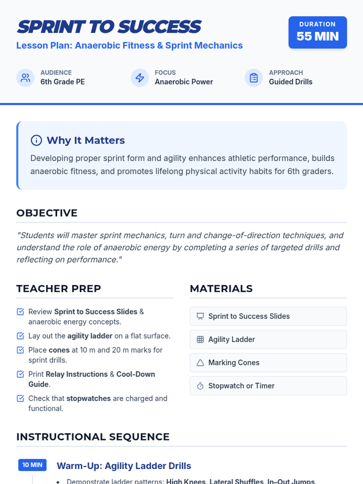 A high-energy PE lesson for 6th graders focusing on anaerobic fitness through sprint mechanics and agility drills. Students learn proper running form, explore the science of short bursts of energy, and compete in team-based relay races.