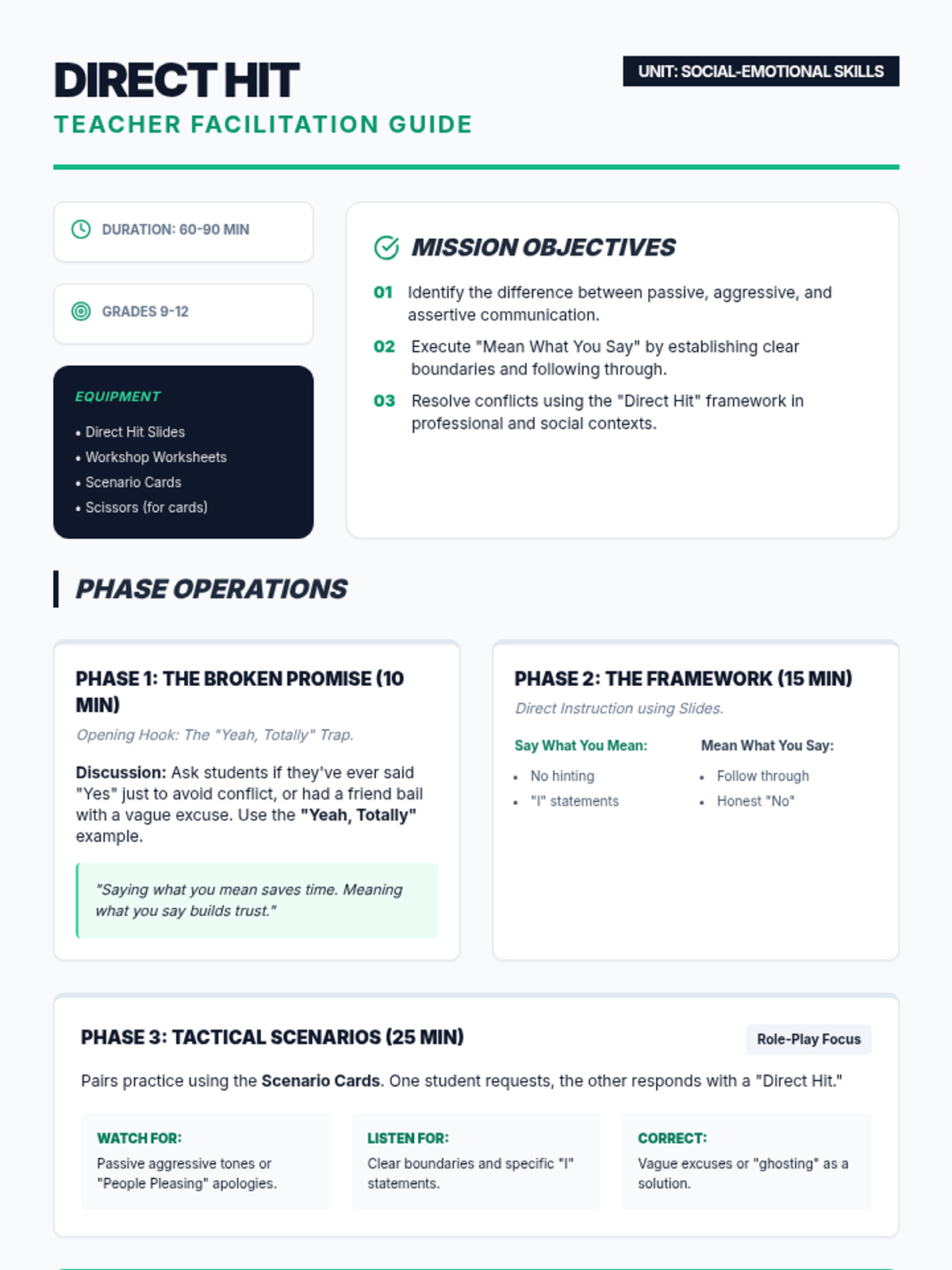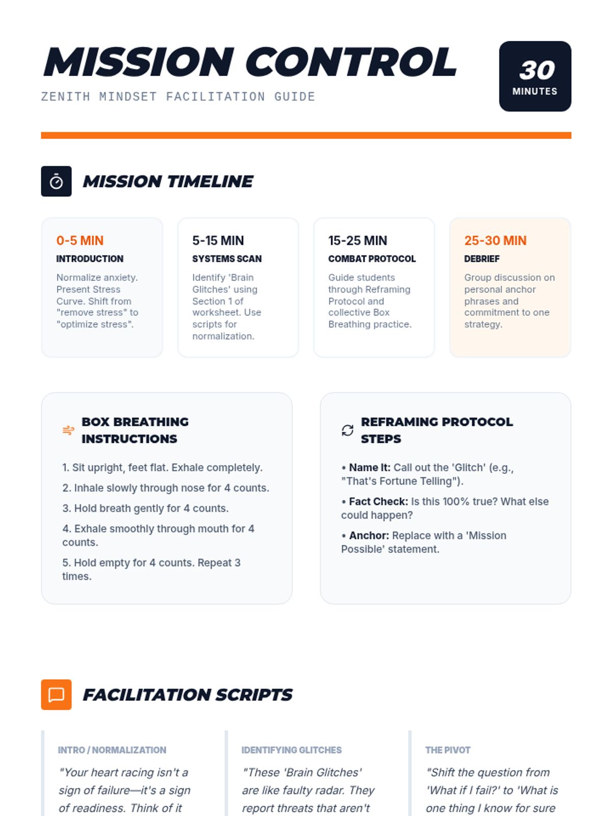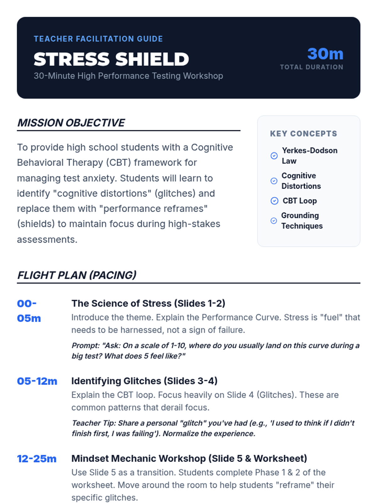 A supportive set of Spanish-language materials designed for a 10-year-old student (2nd-grade reading level) struggling with school anxiety, avoidance, and perfectionism. The lesson focuses on identifying triggers, practicing teacher interactions, and reframing mistakes through role-play and reflective activities.
