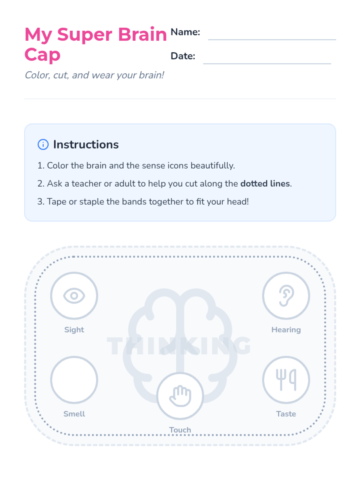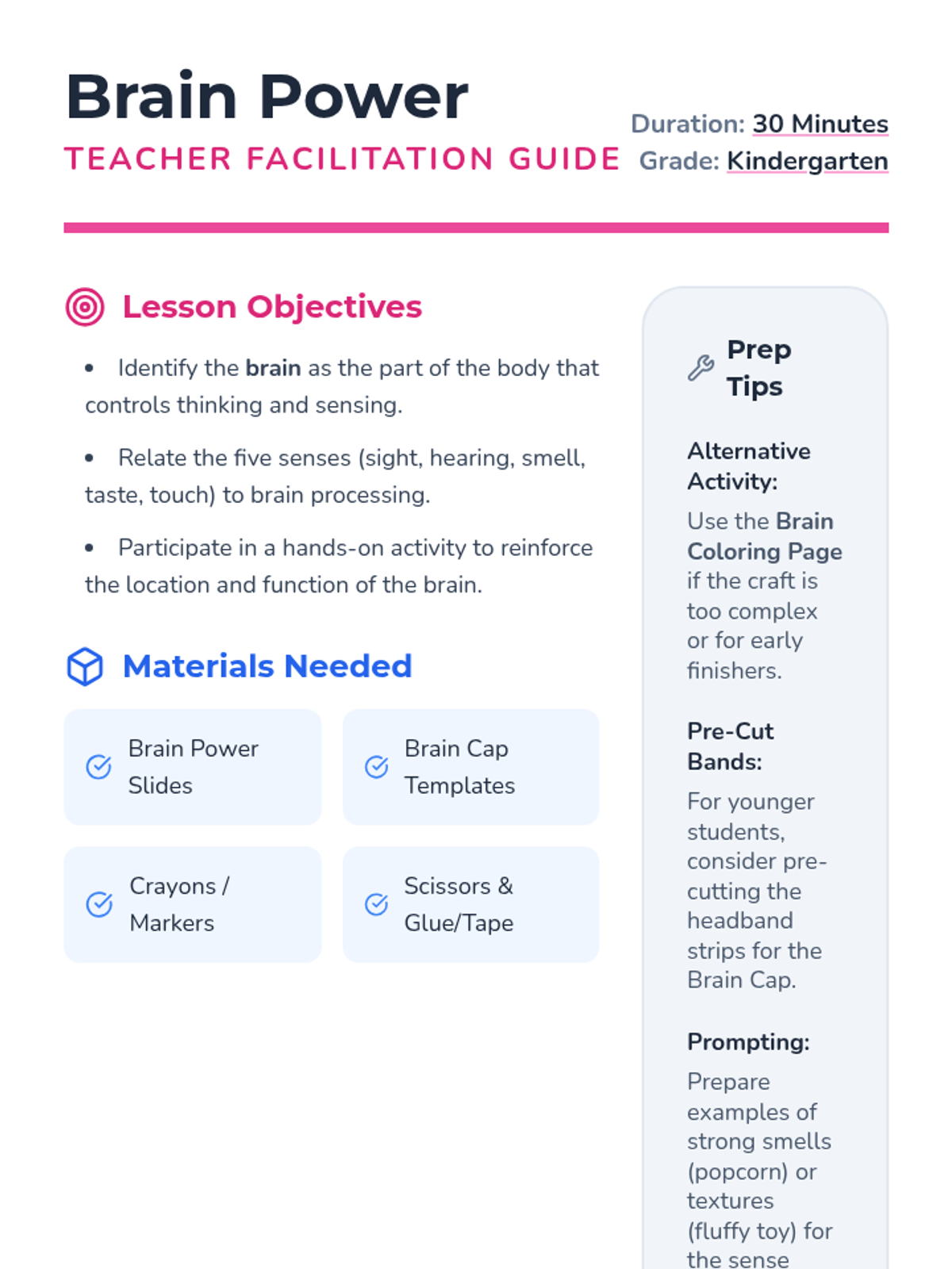 A 30-minute introductory lesson for kindergarteners about the brain, focusing on its role in thinking and processing the five senses. includes a presentation, teacher guide, and a wearable brain hat craft.