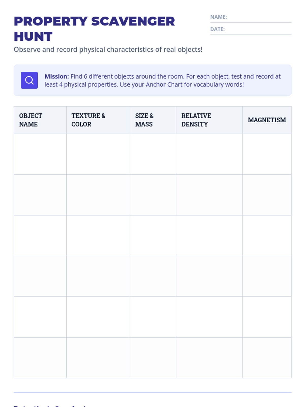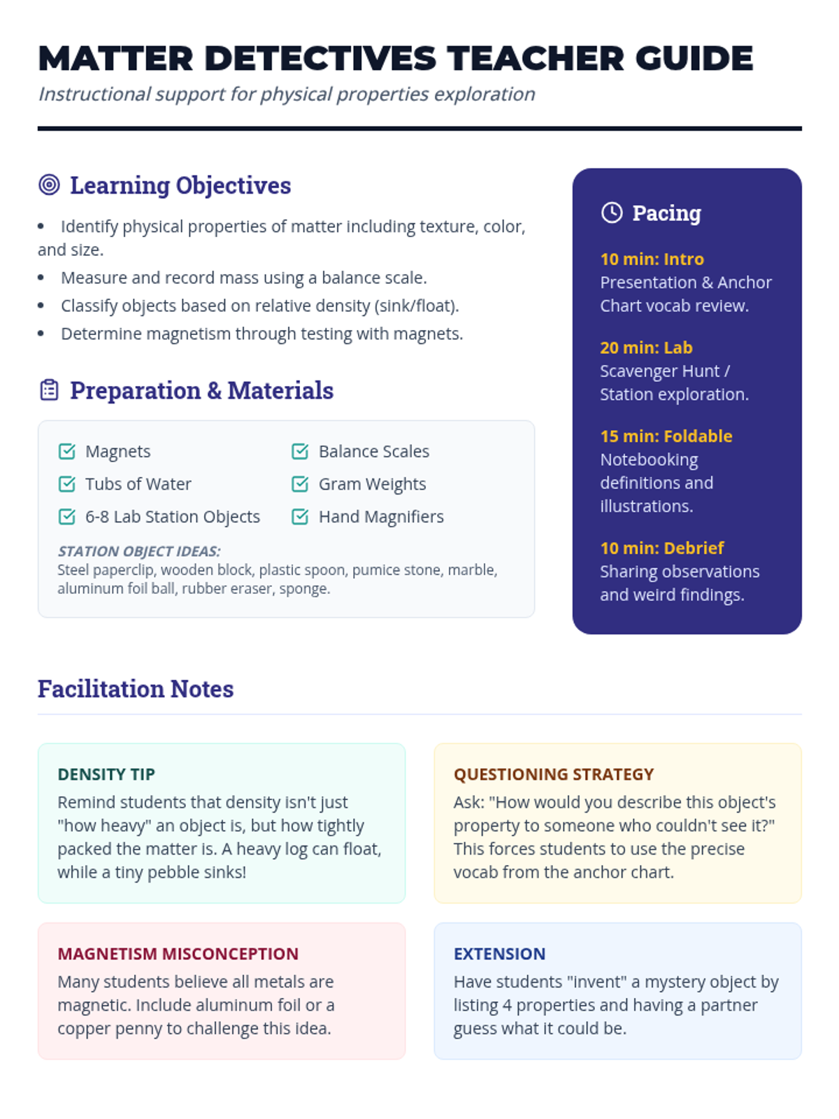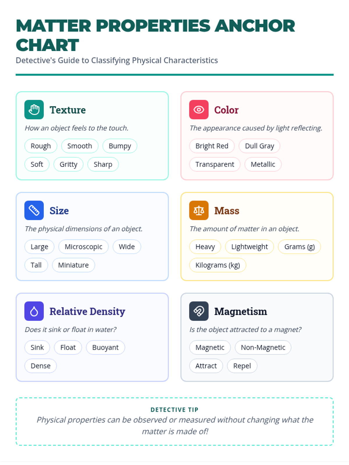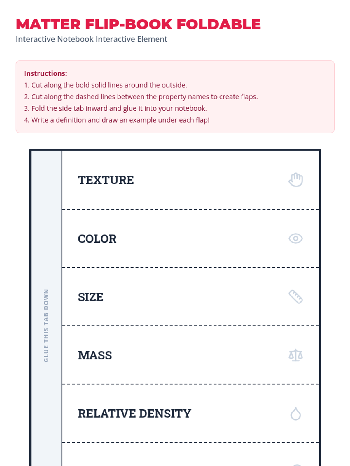 An engaging, hands-on lesson where students explore the physical properties of matter through a structured anchor chart, an interactive notebook foldable, and a real-world scavenger hunt.