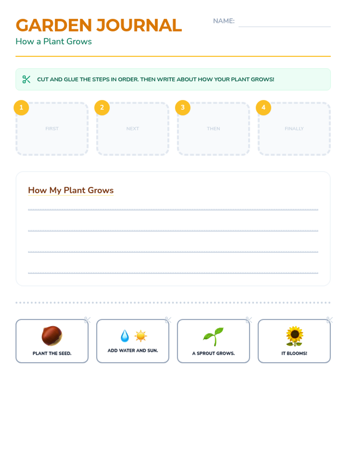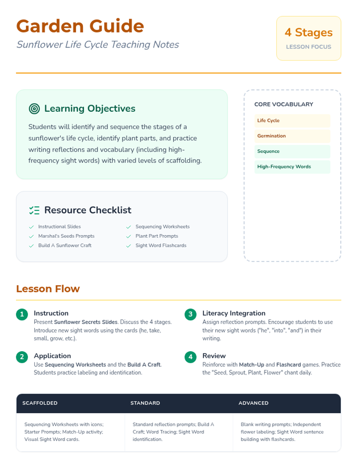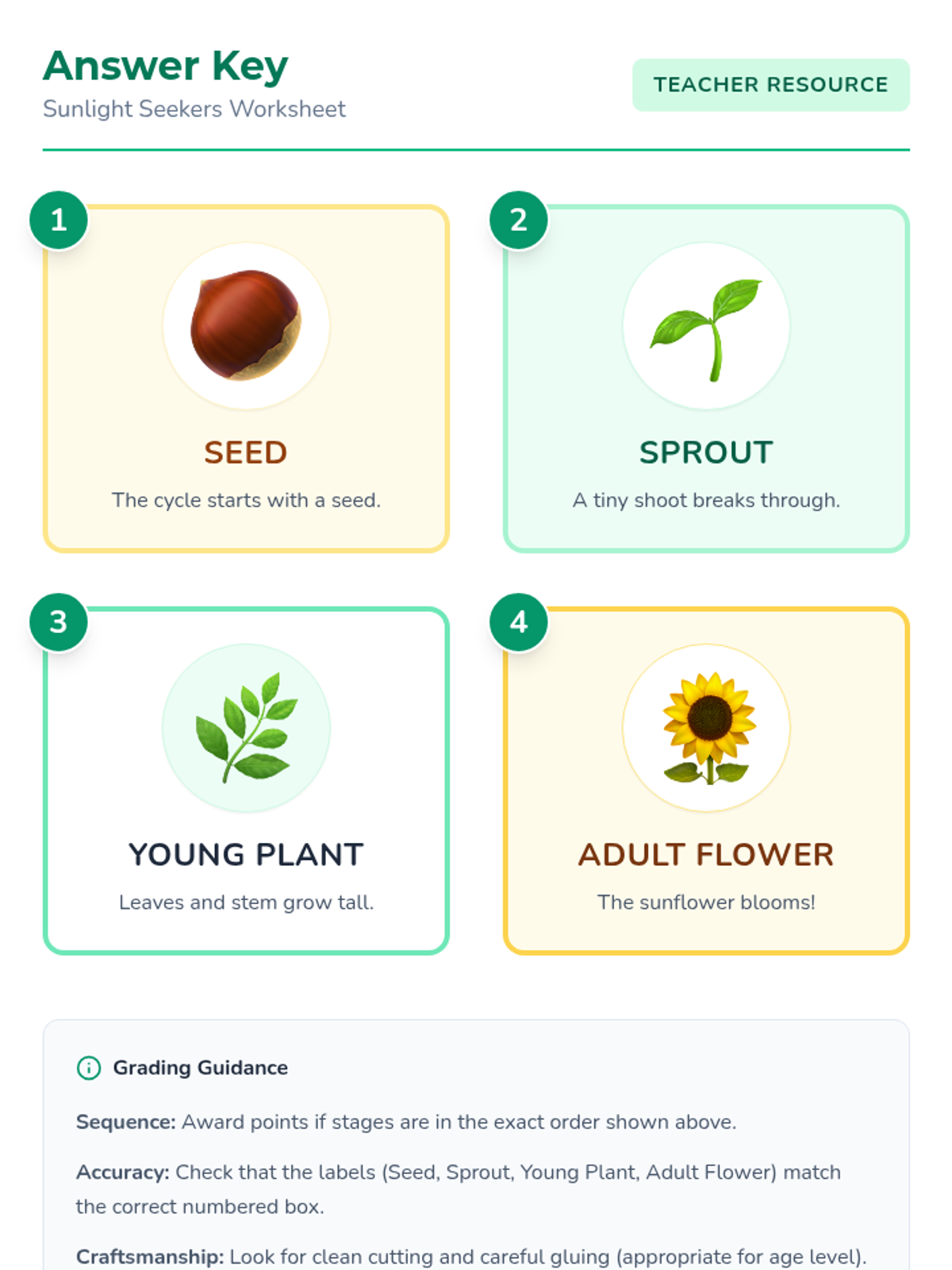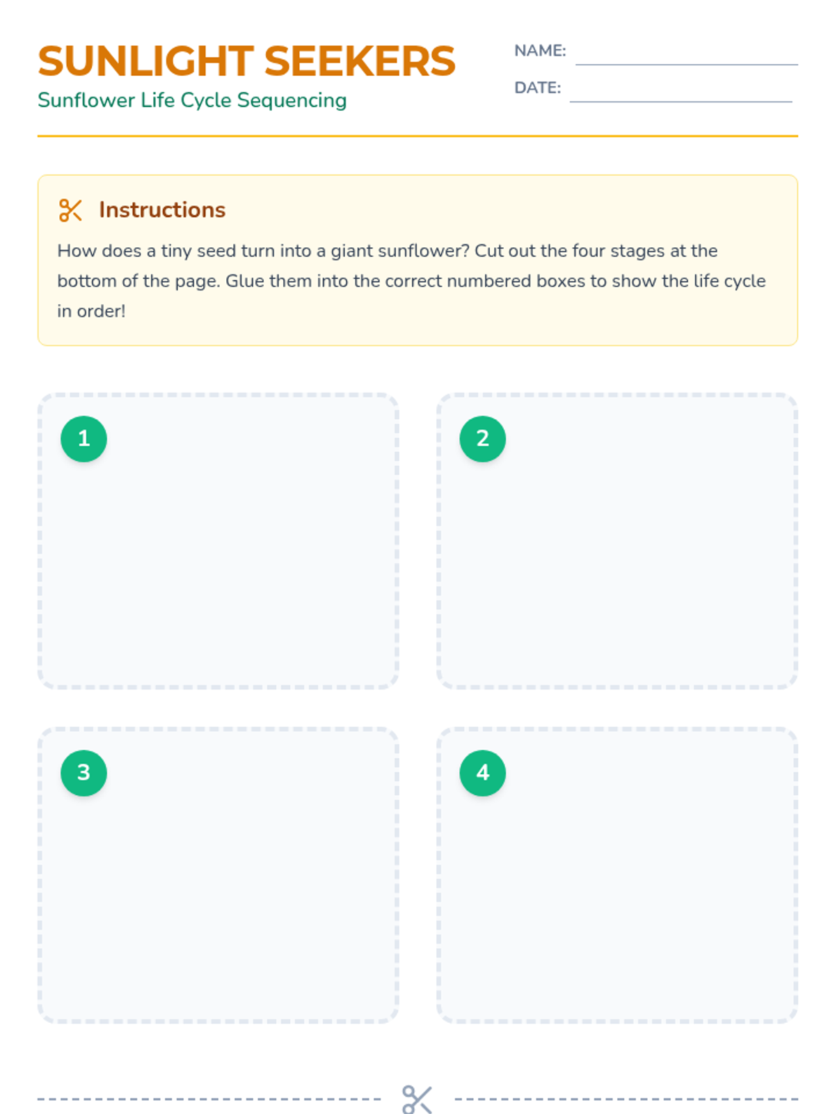 A hands-on lesson exploring the four primary stages of a sunflower's life cycle through visual instruction and a cut-and-paste sequencing activity.