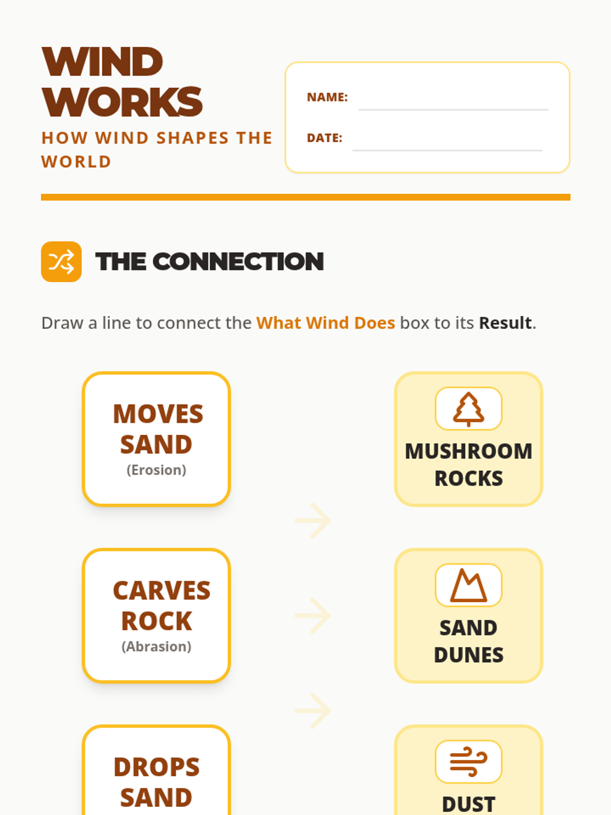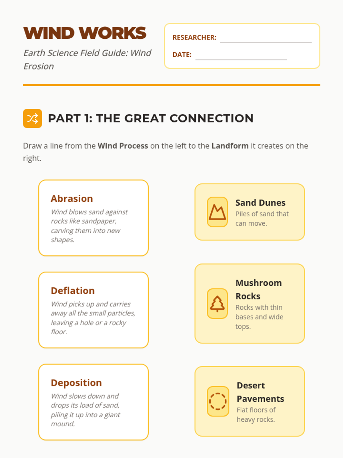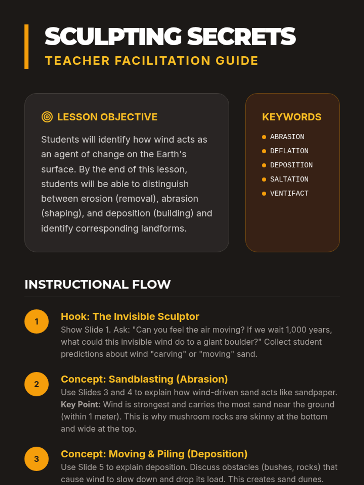 A lesson exploring how wind acts as a powerful sculptor, shaping the Earth's surface through erosion and deposition over long periods of time. Students will identify key landforms created by wind and understand the processes that form them.