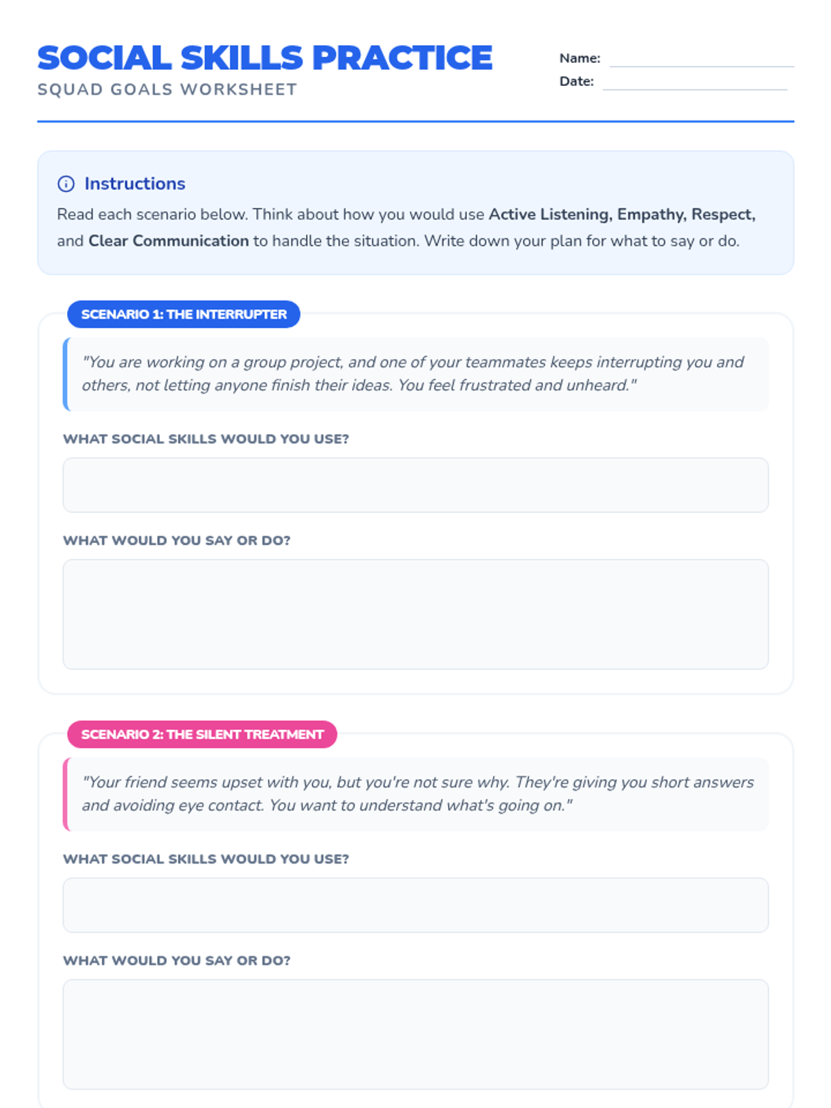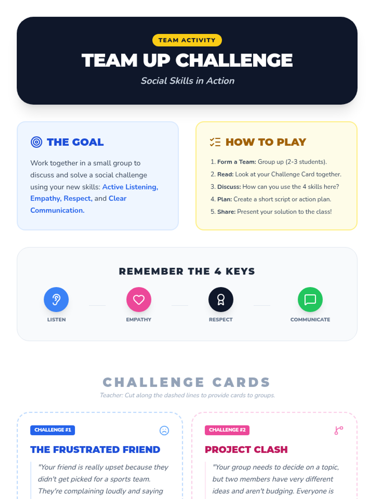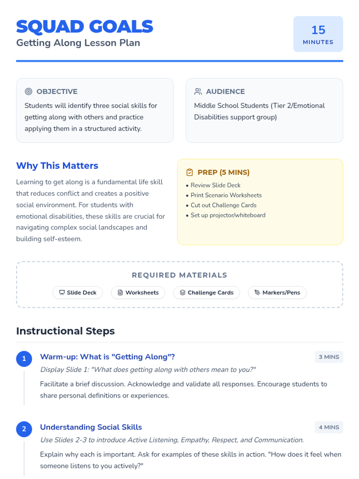 A 15-minute Tier 2 group lesson for middle school students to develop essential social skills like active listening, empathy, respect, and clear communication through interactive discussion and collaborative scenarios.