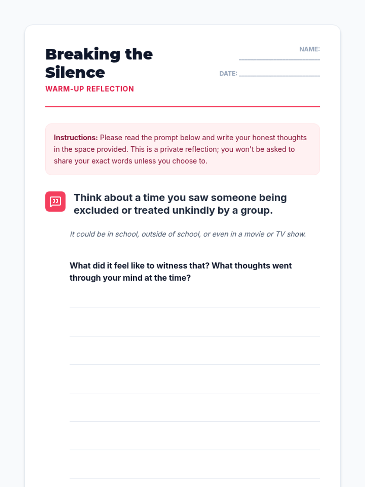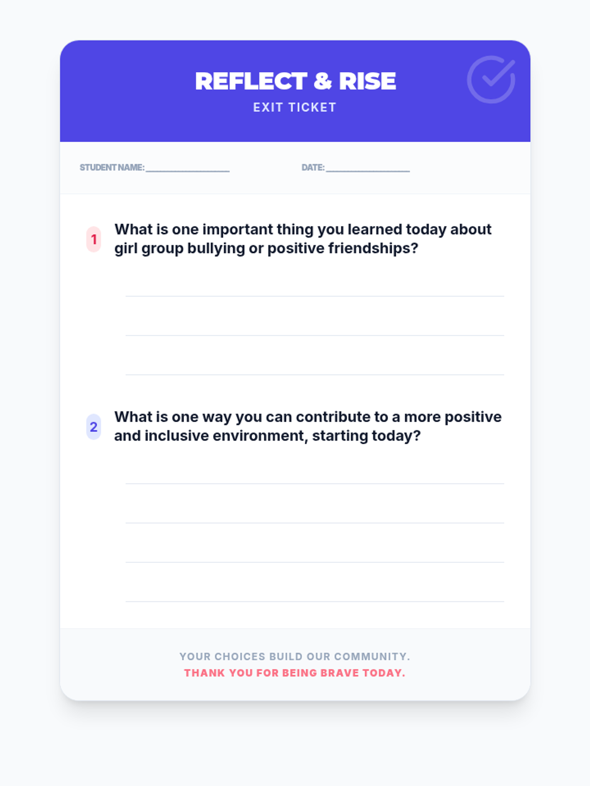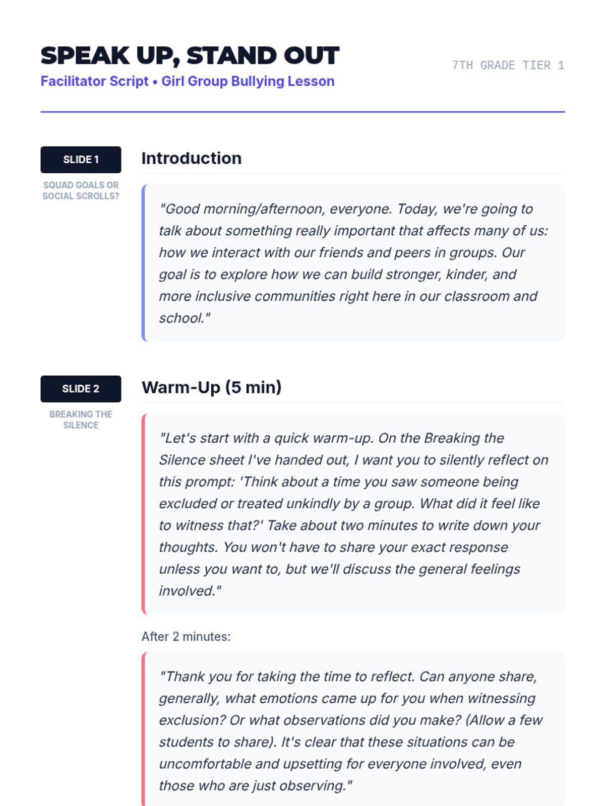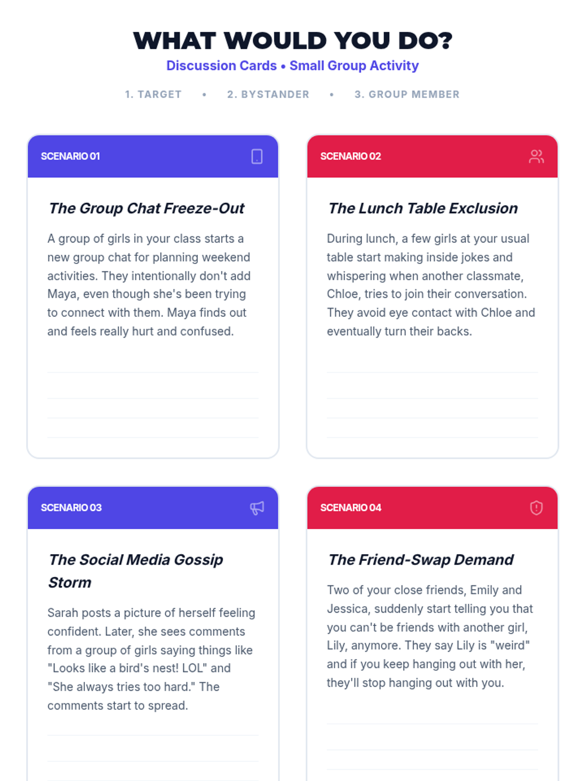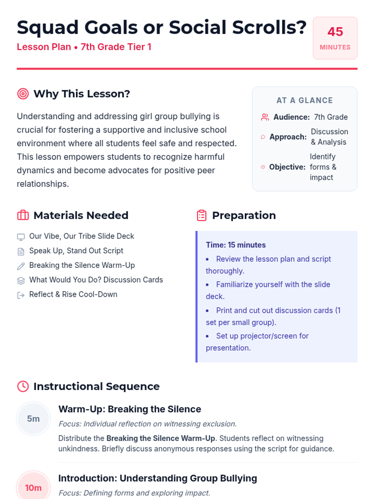 A 45-minute classroom session for 7th graders to identify and address girl group bullying, focusing on social dynamics, empathy, and intervention strategies.