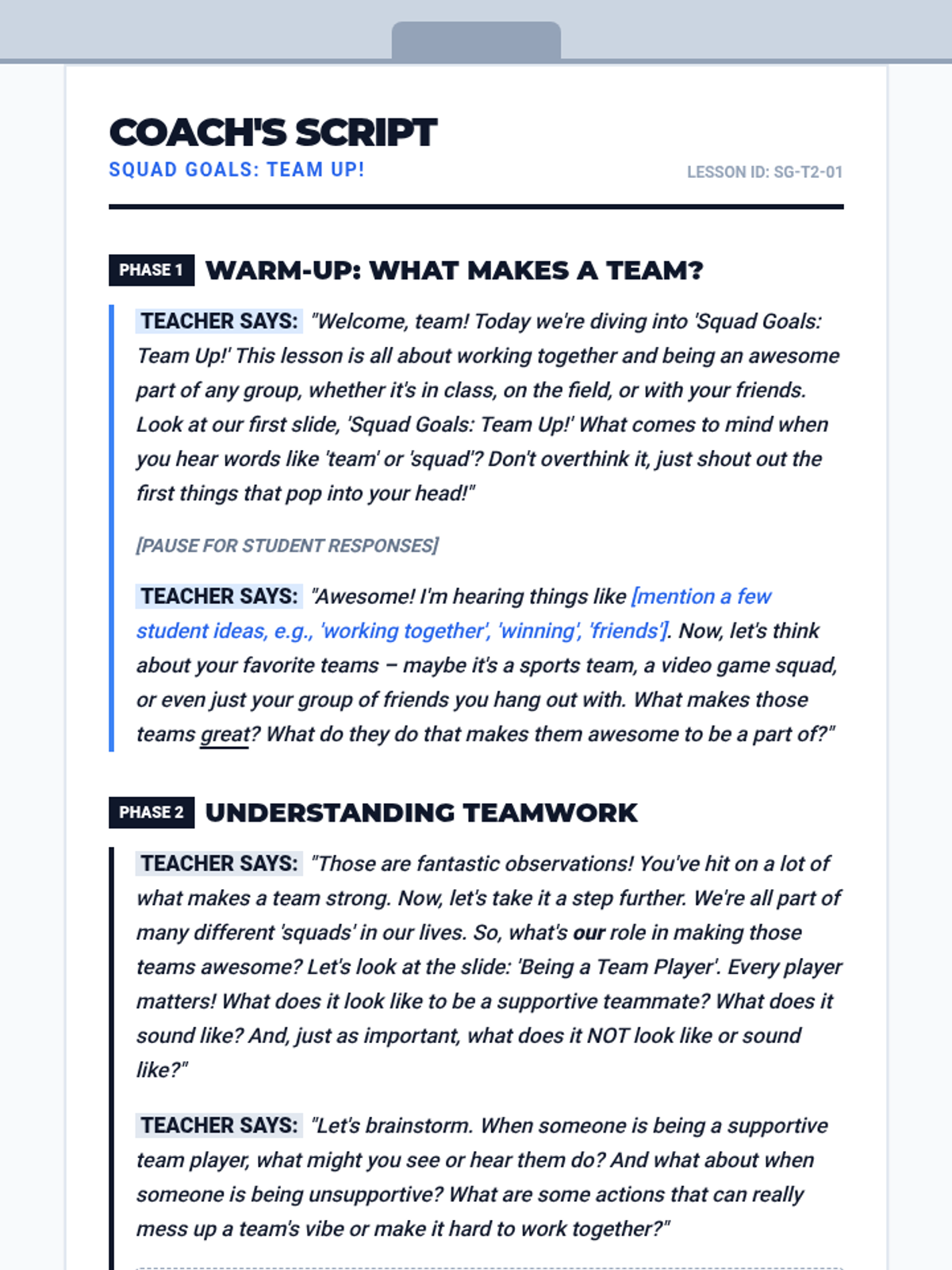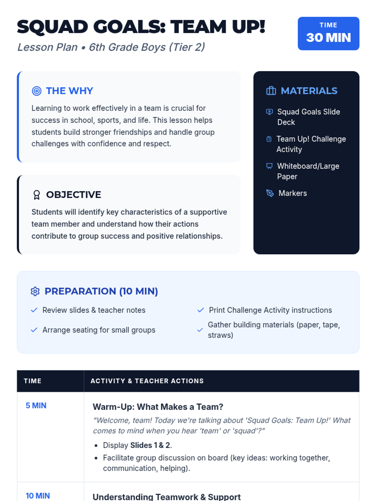 This lesson helps 6th-grade boys understand the importance of positive teamwork and how to be a supportive member of a group. It focuses on communication, respect, and collaboration within a 30-minute session.
