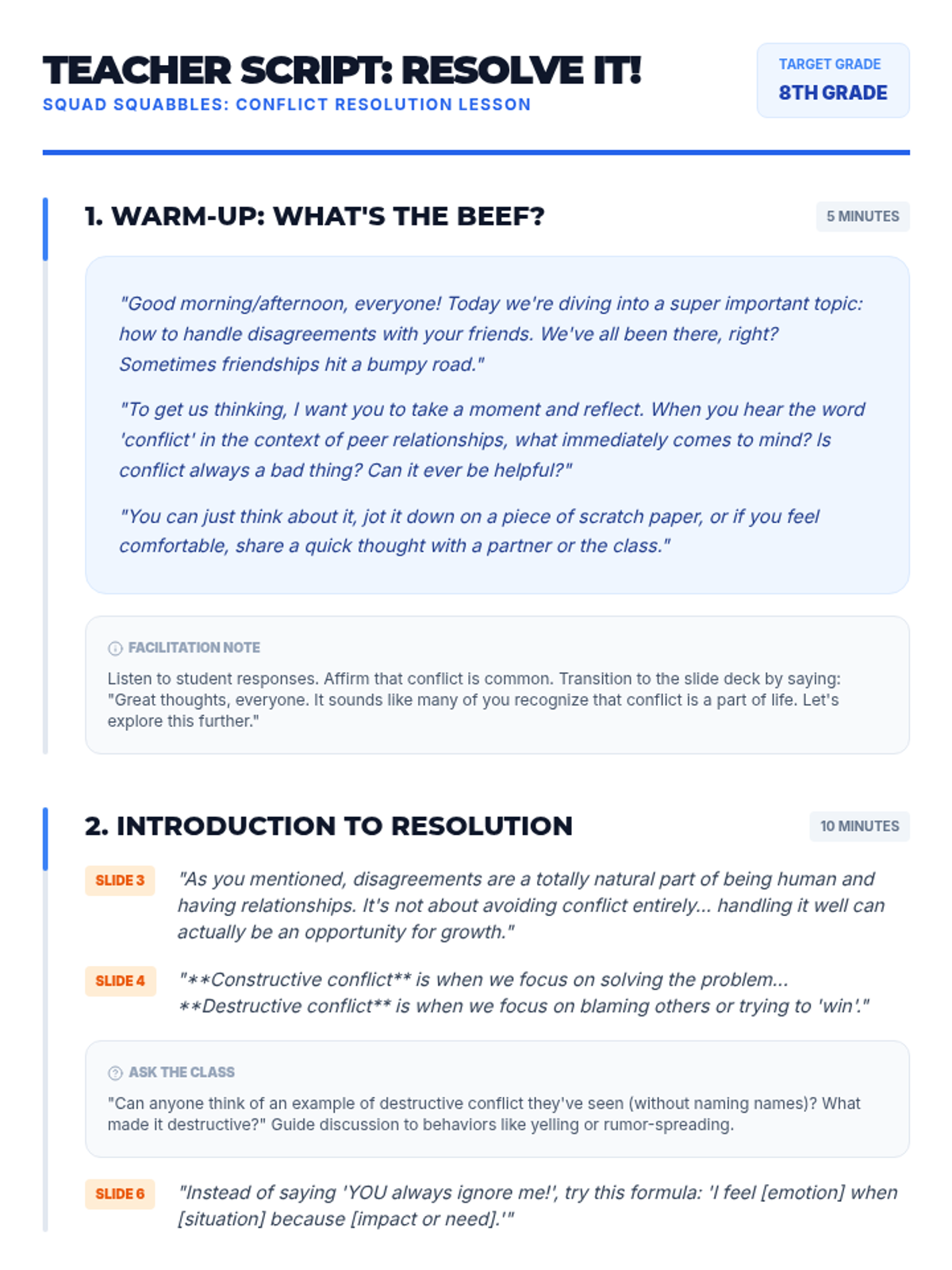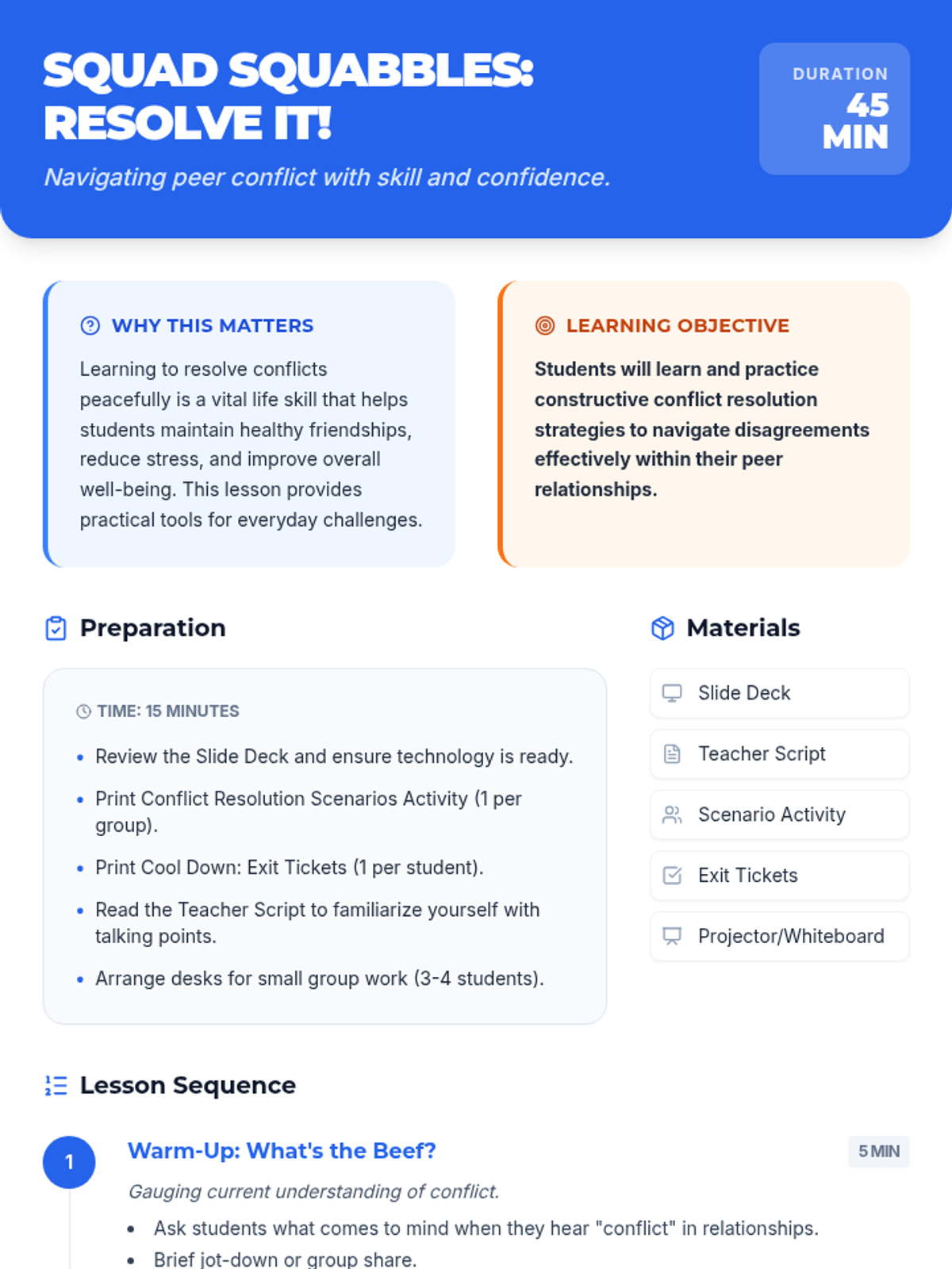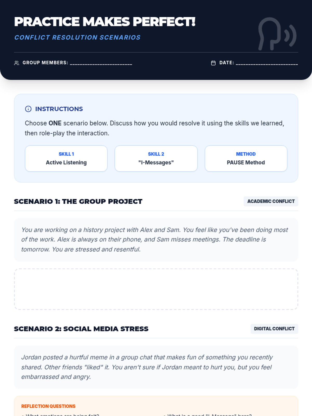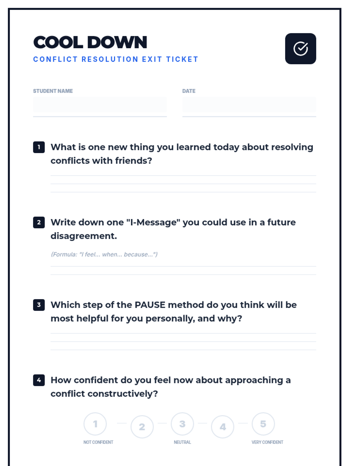 An interactive lesson for 8th-grade students focused on practical conflict resolution strategies, including 'I-Messages' and the 'PAUSE' method, to navigate peer disagreements constructively.