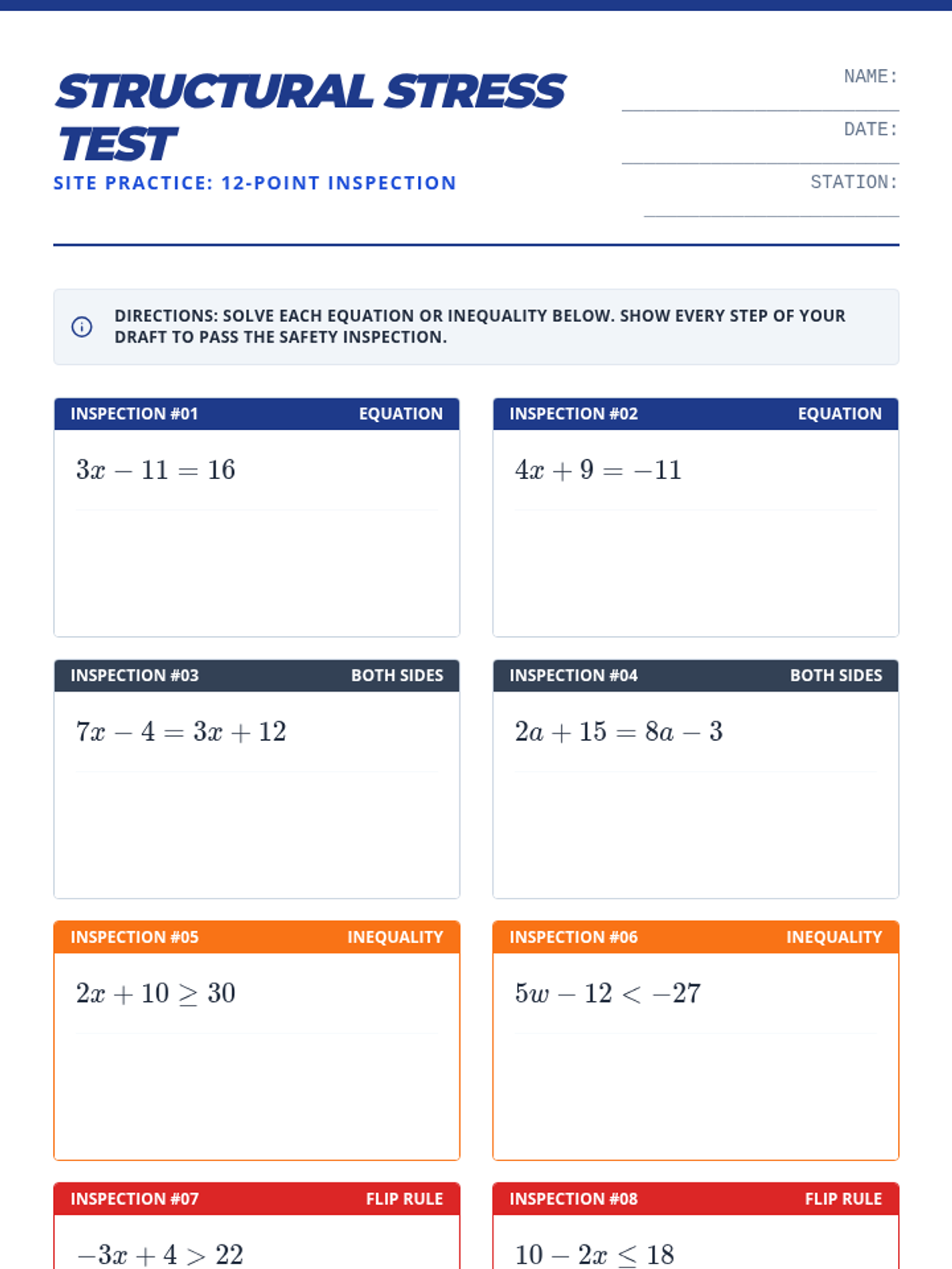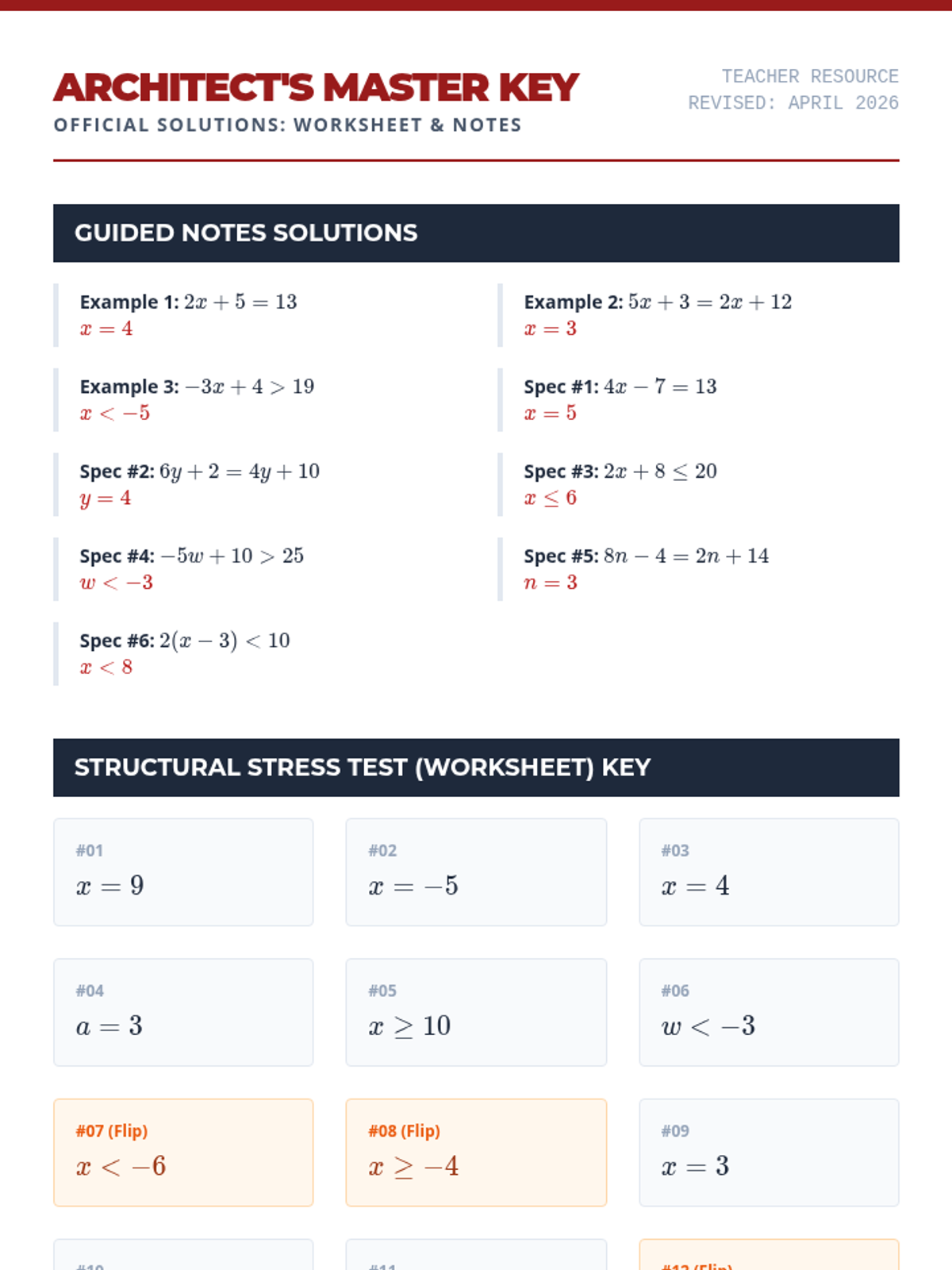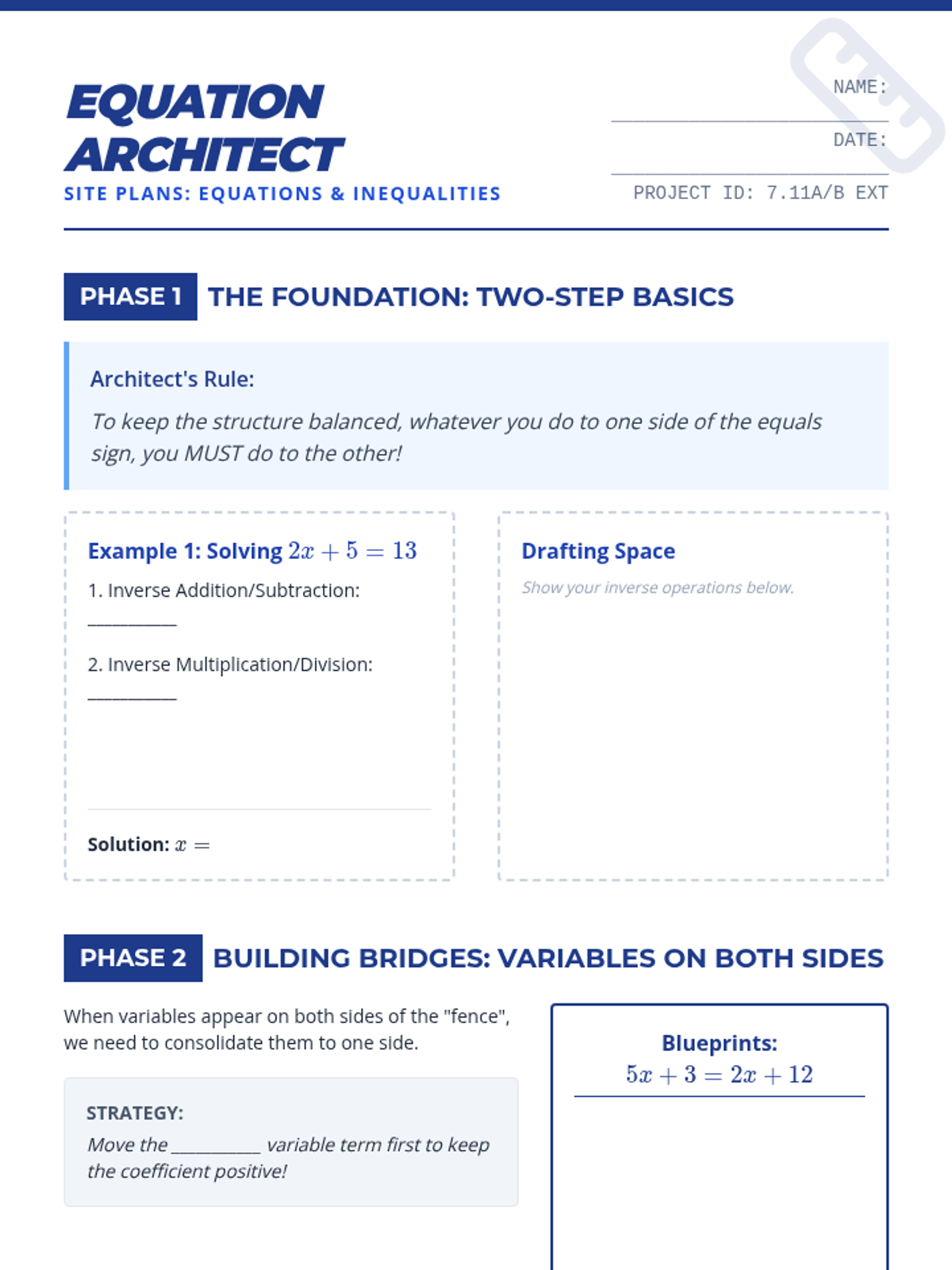 A comprehensive lesson on solving two-step equations and inequalities, including variables on both sides and the sign-reversal rule for inequalities. Students will 'draft' their solutions using architectural-themed guided notes and practice exercises.