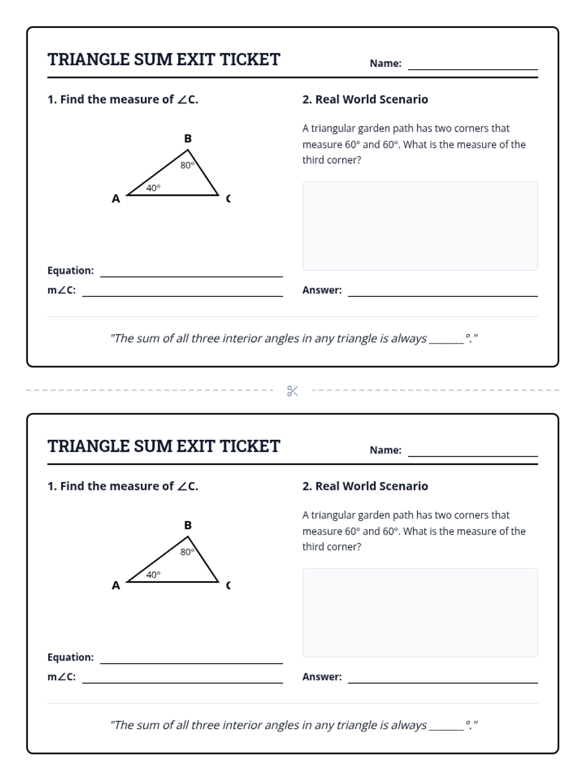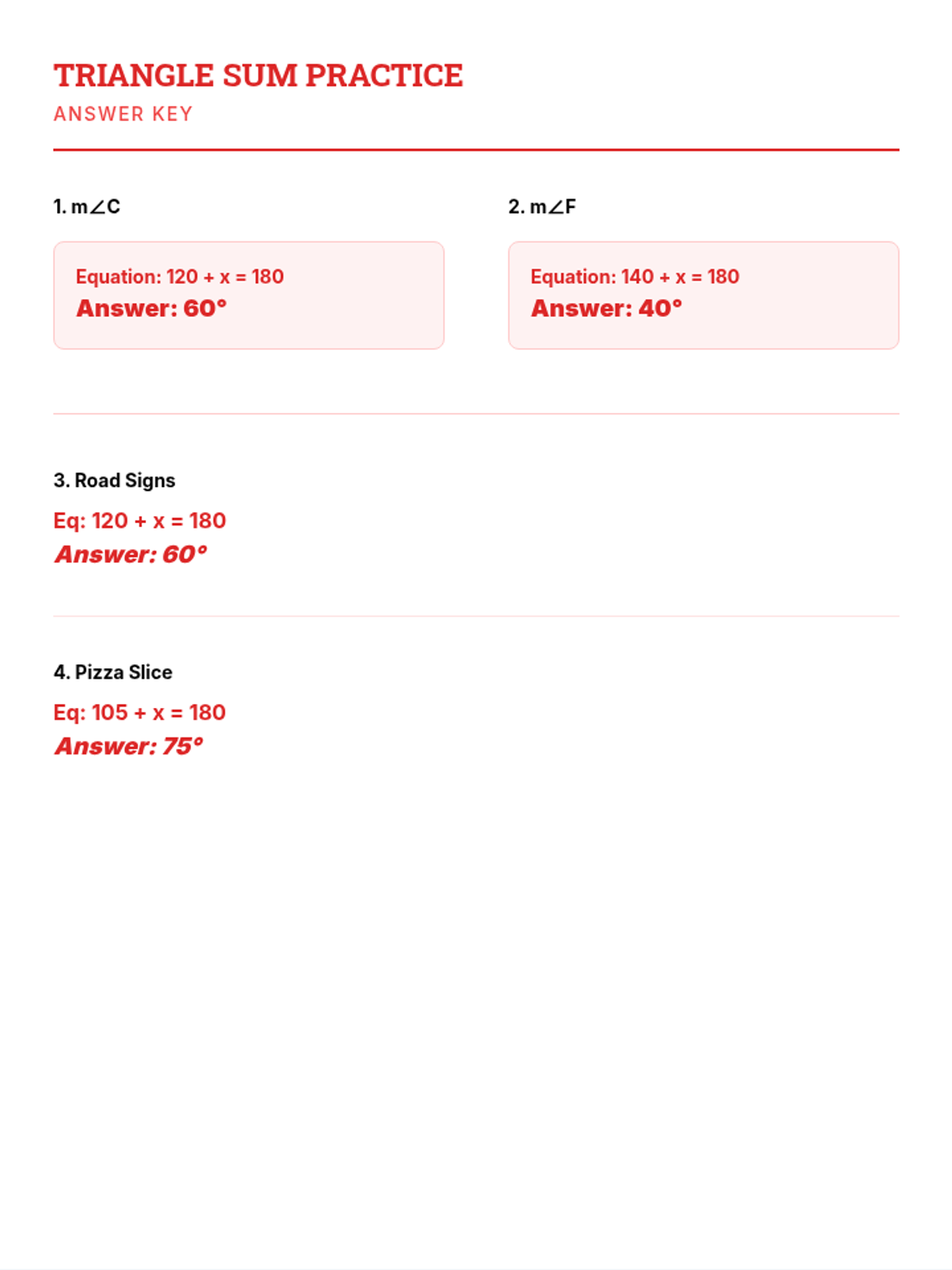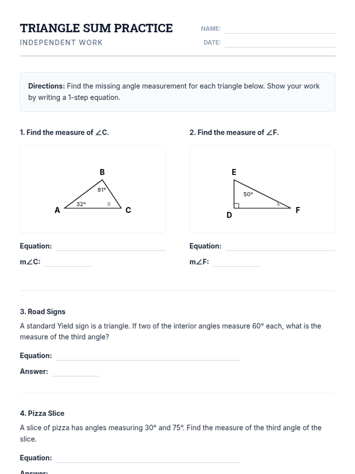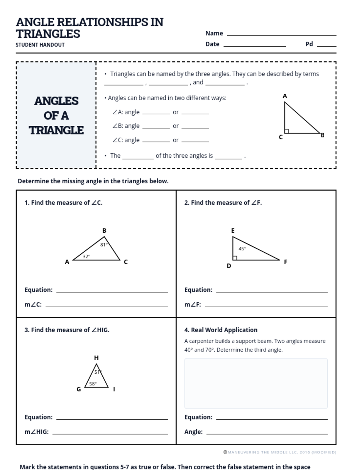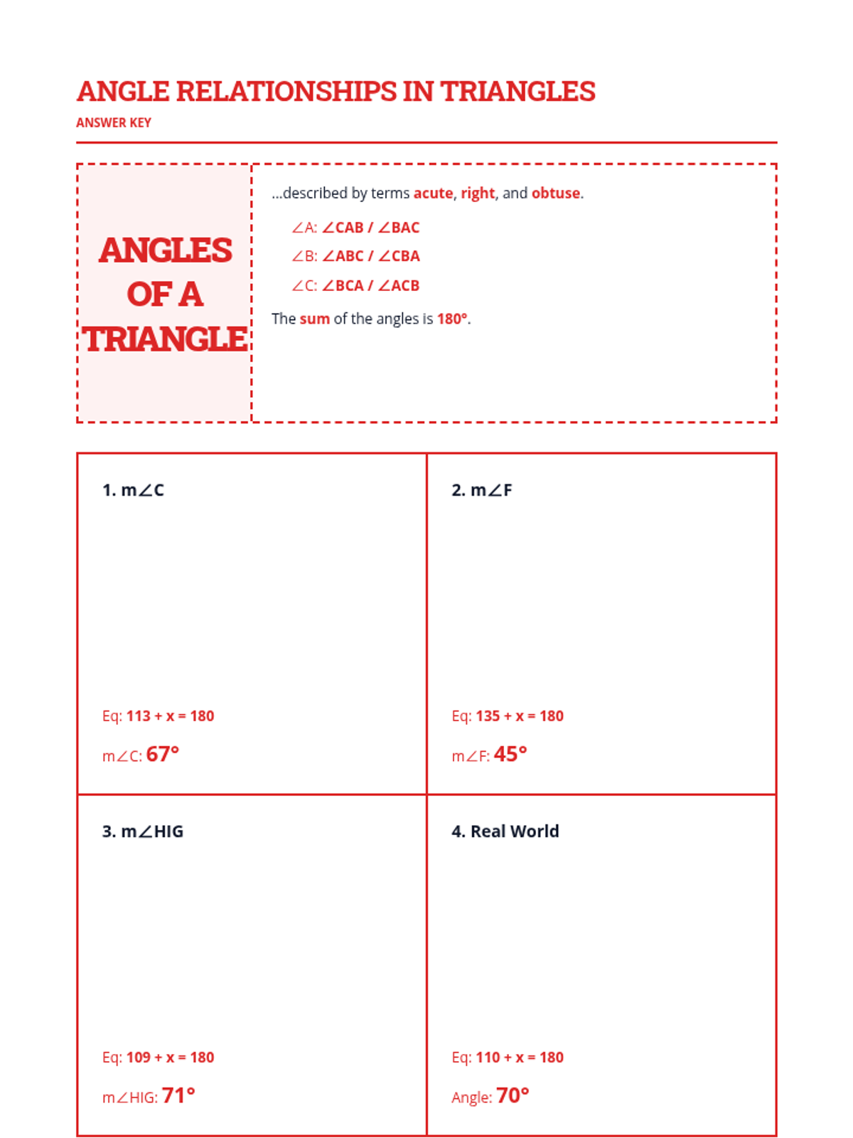 A simplified lesson on the Triangle Sum Rule, focusing on 3-letter angle naming and solving for missing angles using one-step equations with whole numbers.
