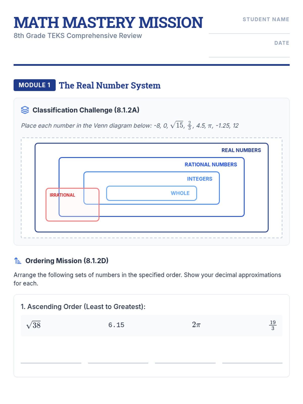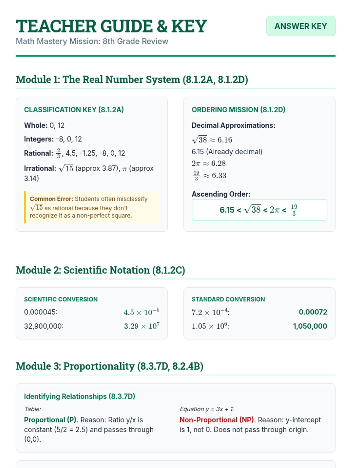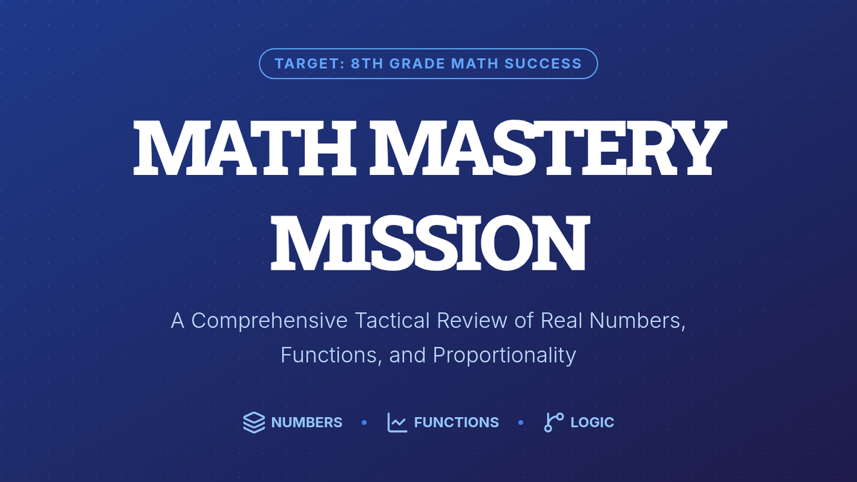 A comprehensive 8th-grade math review covering real number relationships, linear functions, and proportionality to prepare students for standardized testing.