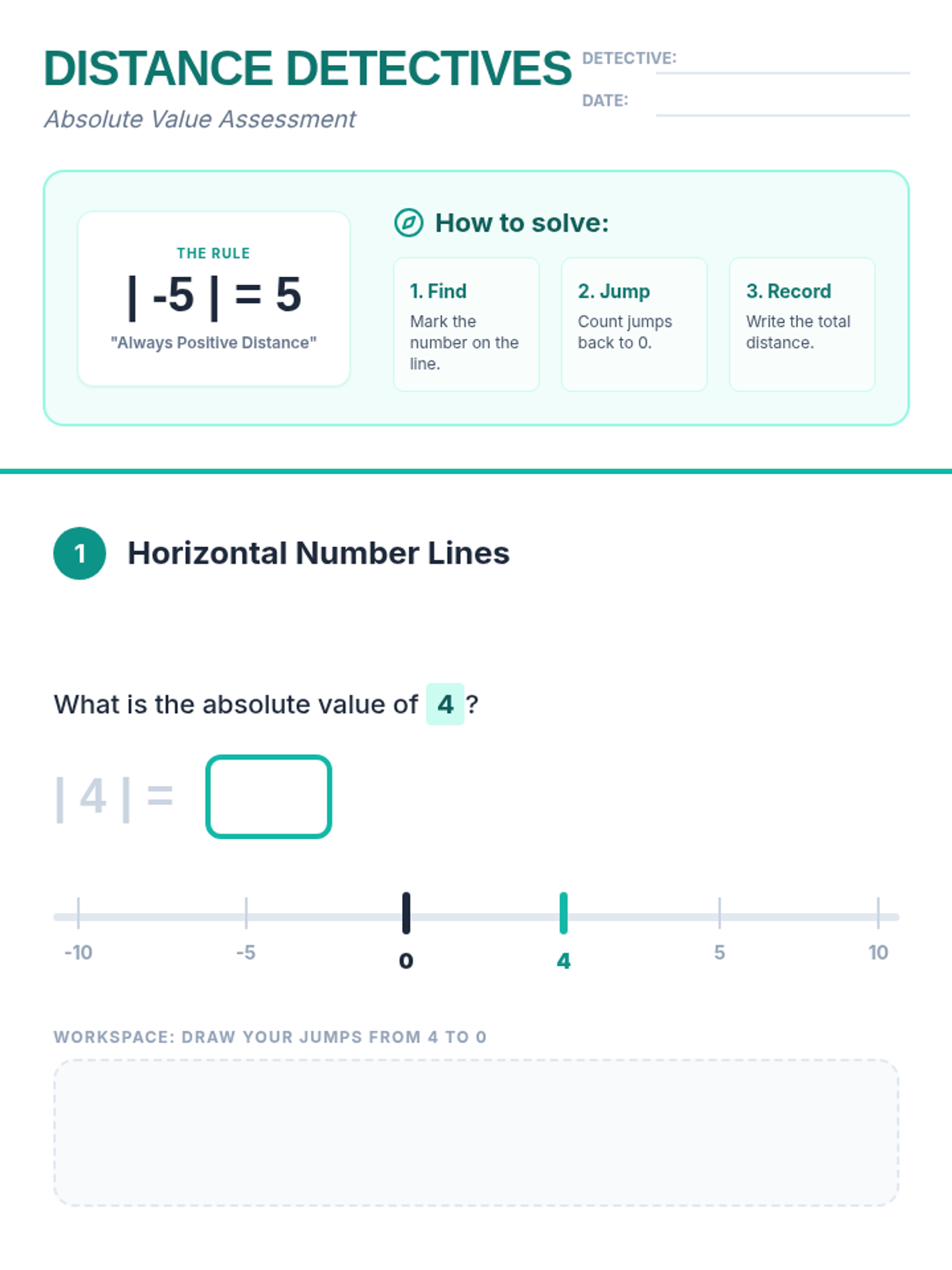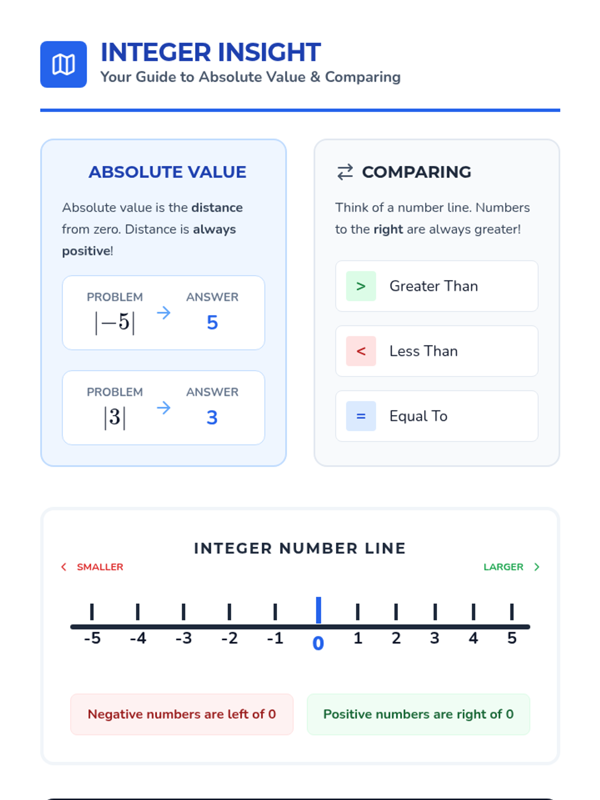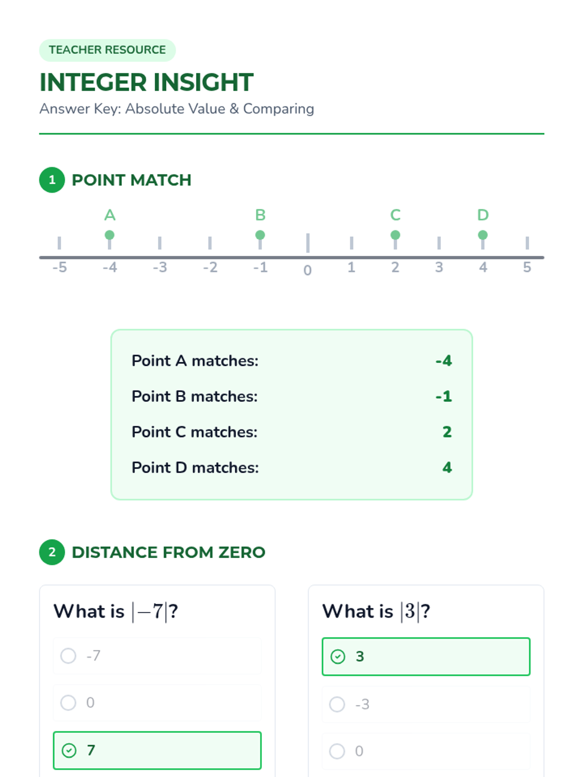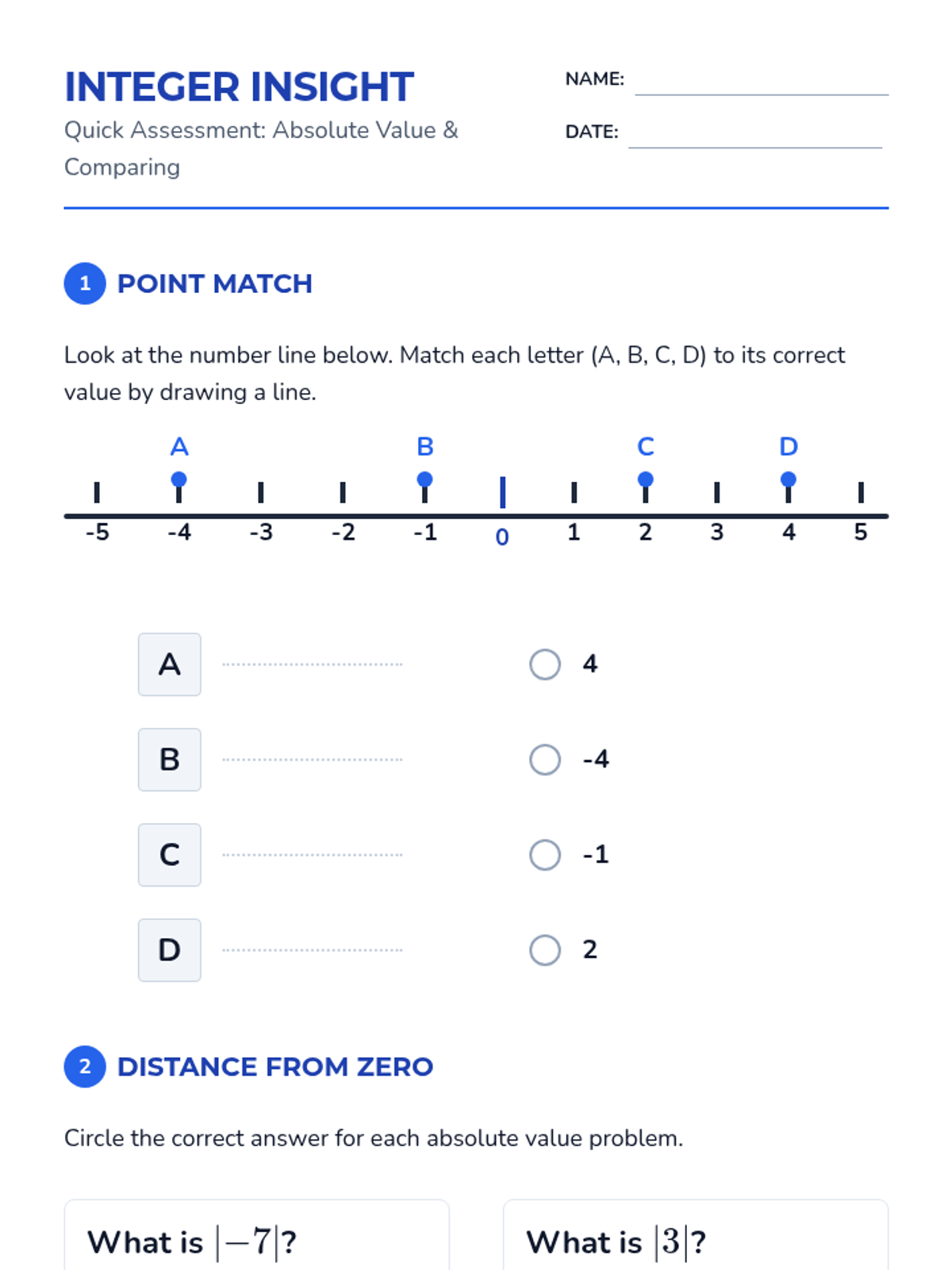 A quick assessment designed for IEP students to demonstrate their understanding of single-digit absolute value and integer comparison.