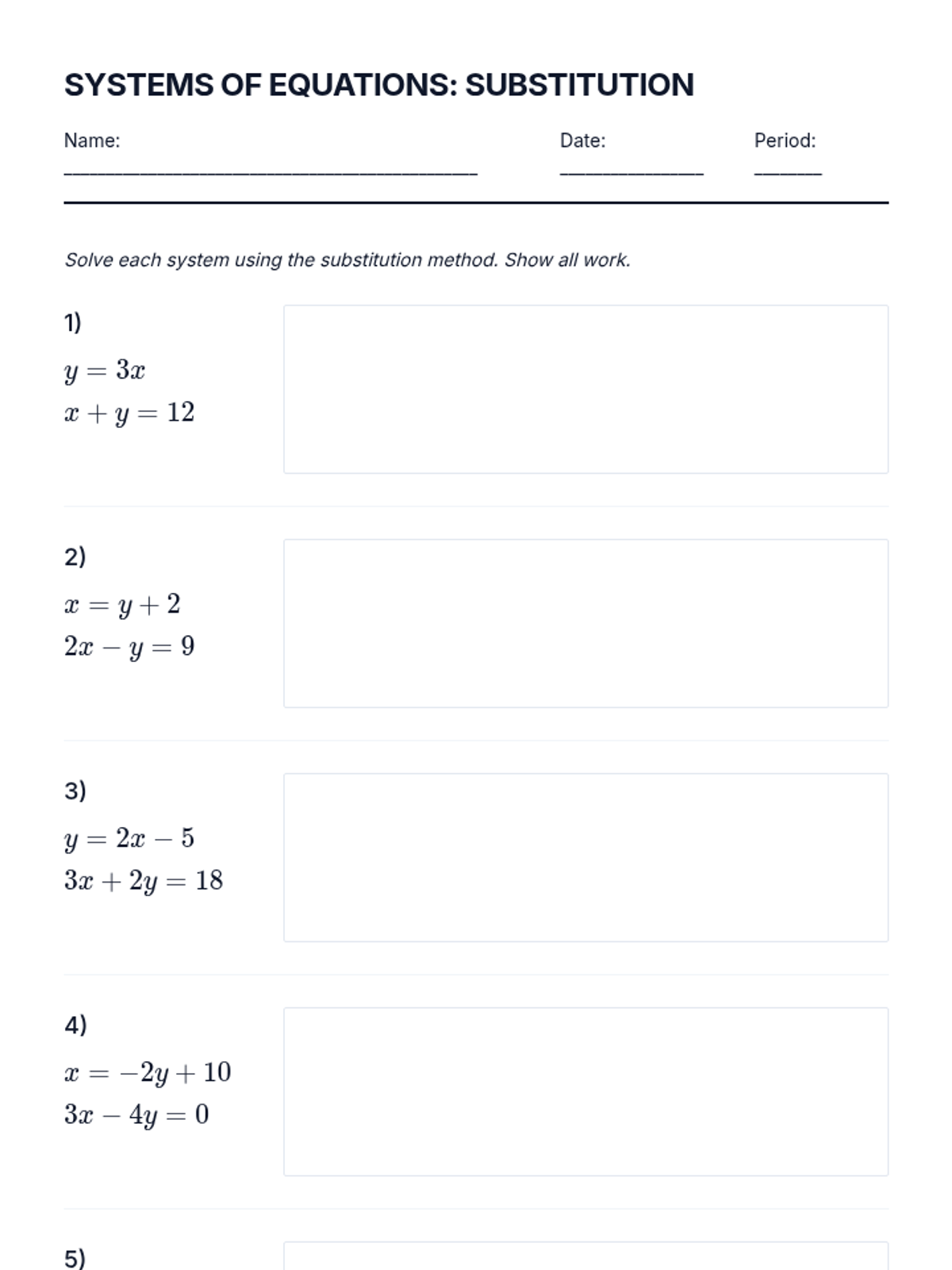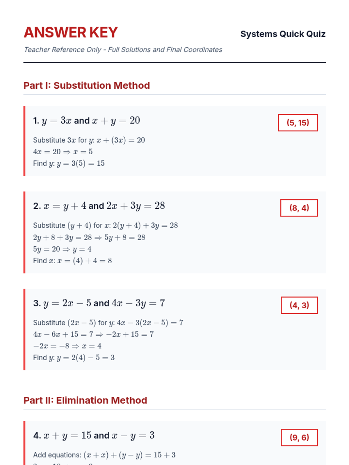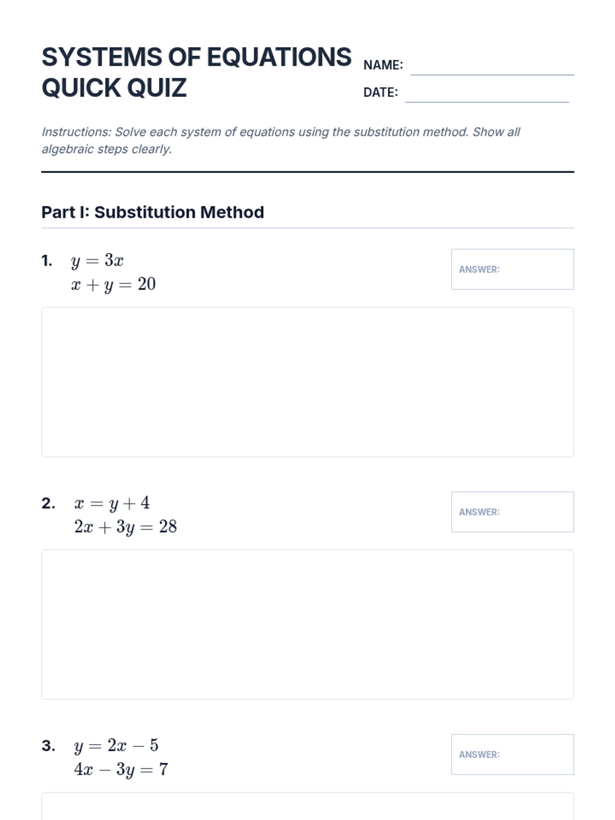 A focused quiz assessing student proficiency in solving systems of linear equations using both substitution and elimination methods.