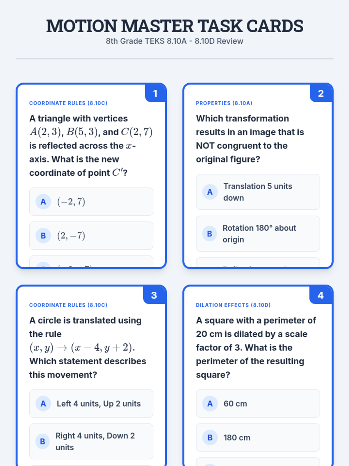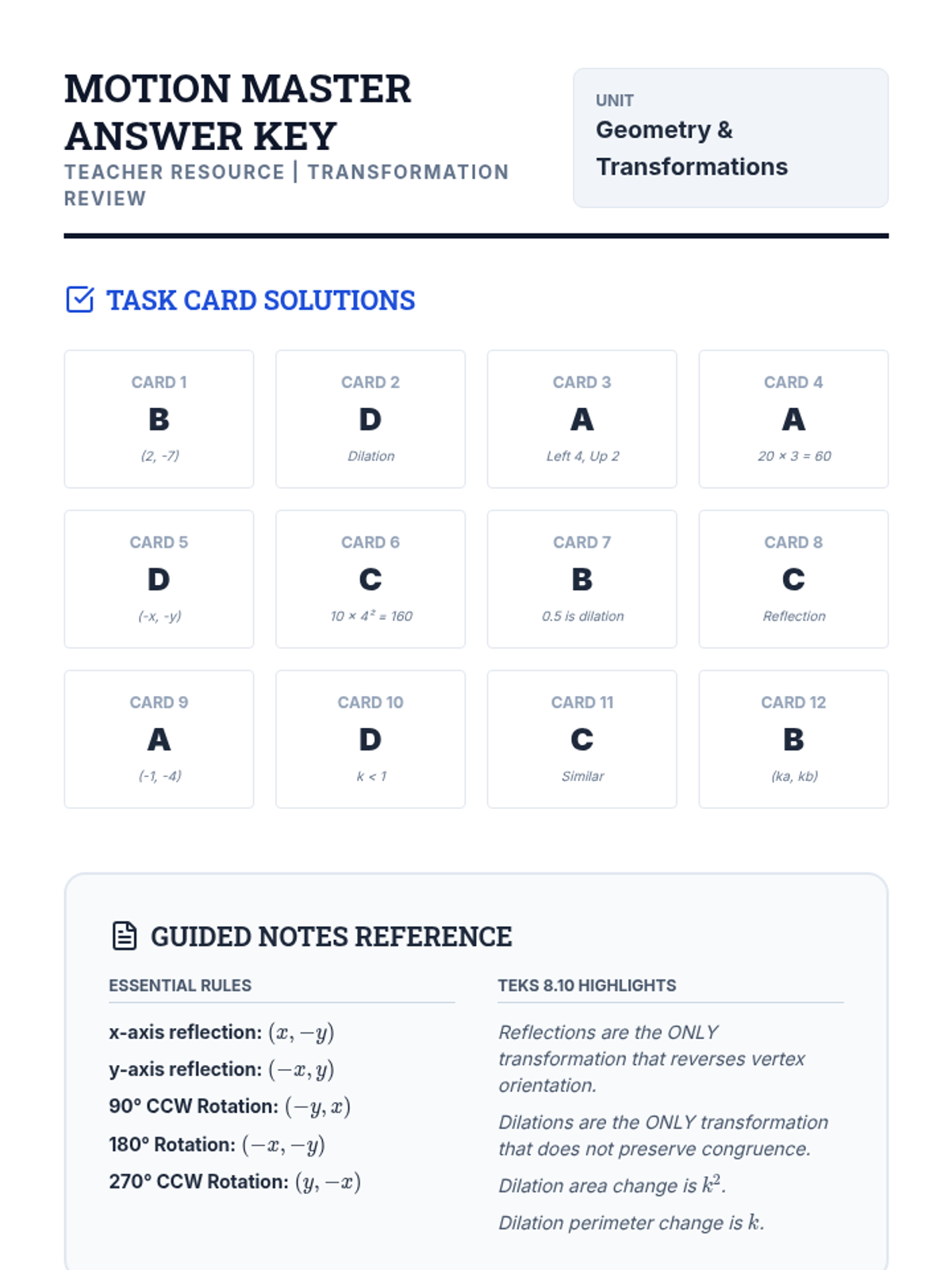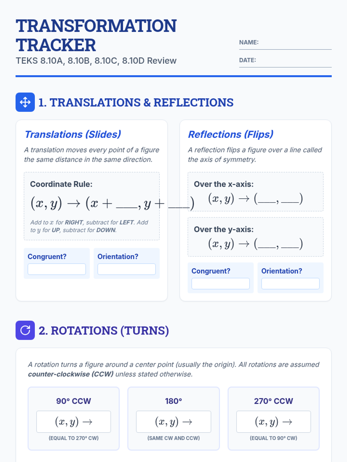 A comprehensive review of geometric transformations including translations, reflections, rotations, and dilations, focusing on coordinate rules and algebraic representations.