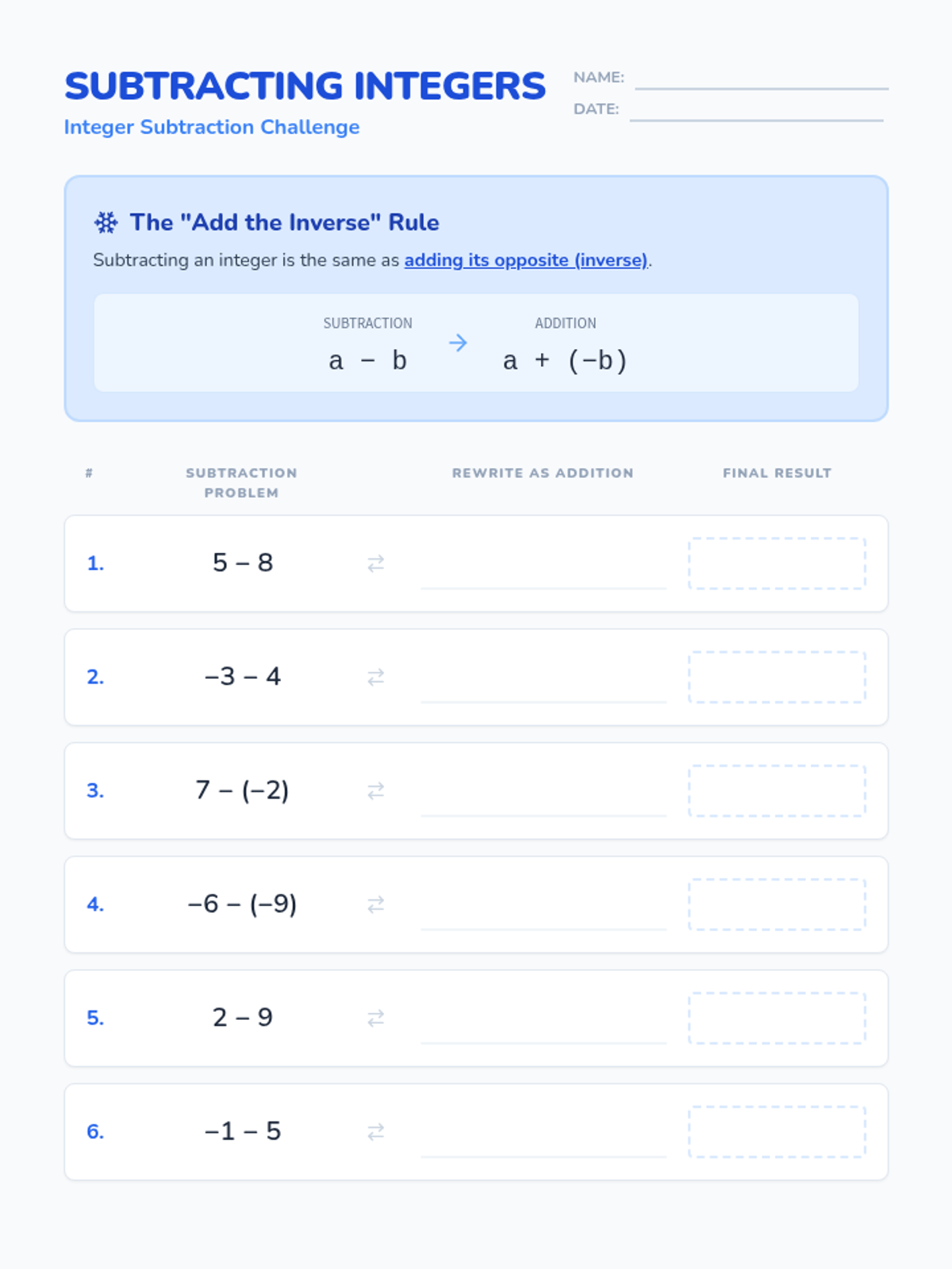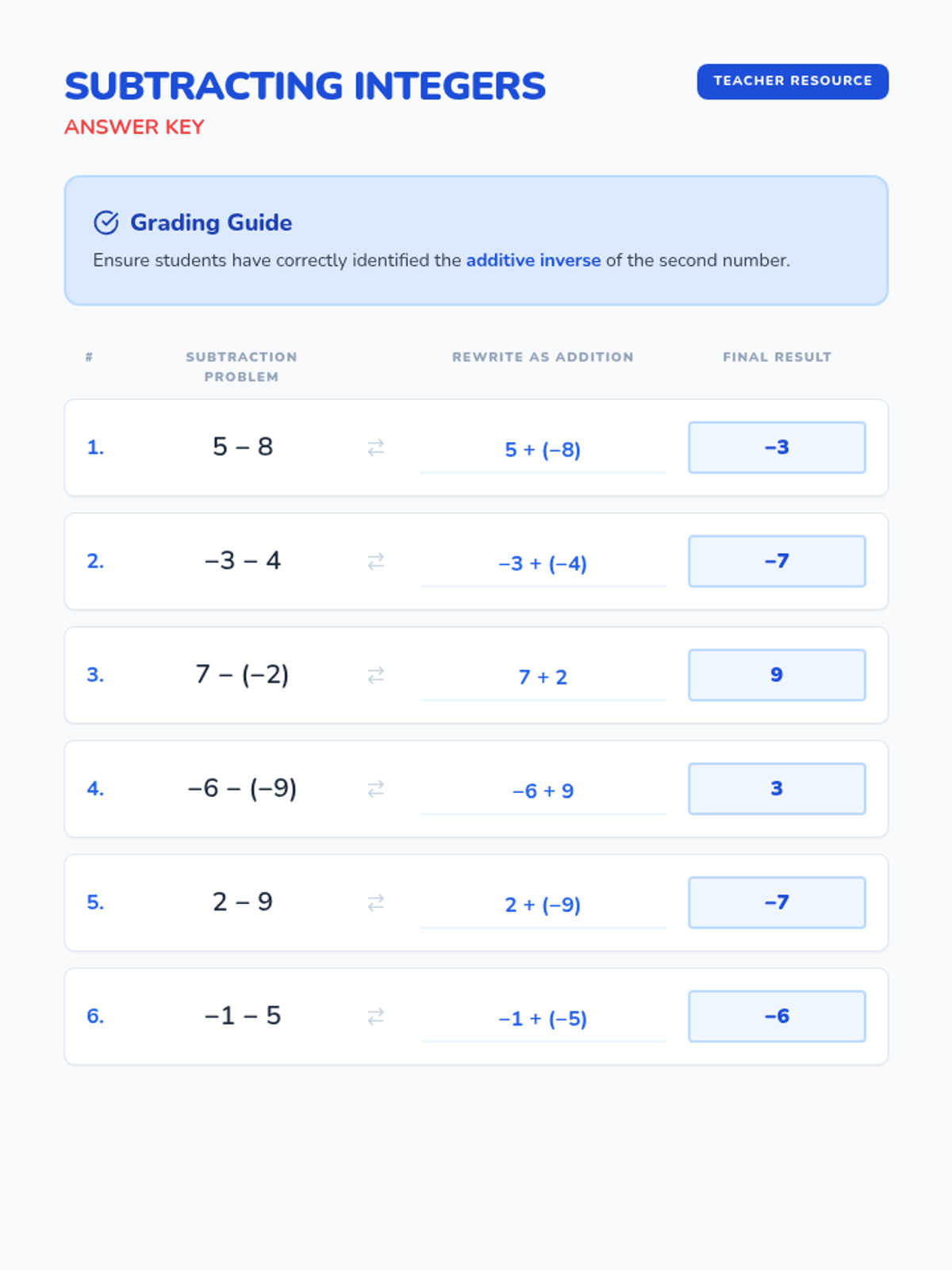A lesson focused on subtracting integers by rewriting them as addition of the inverse. Students practice with single-digit integers to build foundational fluency.