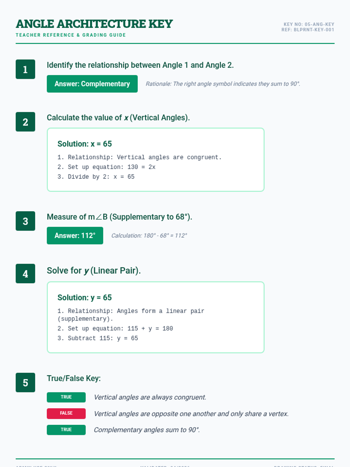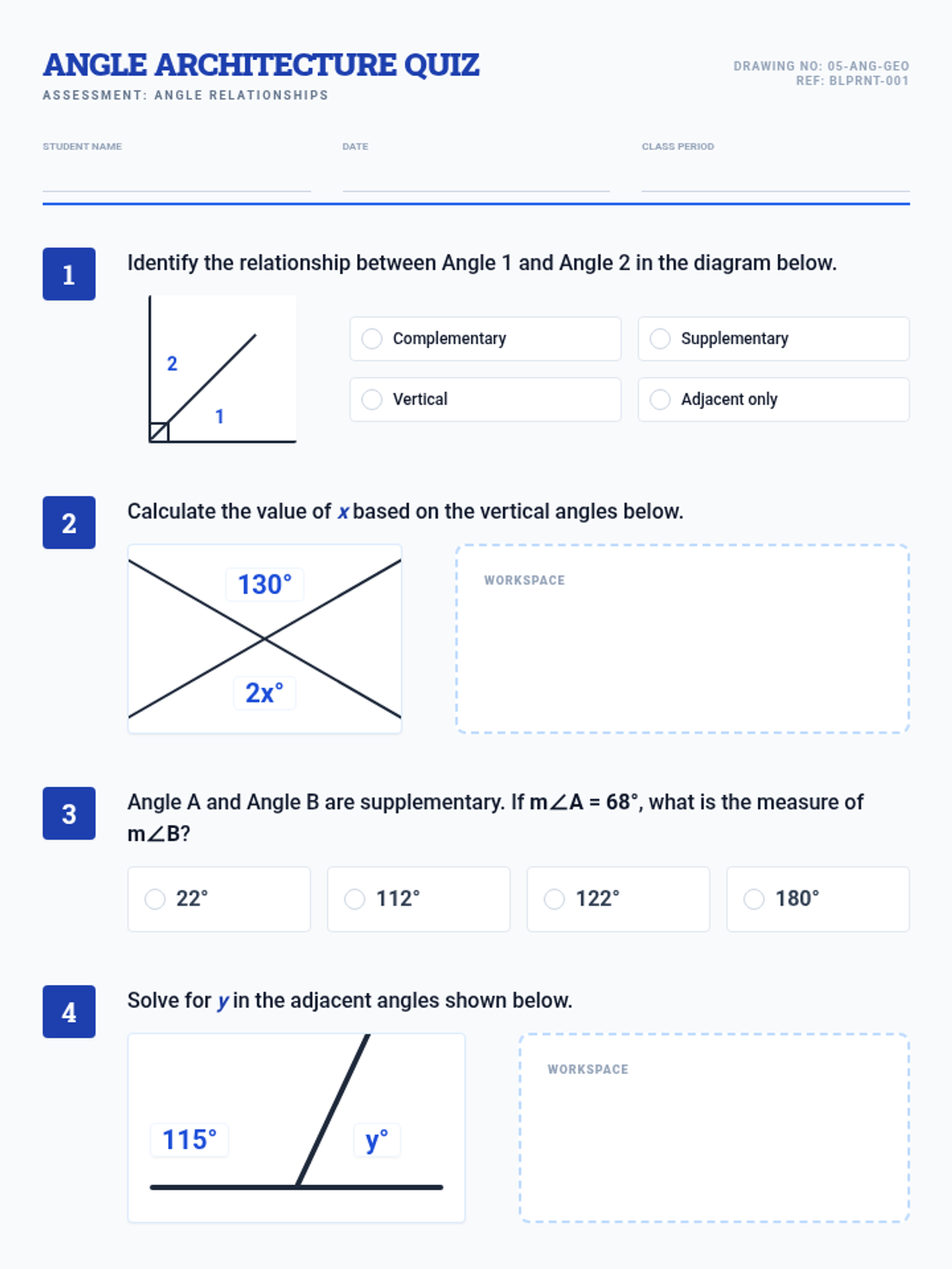 A focused assessment on identifying and calculating angle relationships including complementary, supplementary, adjacent, and vertical angles.