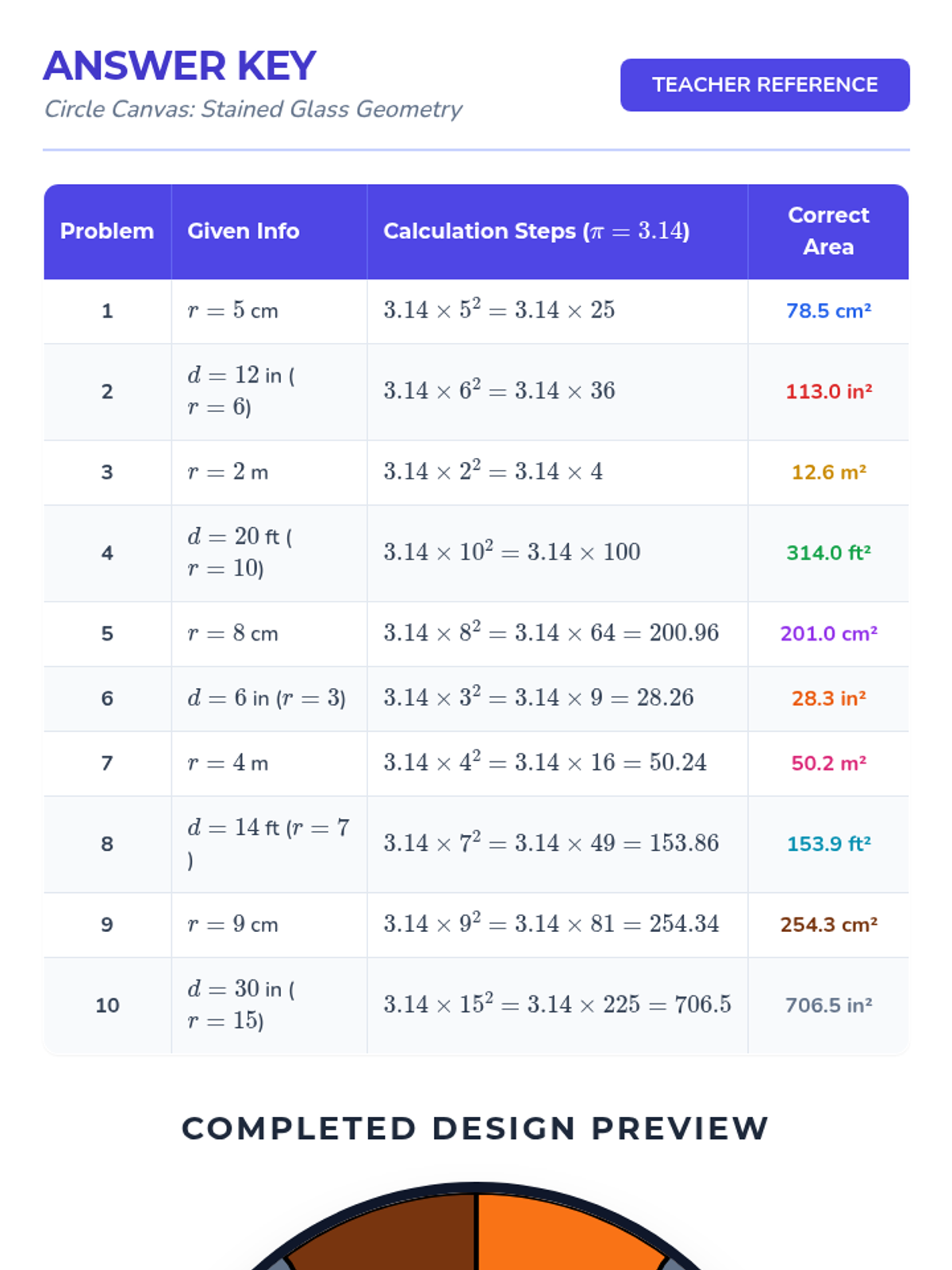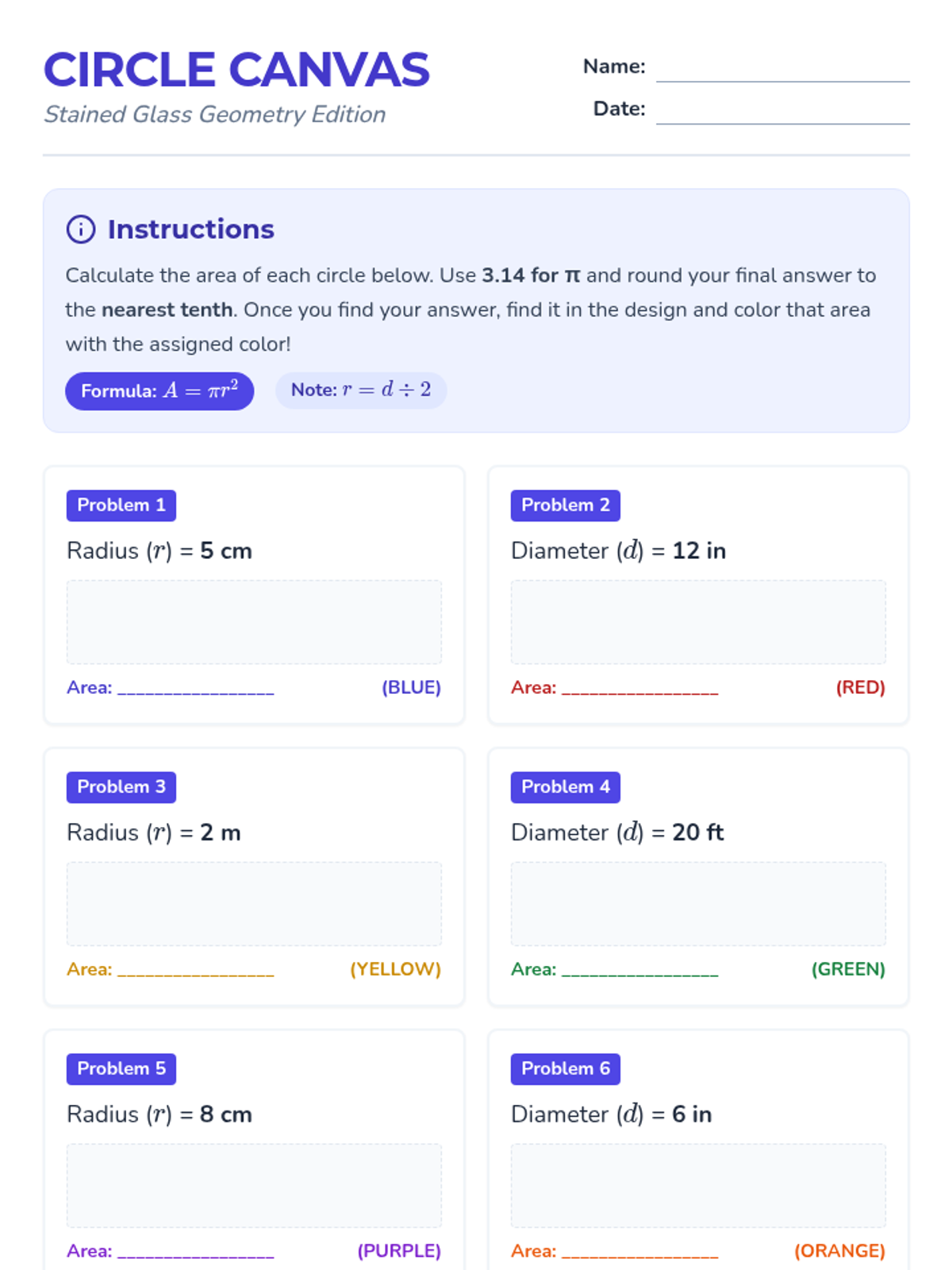 A creative math lesson focused on calculating the area of circles using radius and diameter, featuring a coloring art activity to reinforce learning.