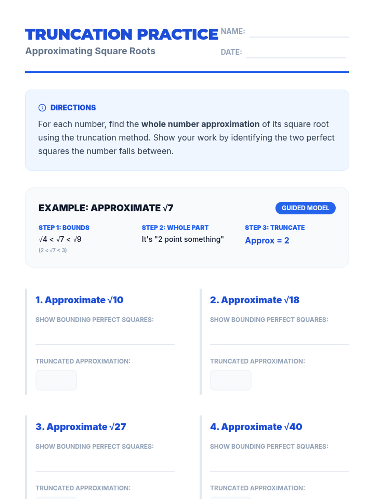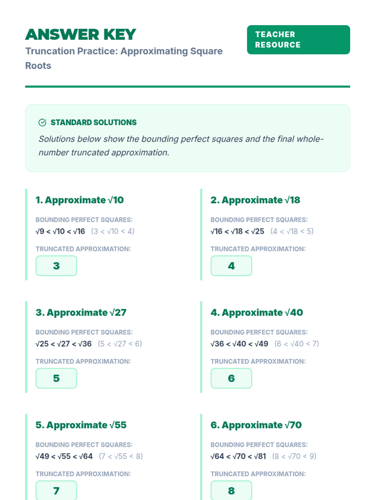 An introductory lesson for 8th-grade learners on approximating square roots using the truncation method, focusing on identifying bounding perfect squares.