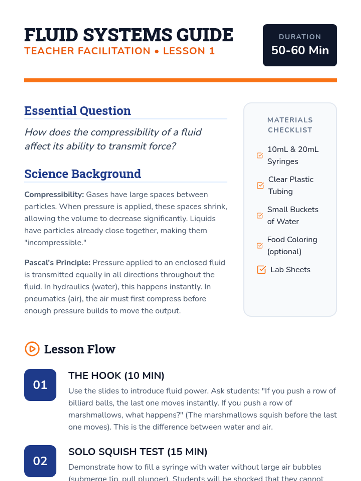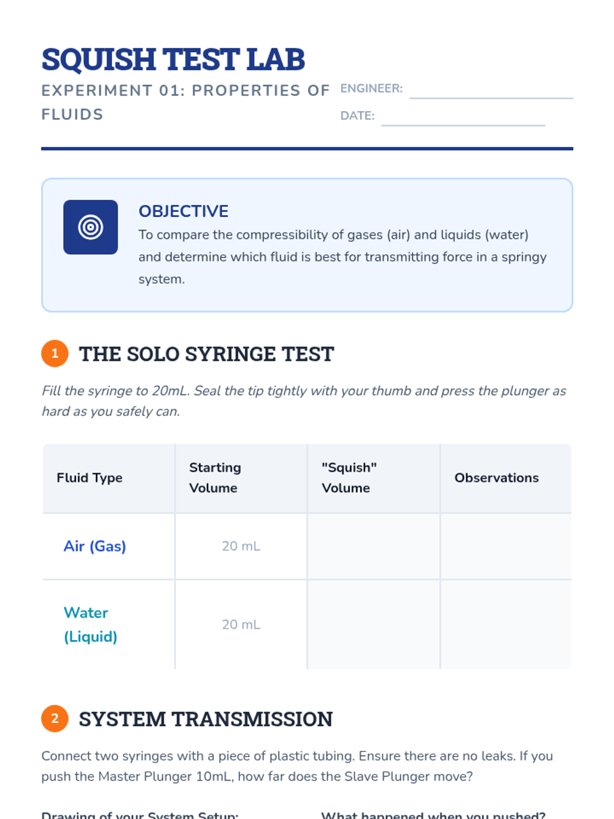 Students compare hydraulic (water) and pneumatic (air) systems using connected syringes to discover the property of compressibility in gases.