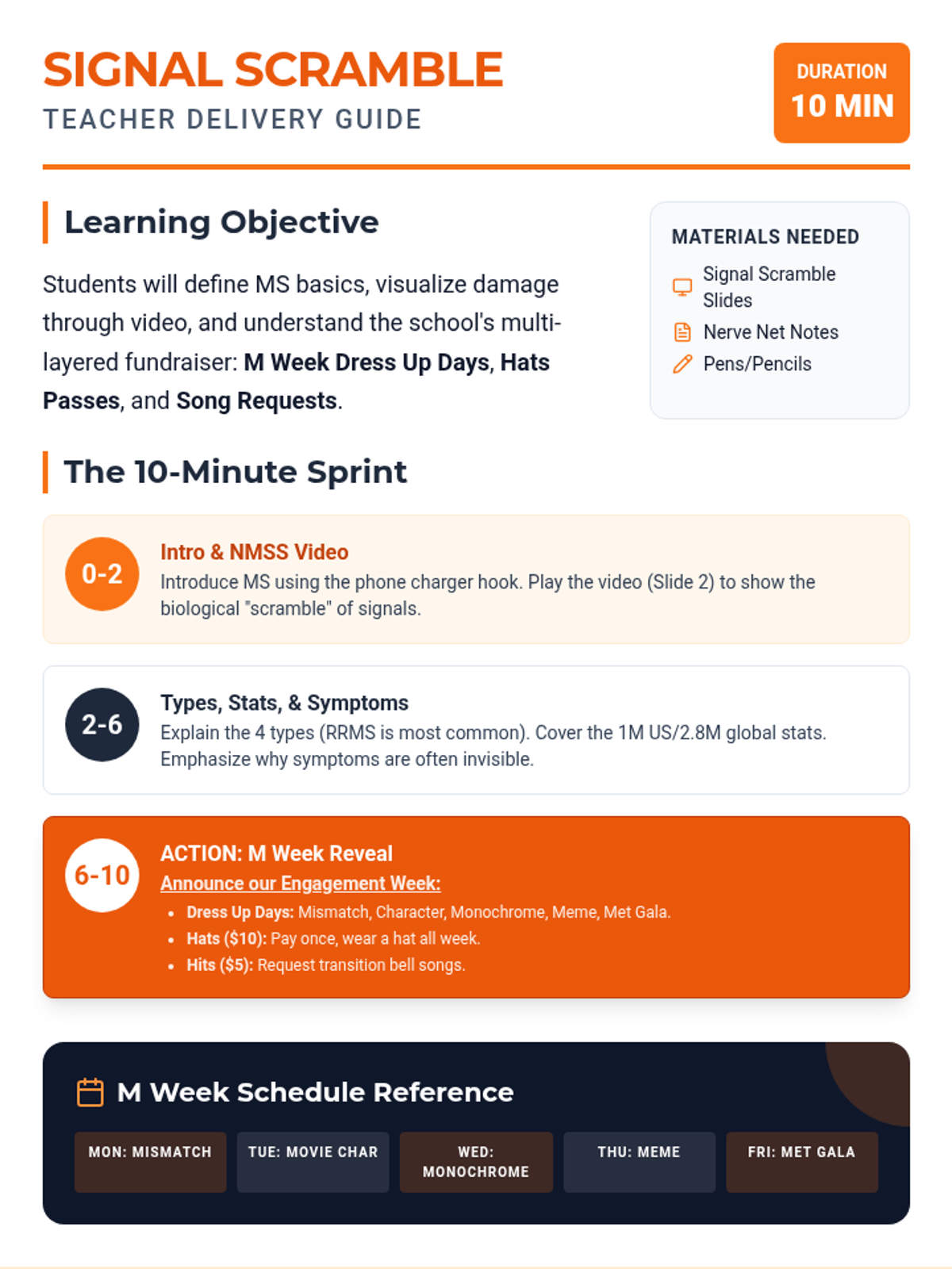 A quick, high-impact lesson designed to teach middle schoolers about Multiple Sclerosis through the lens of a 'signal scramble' in the nervous system. Students learn about myelin, global statistics, and the invisible nature of the disease.