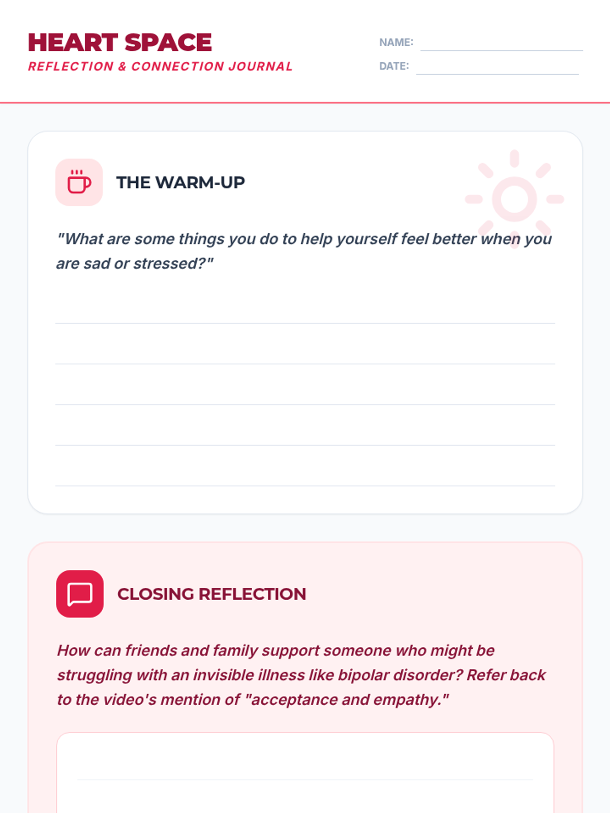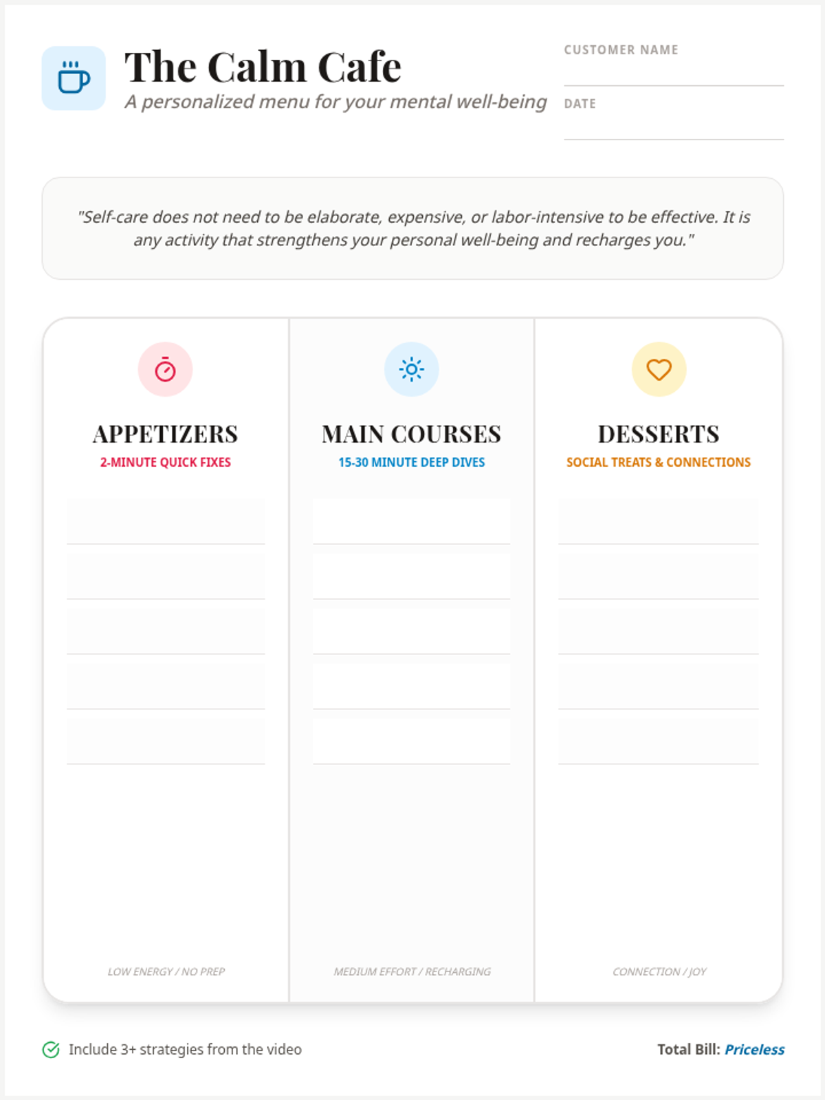 A lesson focused on identifying stressors and building a personalized self-care menu using evidence-based strategies from a health and wellness video. Students learn that self-care is an accessible, vital practice for mental health.