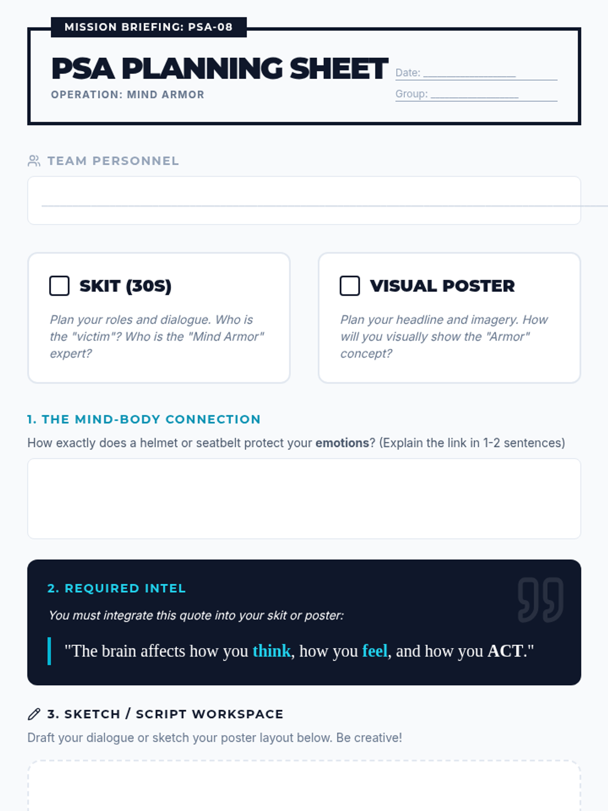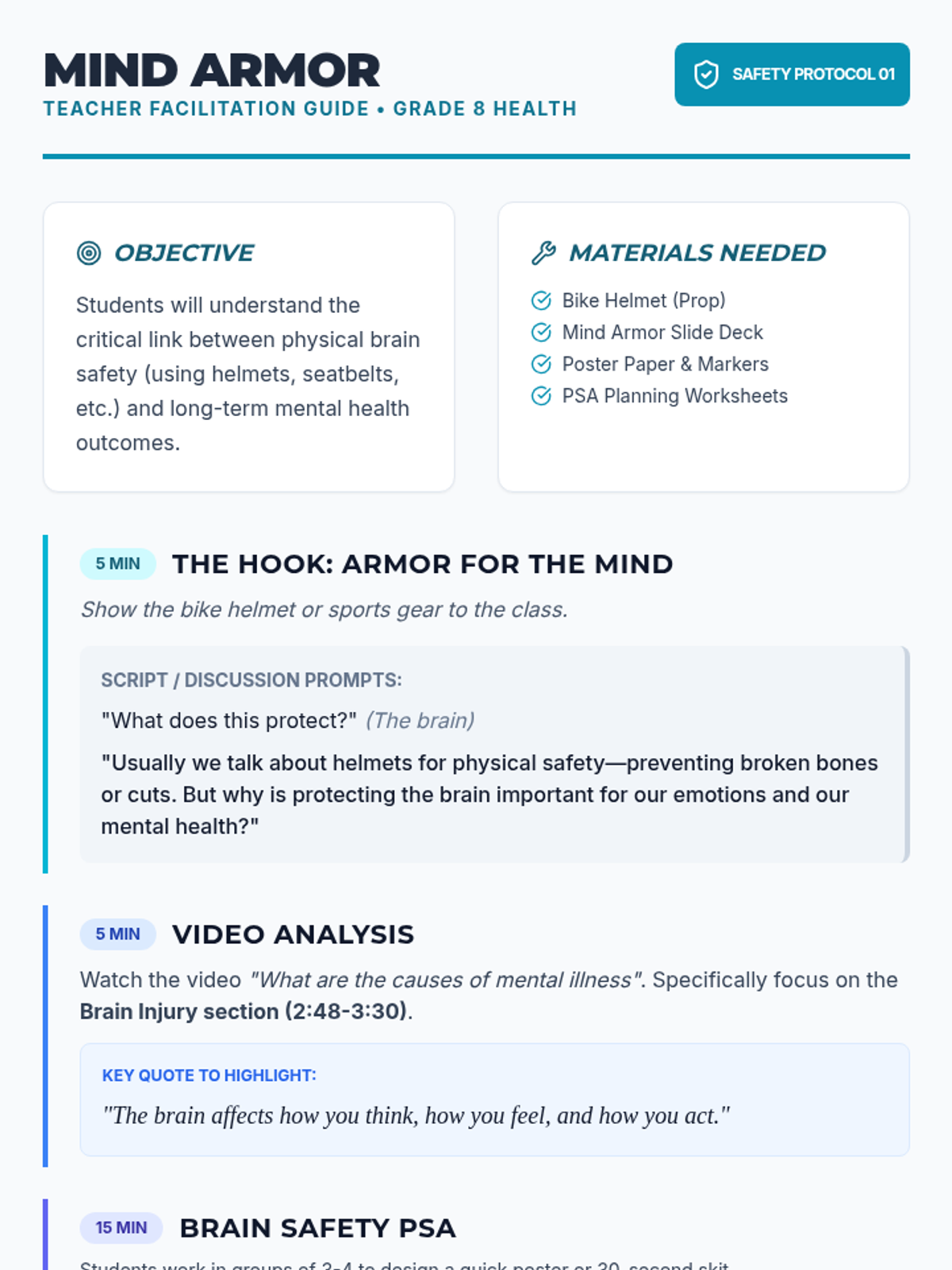 A lesson connecting physical safety and traumatic brain injury (TBI) to mental health, featuring a PSA activity and video analysis.