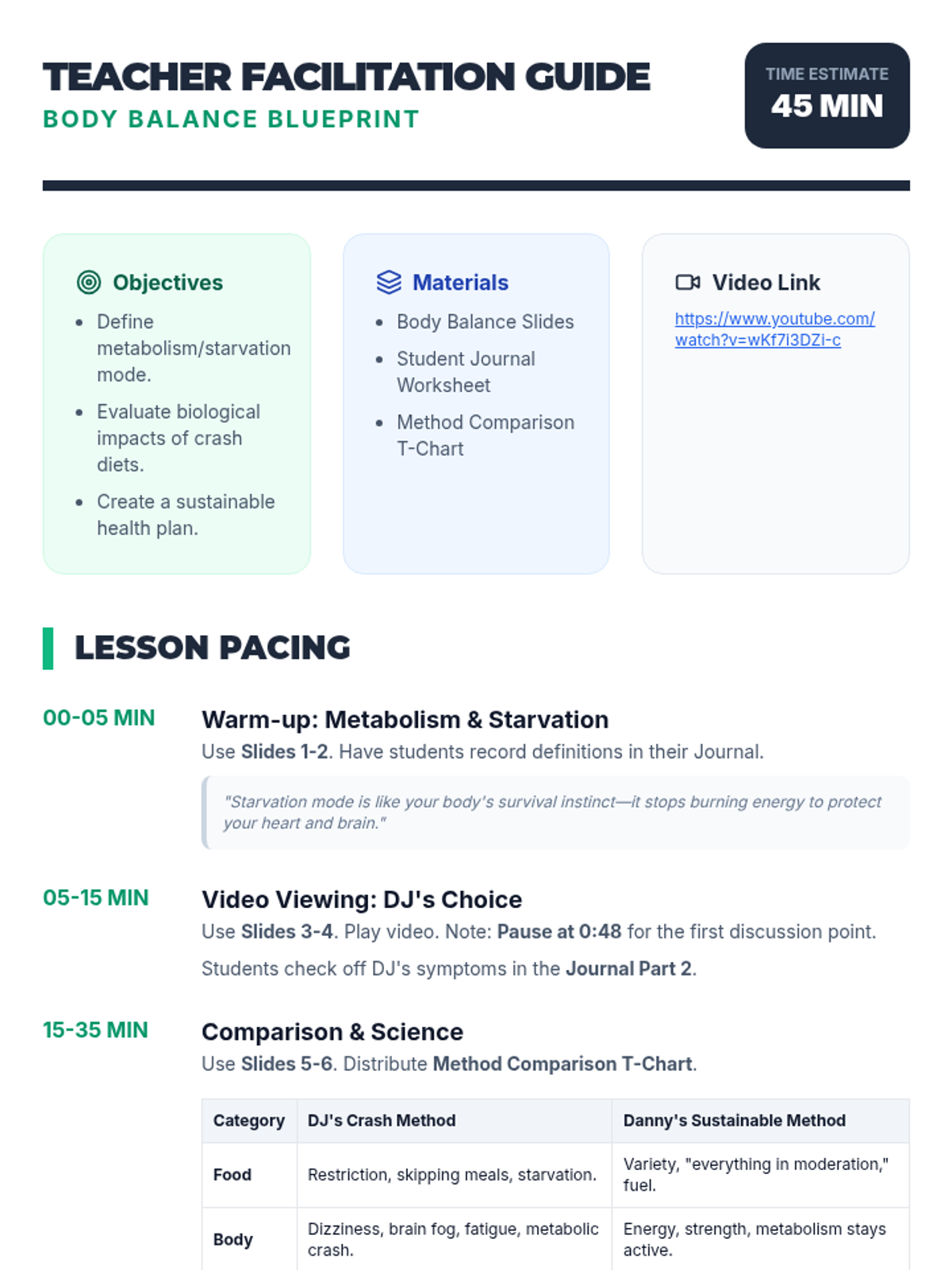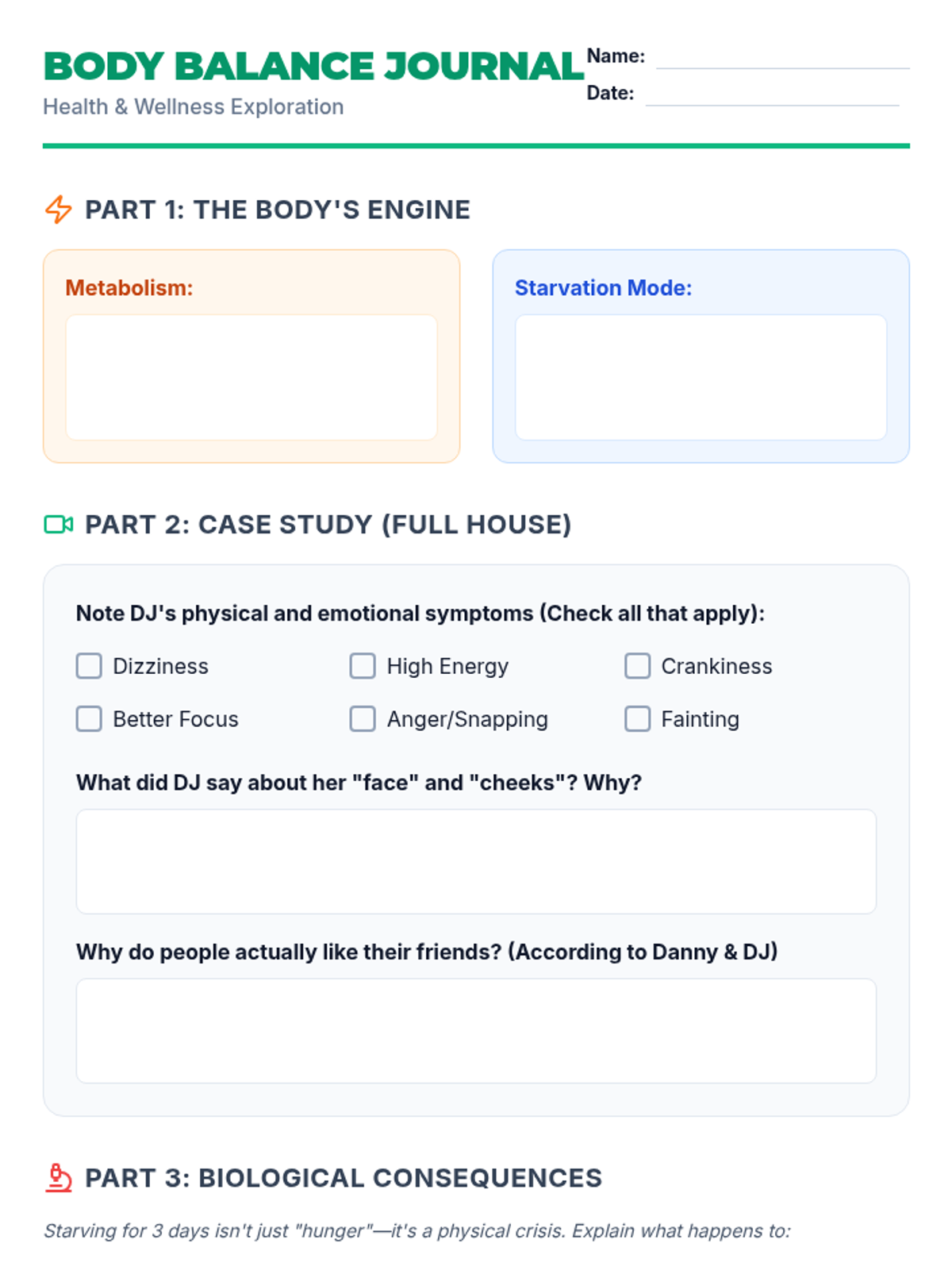 A comprehensive health lesson for middle school students exploring the biological and psychological dangers of crash dieting versus sustainable health, centered around a classic Full House video clip.
