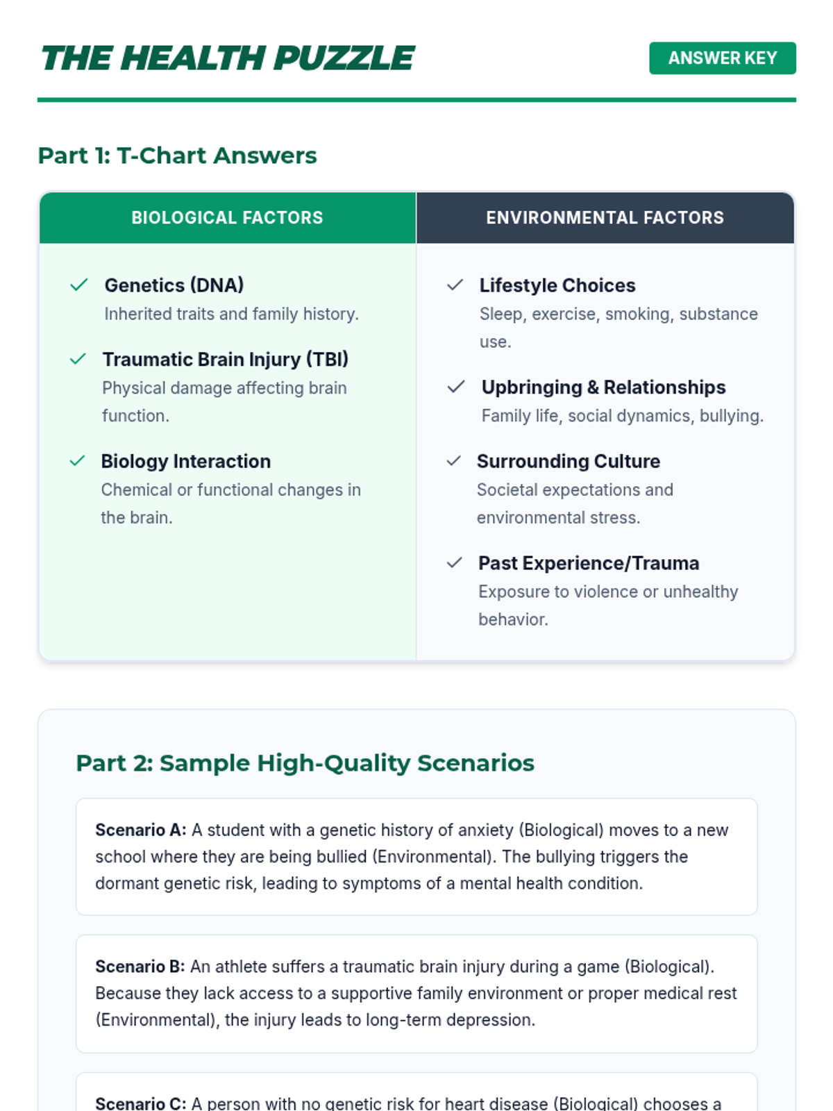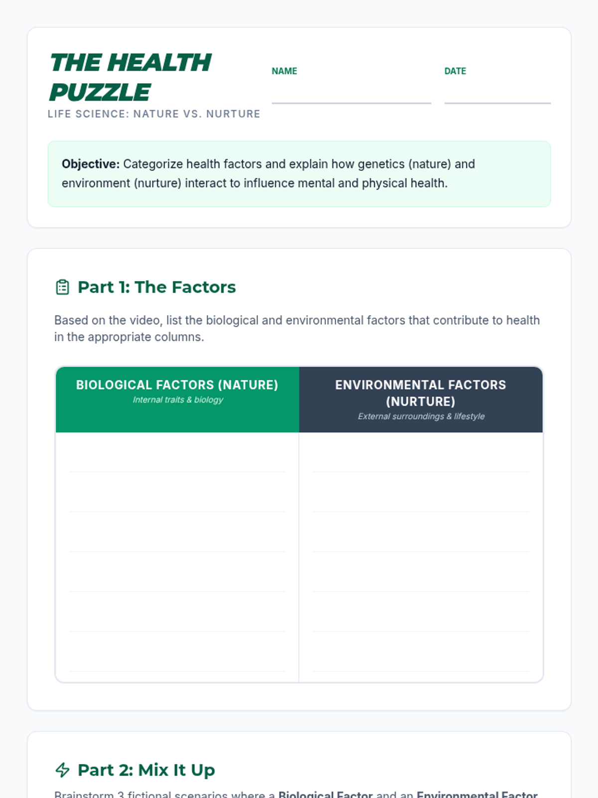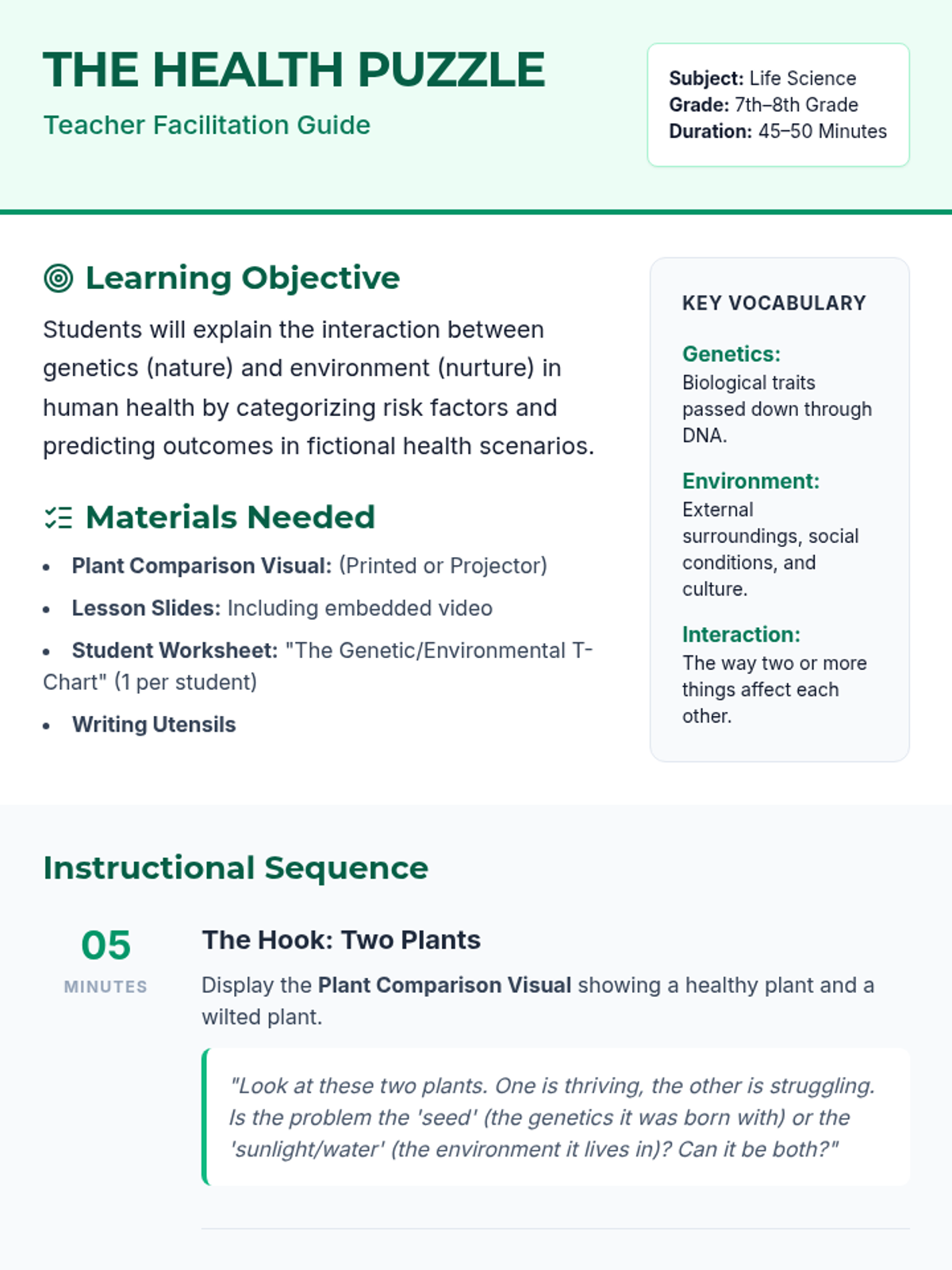A lesson exploring the complex interplay between genetic blueprints and environmental influences on human health, specifically focusing on mental health as a case study. Students use a video-based T-chart and scenario brainstorming to understand how nature and nurture interact.