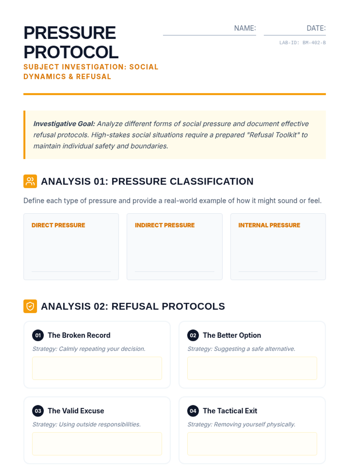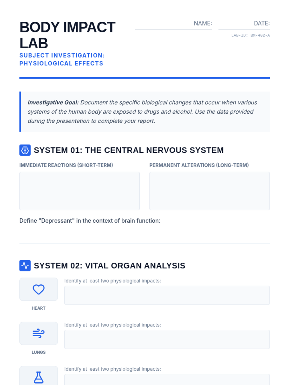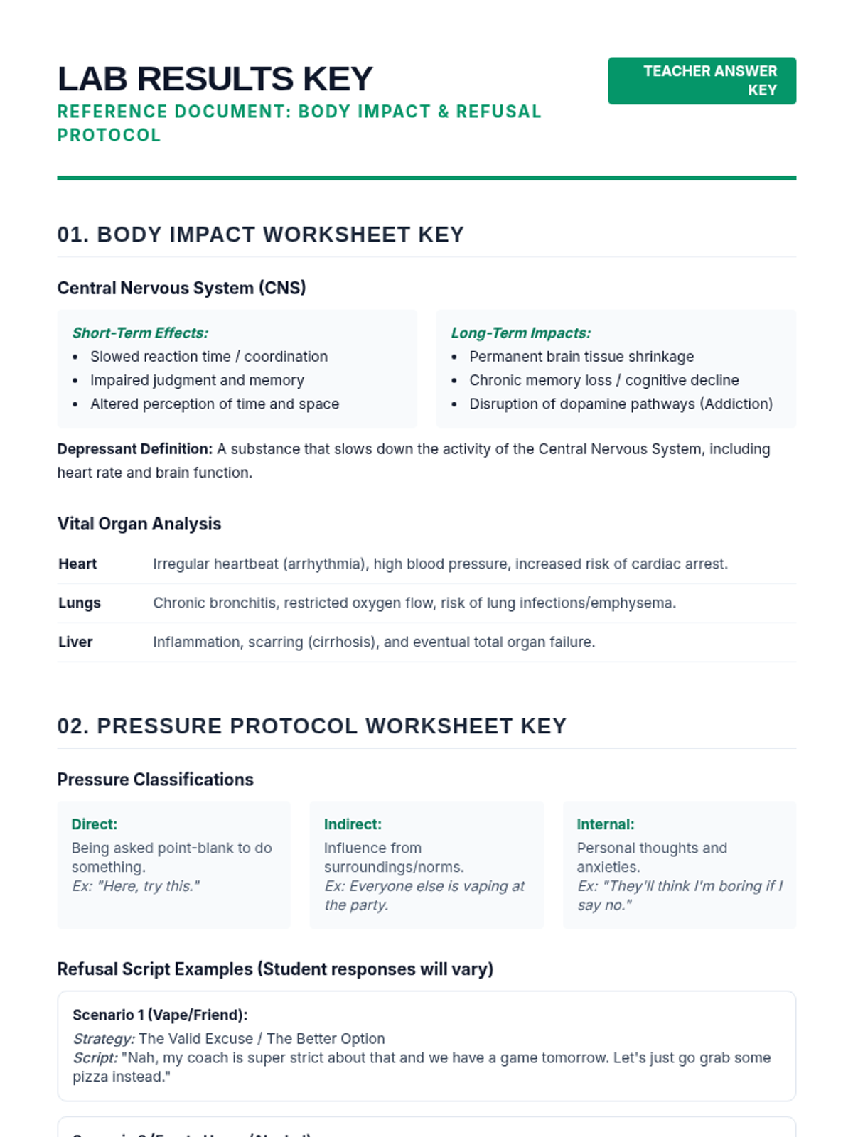 This lesson explores the physiological effects of drugs and alcohol on the body and equips students with practical refusal strategies for peer pressure through a lab-themed investigation.
