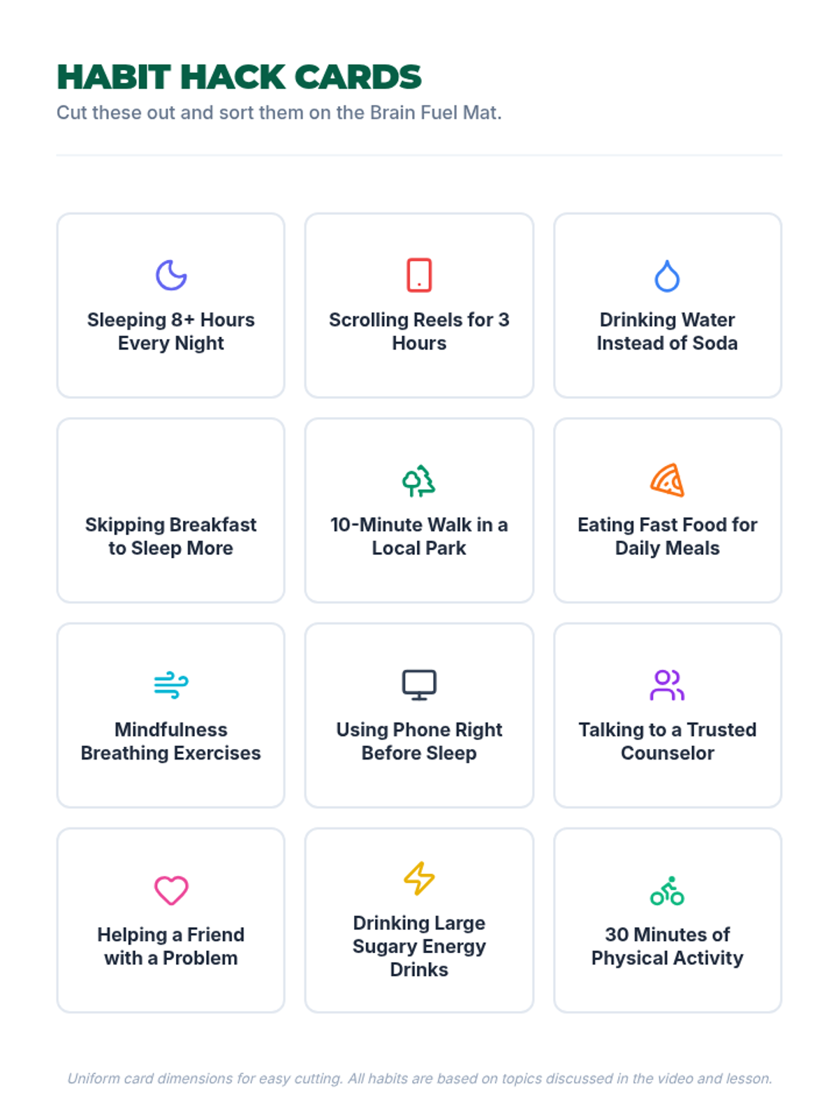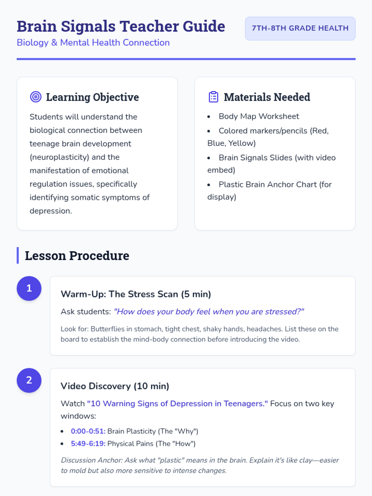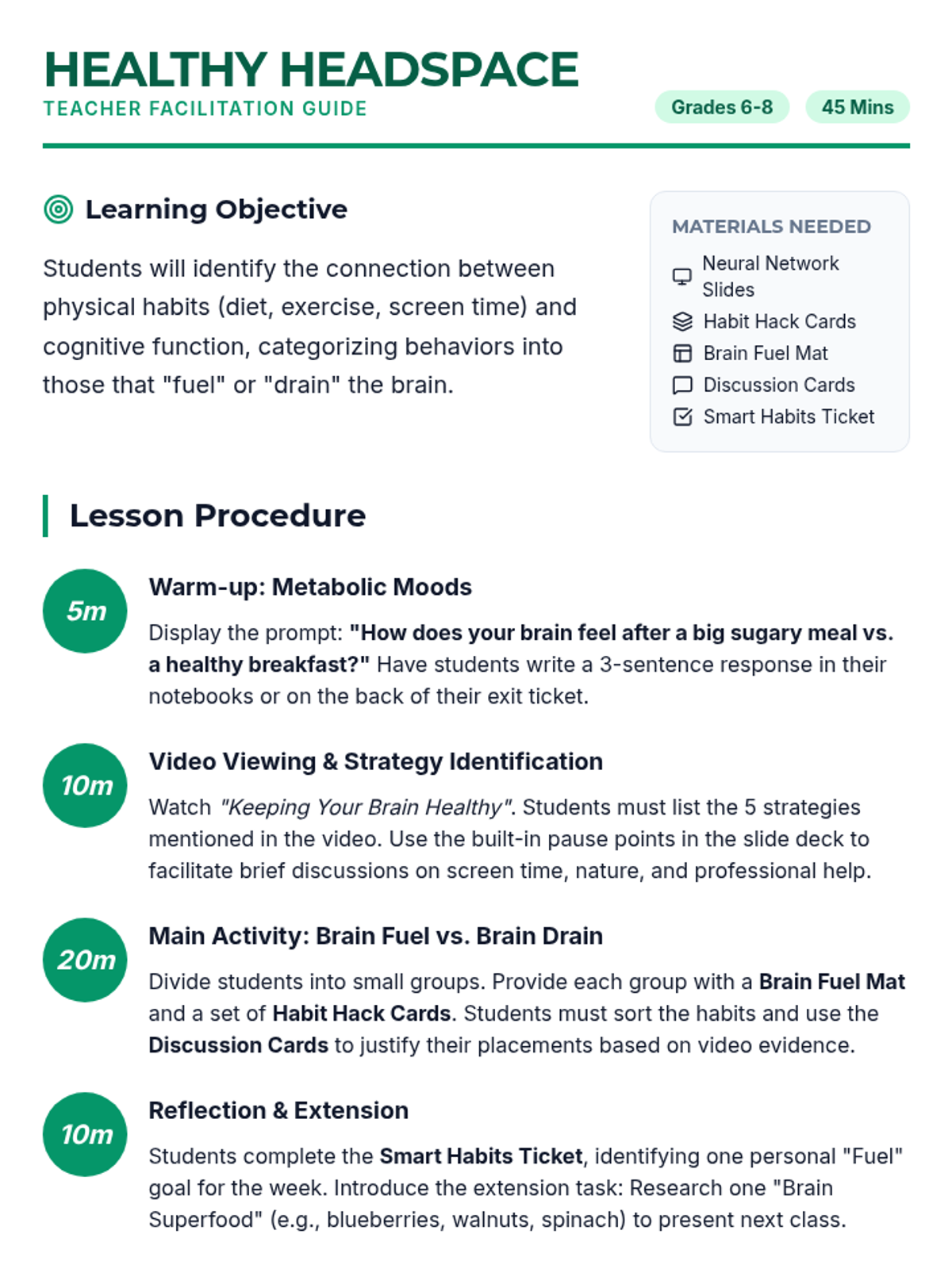 This lesson explores the biological and psychological links between daily habits—such as diet, exercise, and screen time—and brain function. Students will watch a video on brain health, categorize habits into 'Brain Fuel' or 'Brain Drain,' and set a personal goal for the week.