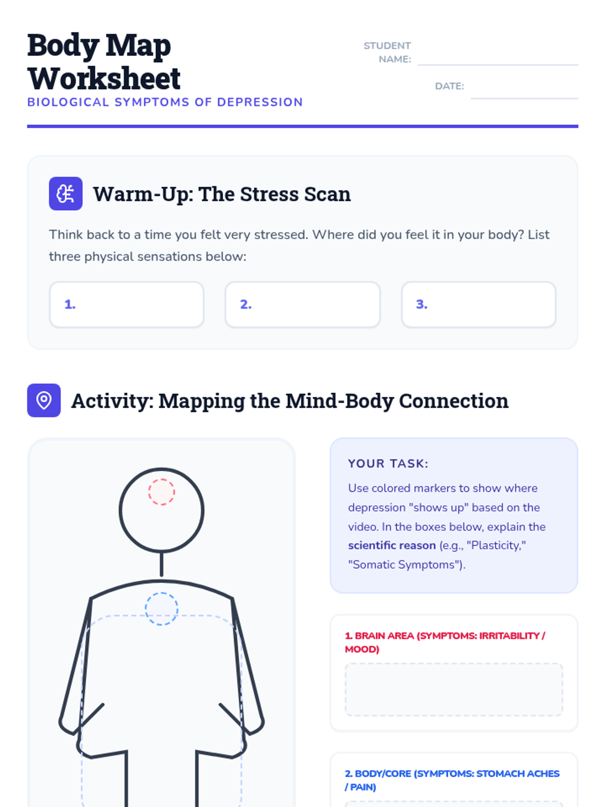 A lesson exploring the biological link between adolescent brain development (plasticity) and how emotional distress like depression manifests as physical and behavioral symptoms. Students will use body mapping to visualize the mind-body connection.