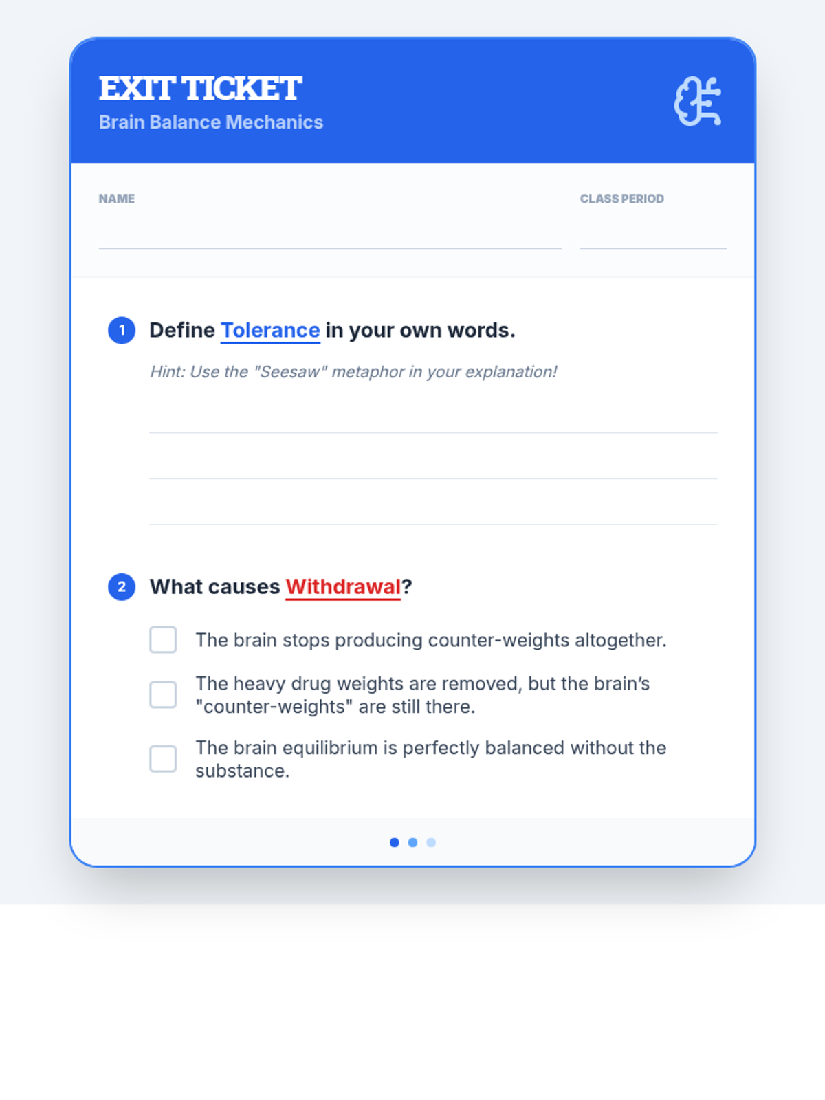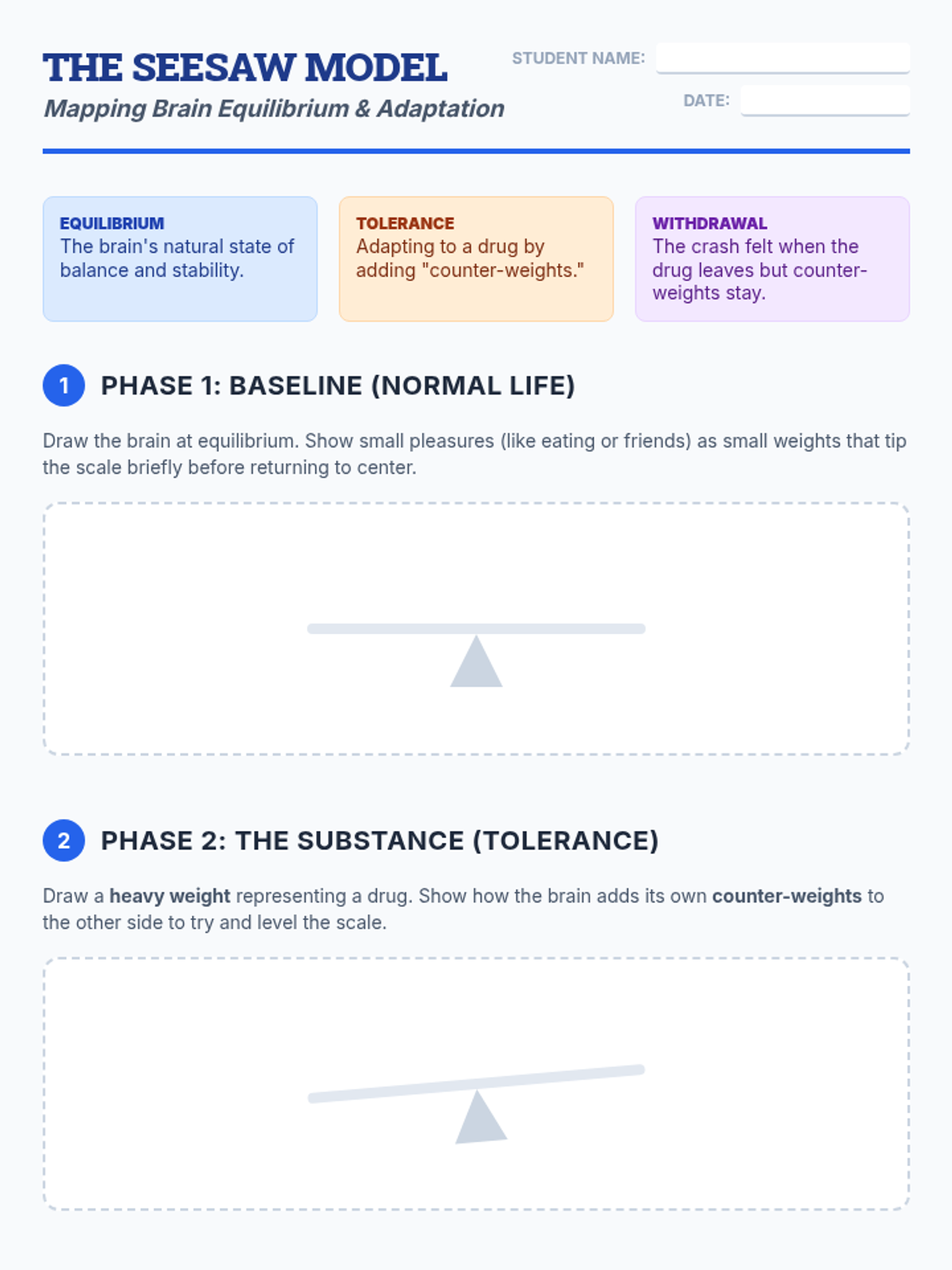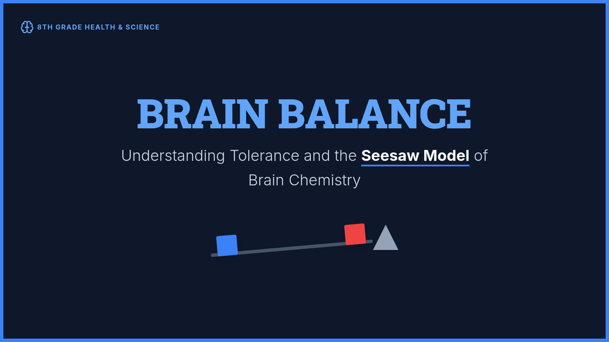A lesson exploring the biological mechanism of tolerance and how the brain adapts to maintain equilibrium (homeostasis) using the 'Seesaw Model'. Students will observe how substances disrupt brain chemistry and how the brain's attempt to restore balance leads to tolerance and withdrawal.