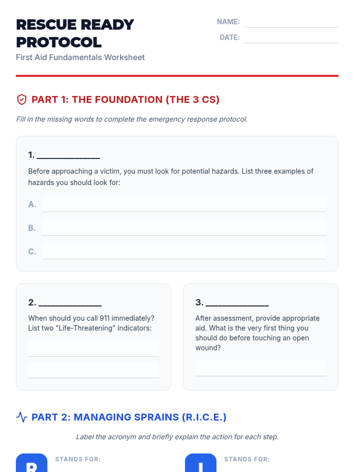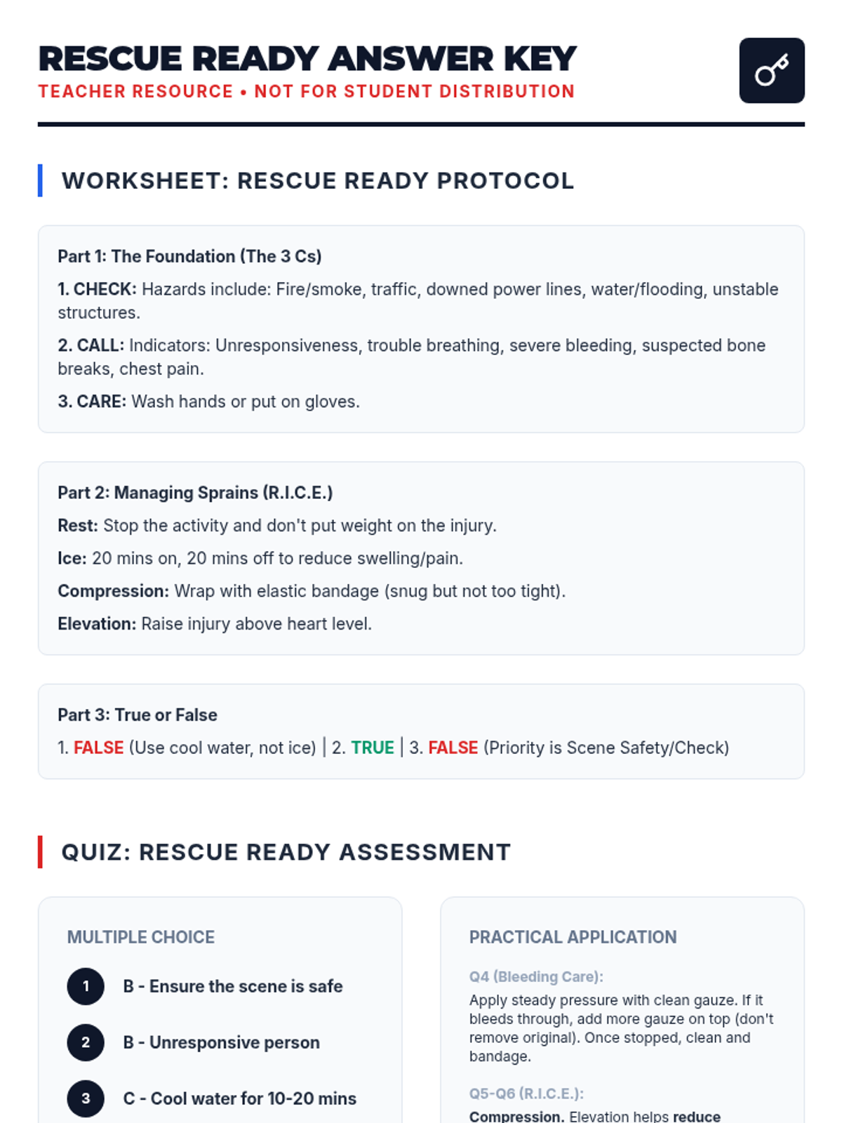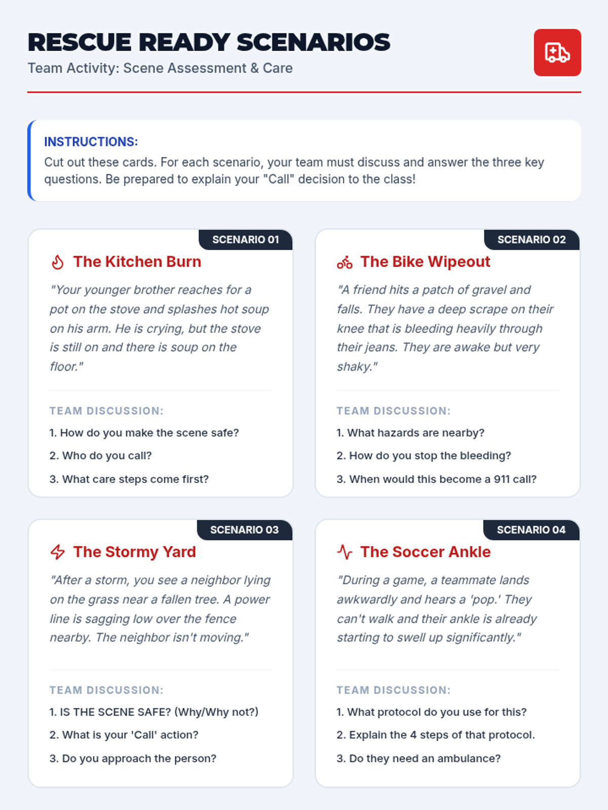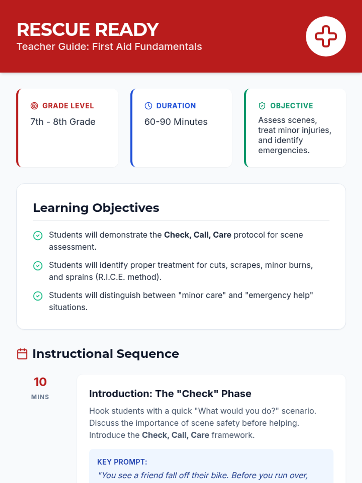 This lesson equips 7th and 8th-grade students with essential first aid knowledge and skills for common injuries, focusing on assessment, basic treatment, and knowing when to call for help through scenario-based learning.